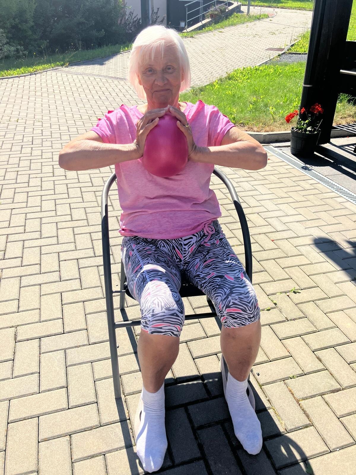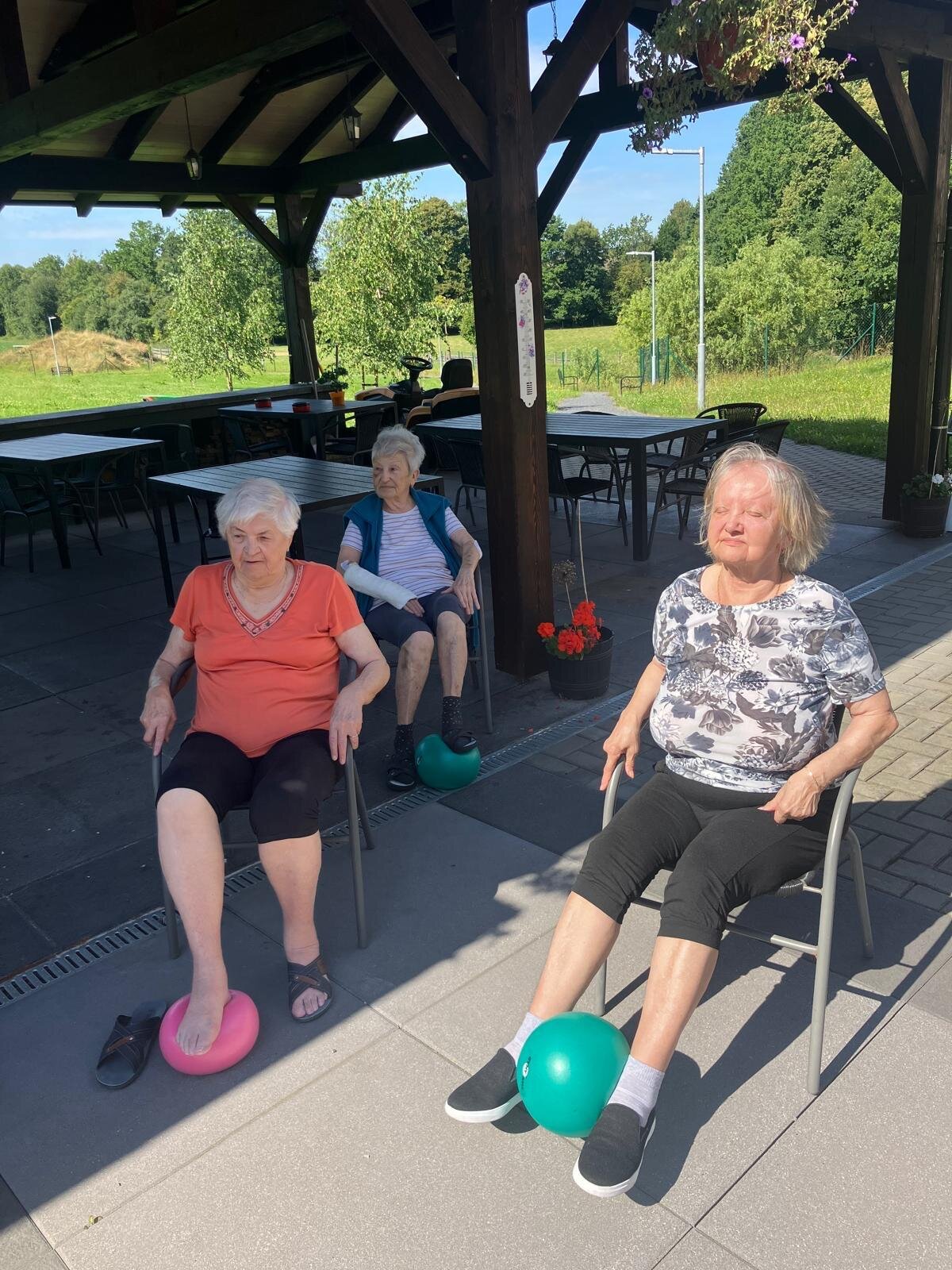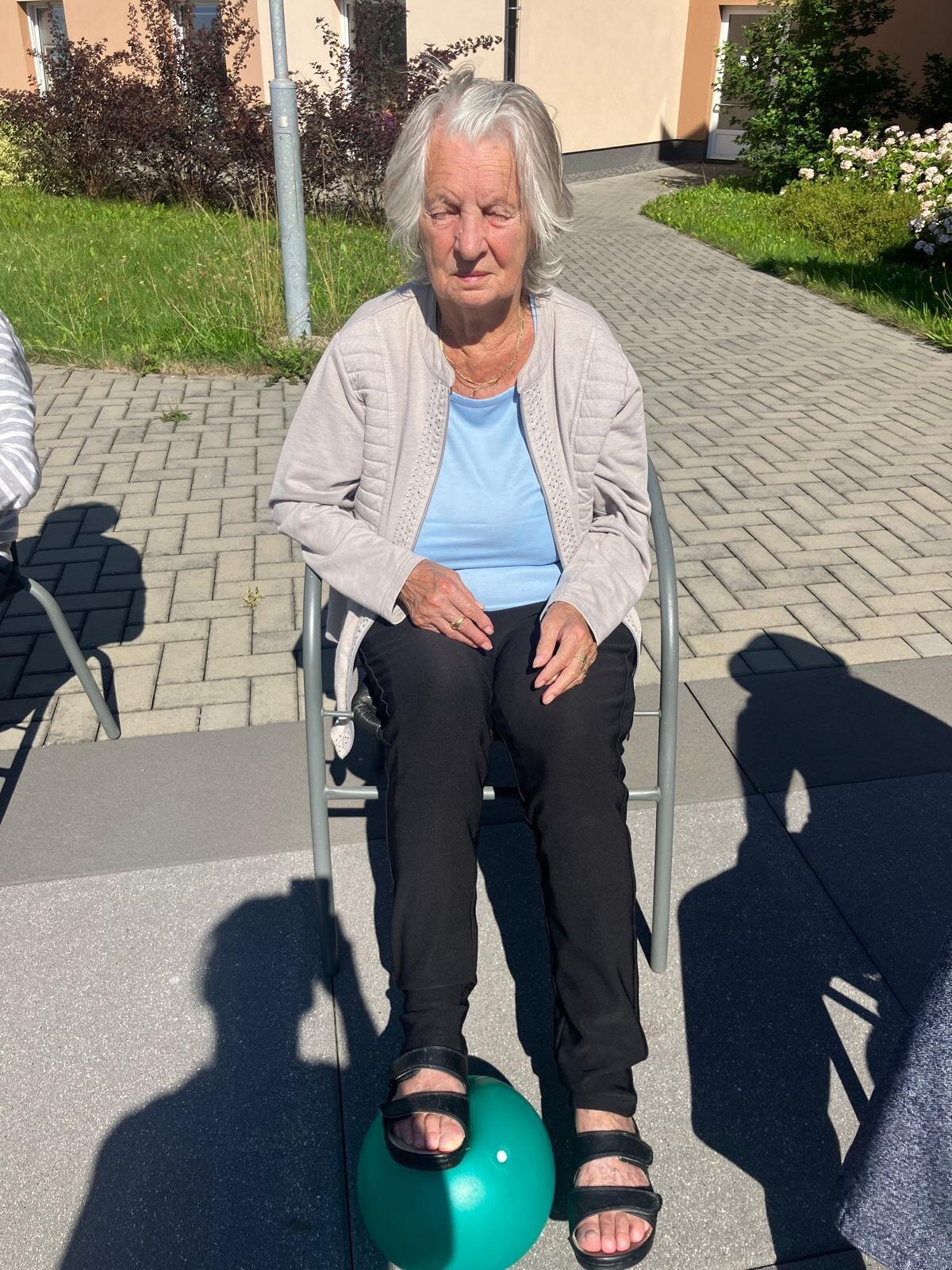 Aby si naši klienti v Senevida Kateřinice udrželi co nejdéle funkční střed těla a schopnost chůze, poctivě posilujeme pomocí overballů. Využíváme krásných slunných dní, a proto většina aktivit nyní probíhá venku na zahradě.🌞