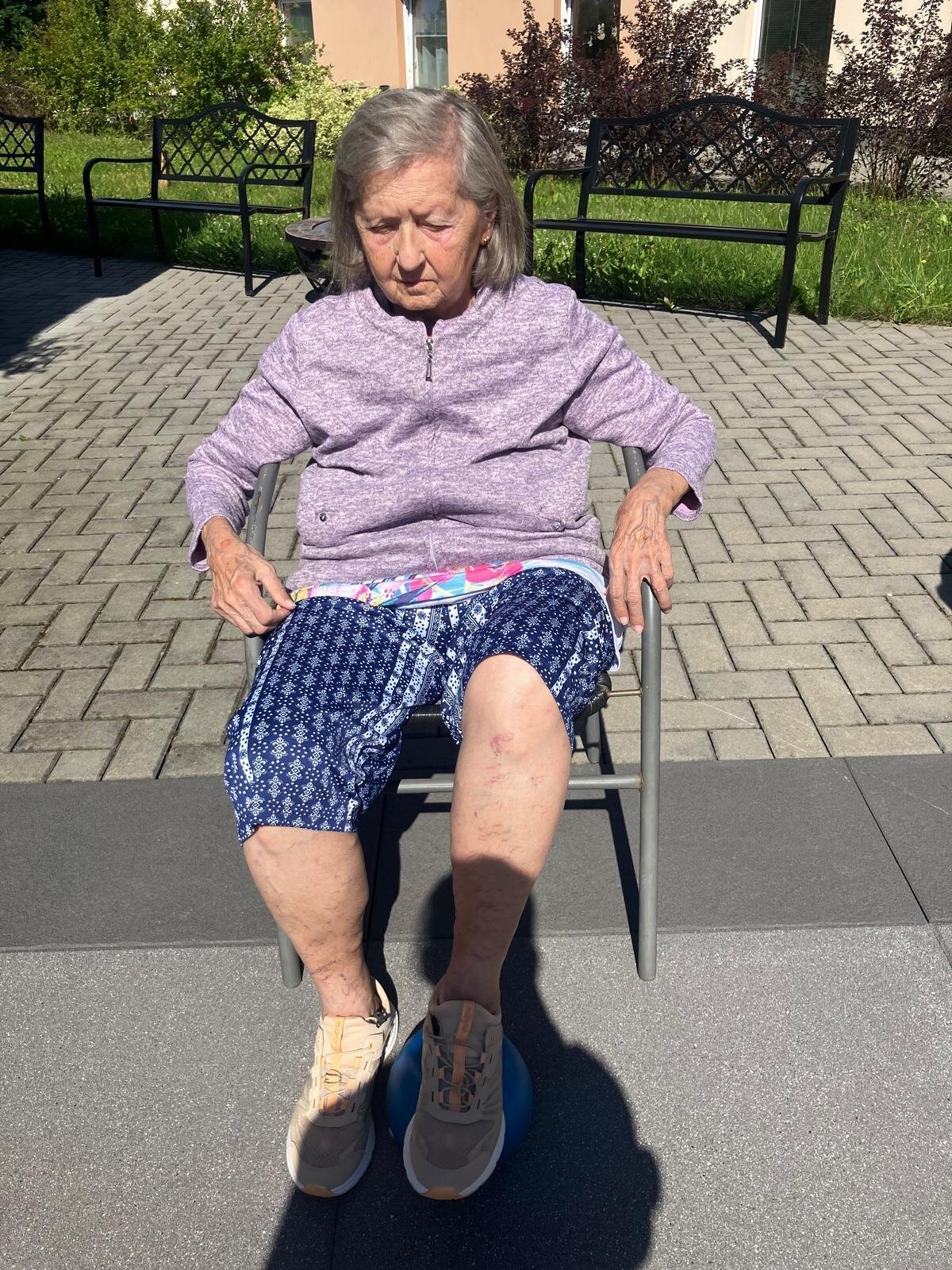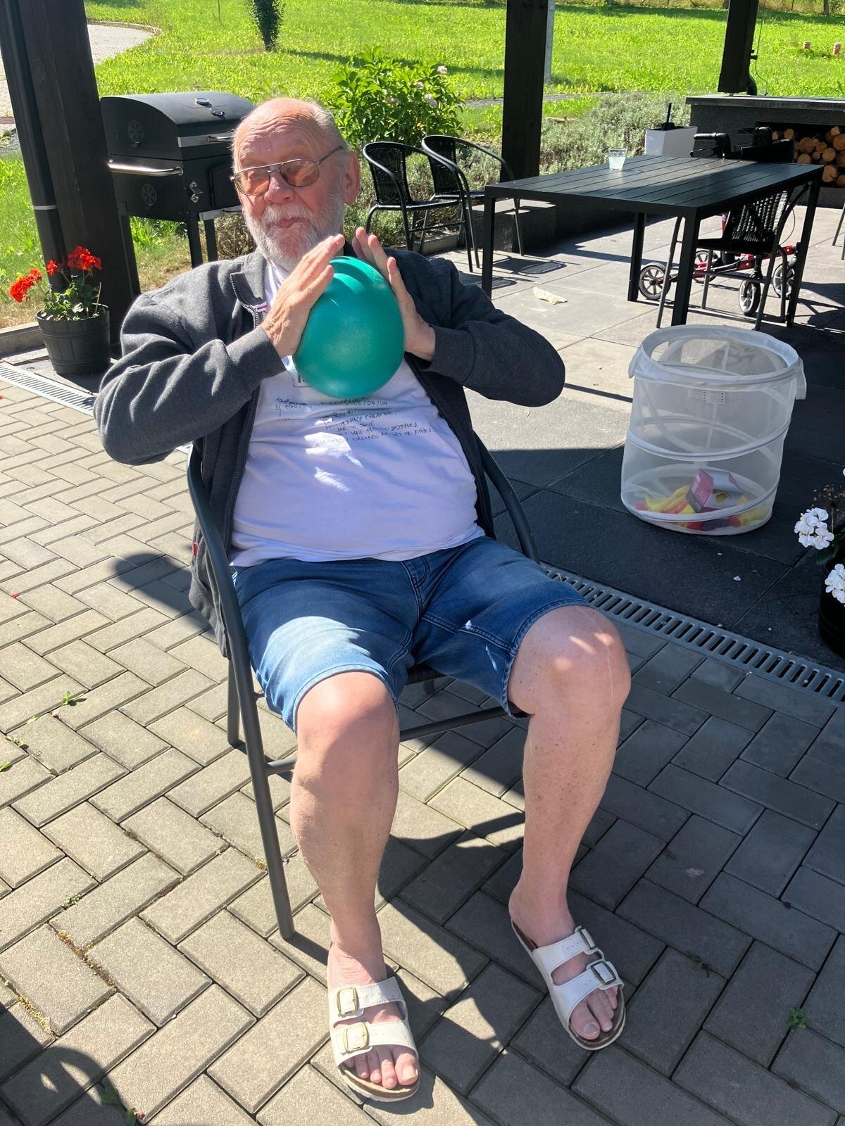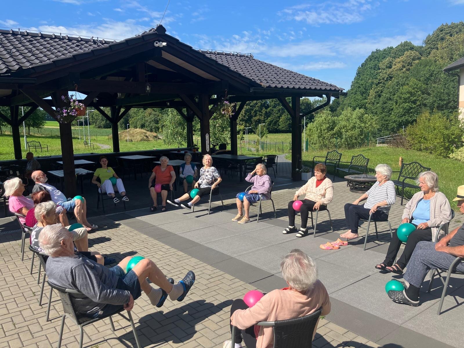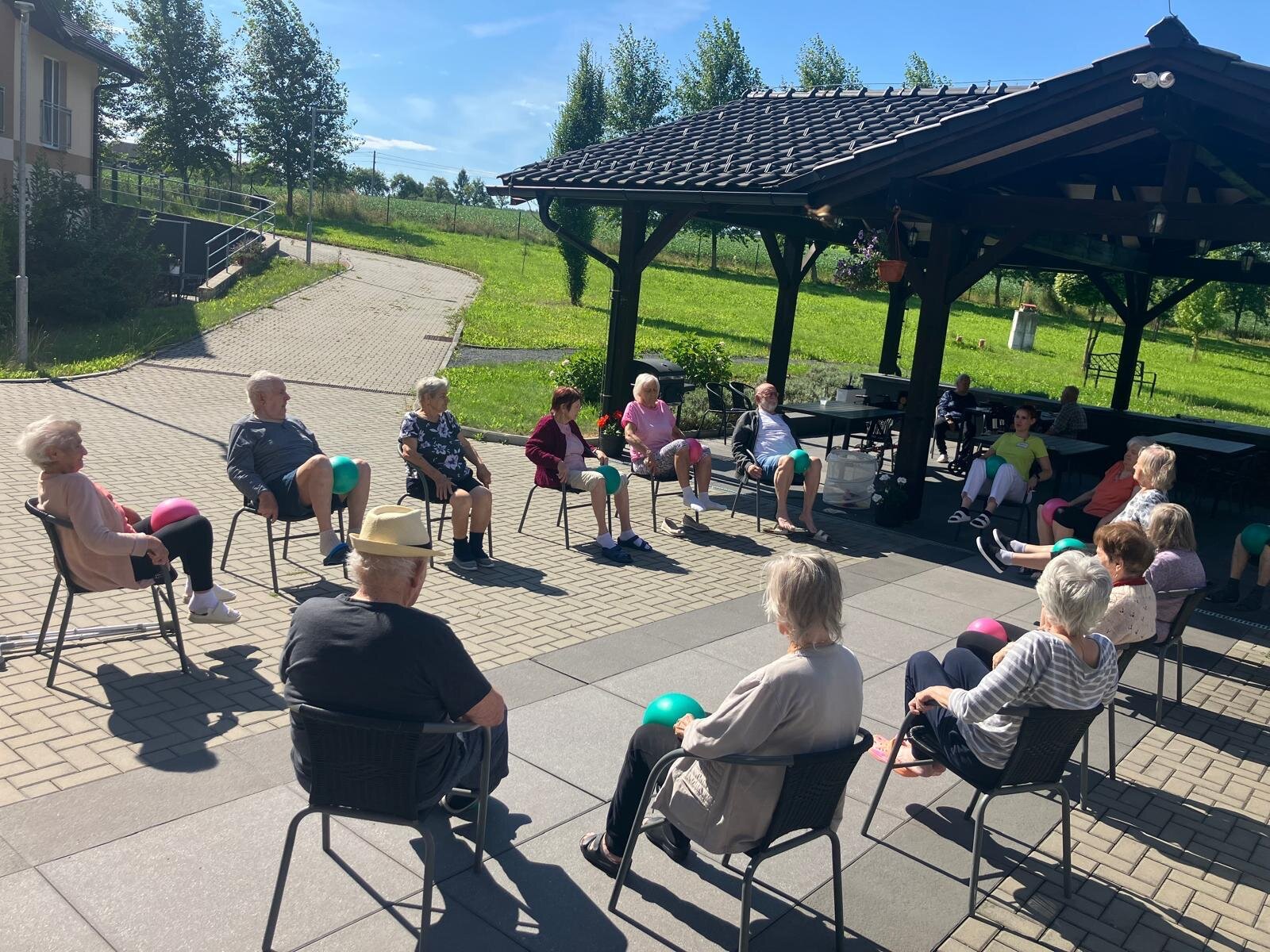 Aby si naši klienti v Senevida Kateřinice udrželi co nejdéle funkční střed těla a schopnost chůze, poctivě posilujeme pomocí overballů. Využíváme krásných slunných dní, a proto většina aktivit nyní probíhá venku na zahradě.🌞