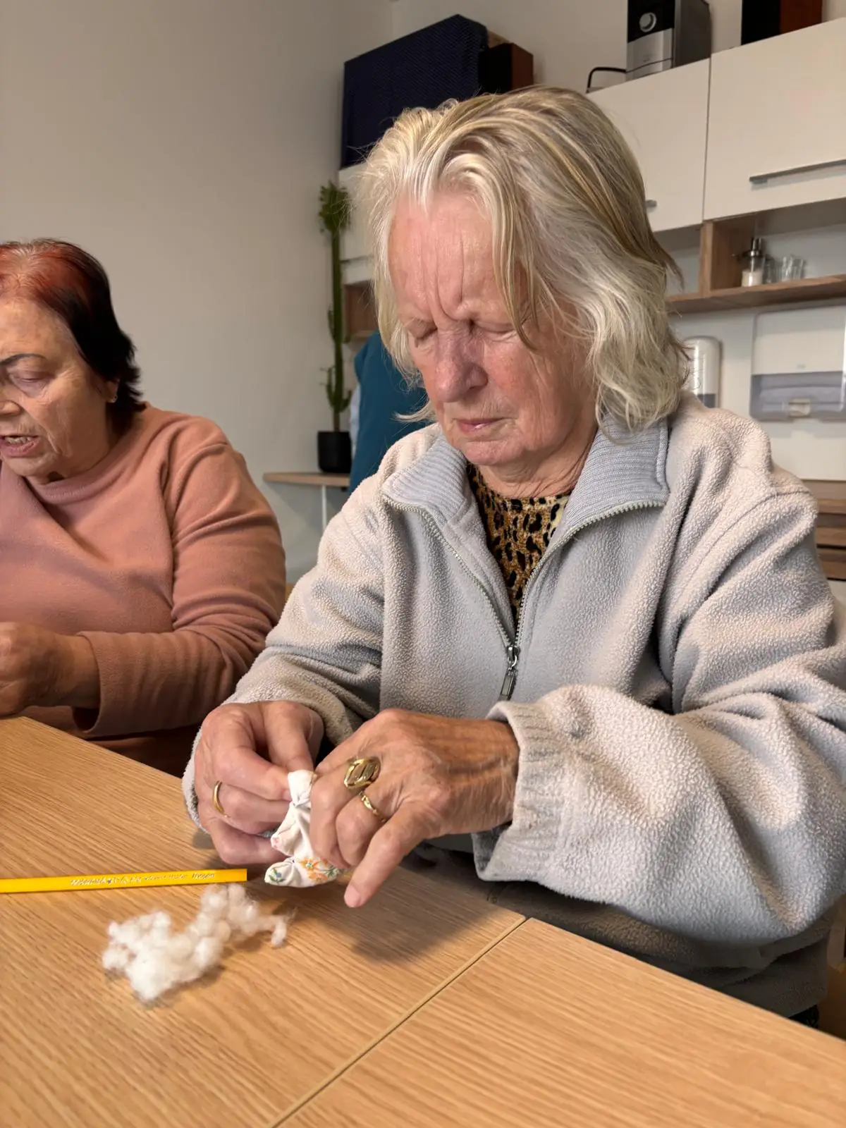 V rámci odpoledního klubu s klienty Senevida Kateřinice pomalu vyrábíme jarní dekorace 🐦. Práce s látkou, výplní do polštářů a ta nejtěžší práce s jehlou. Klientky si tak připomněly ruční práce, které běžně vykonávaly ve svých domovech třeba v podobě štupování ponožek. Už se těšíme na výsledek.