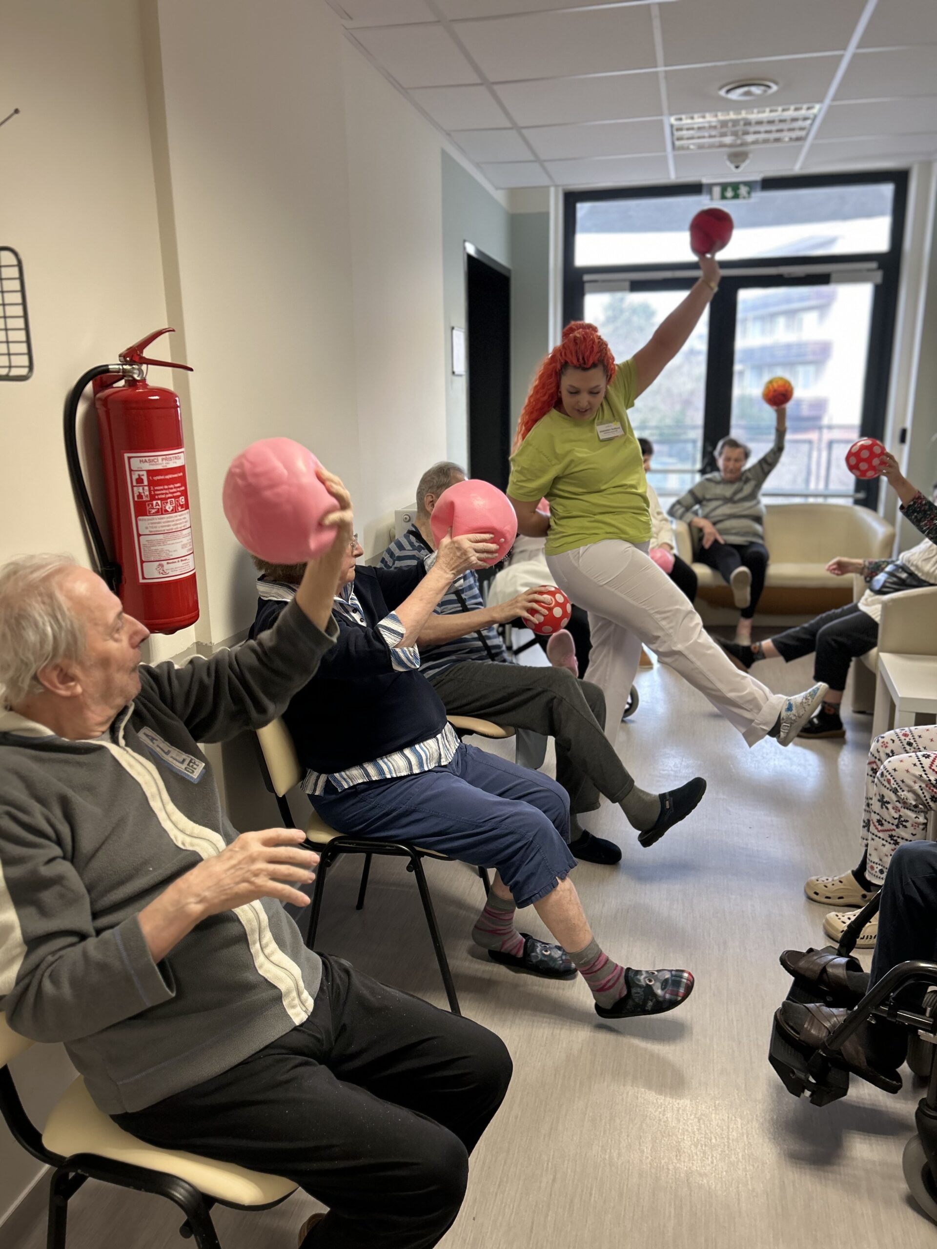 Někde se víc posiluje s pomůckami, jinde se zaměřujeme na jemné protažení na lůžku nebo v křesle, ale vždycky je u toho úsměv a dobrá nálada.