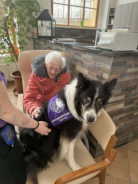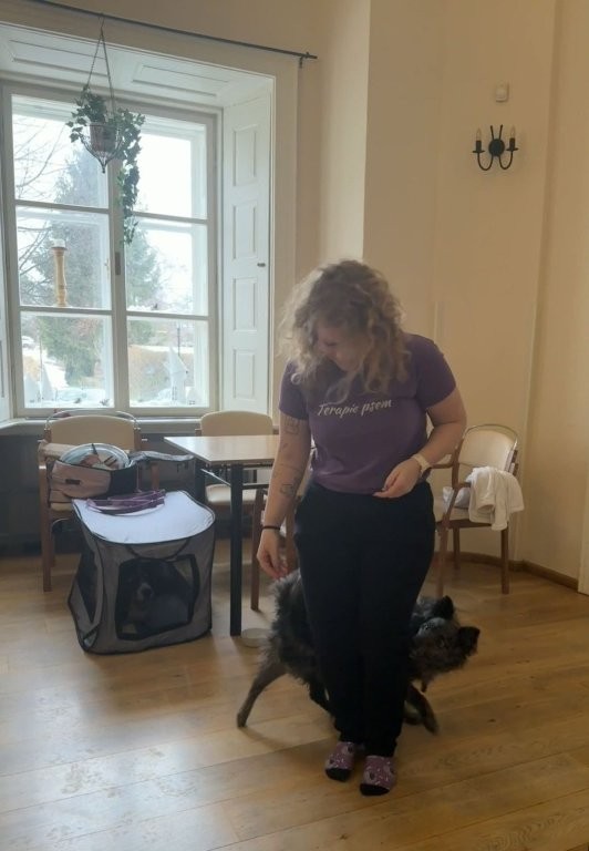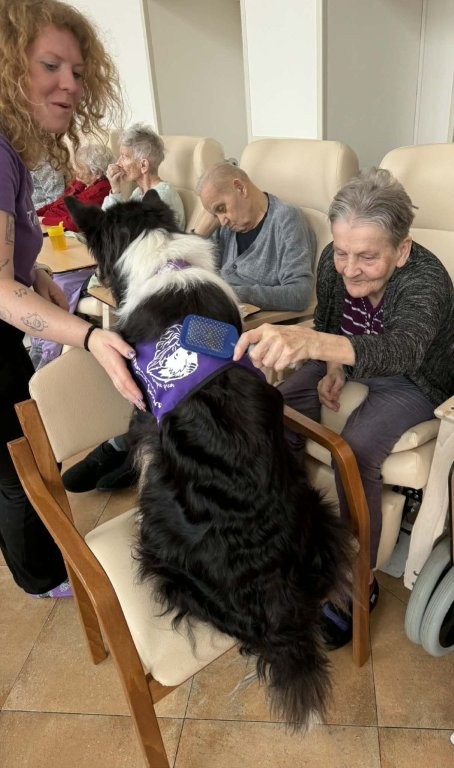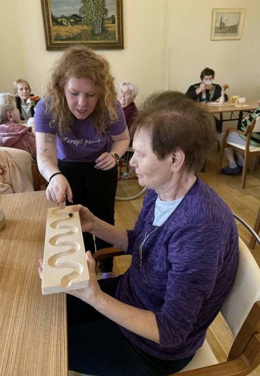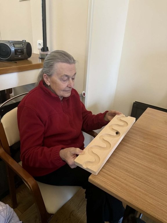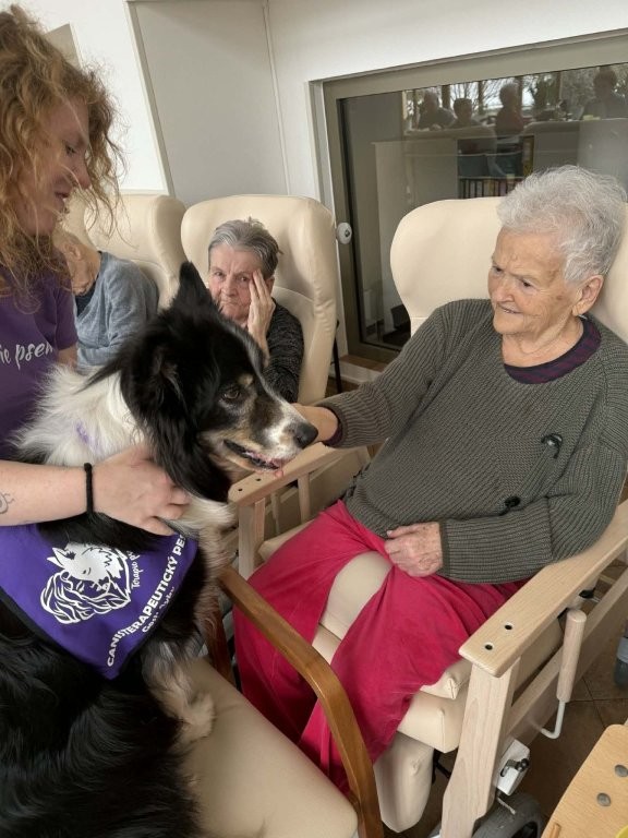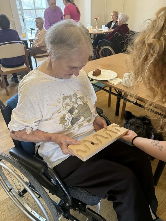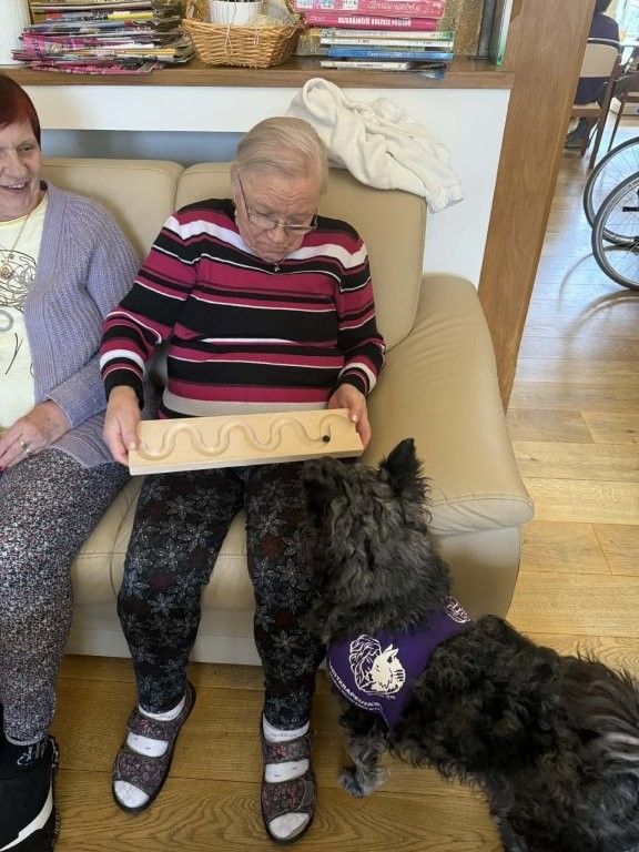 Klienti měli možnost pejsky hladit, učesat a také jim pomocí dřevěného labyrintu posílat dobrotu. Tato aktivita nebyla jen zábavná, ale zároveň pomáhala procvičovat jemnou motoriku, soustředění i trpělivost.