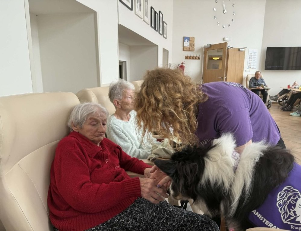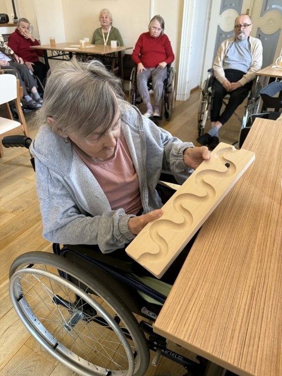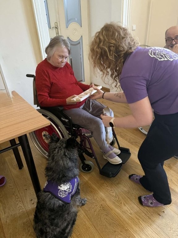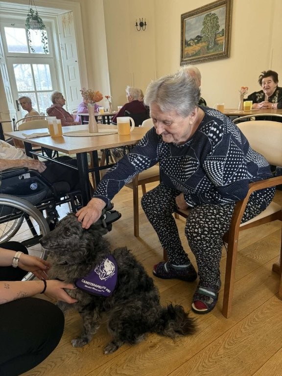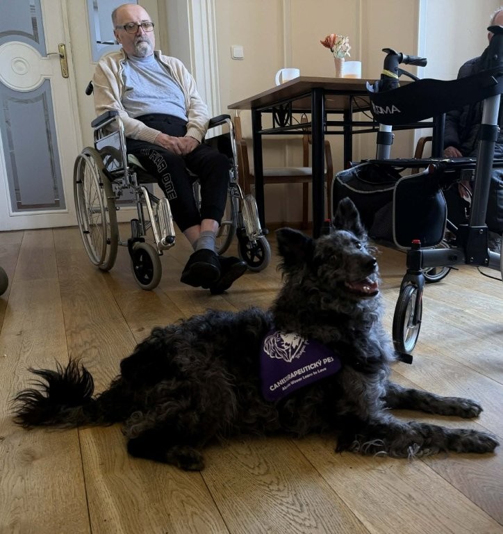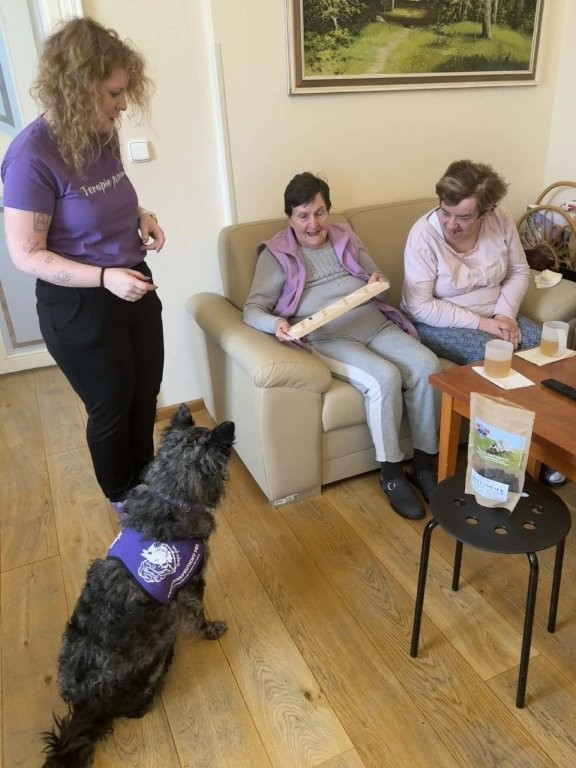 Klienti měli možnost pejsky hladit, učesat a také jim pomocí dřevěného labyrintu posílat dobrotu. Tato aktivita nebyla jen zábavná, ale zároveň pomáhala procvičovat jemnou motoriku, soustředění i trpělivost.