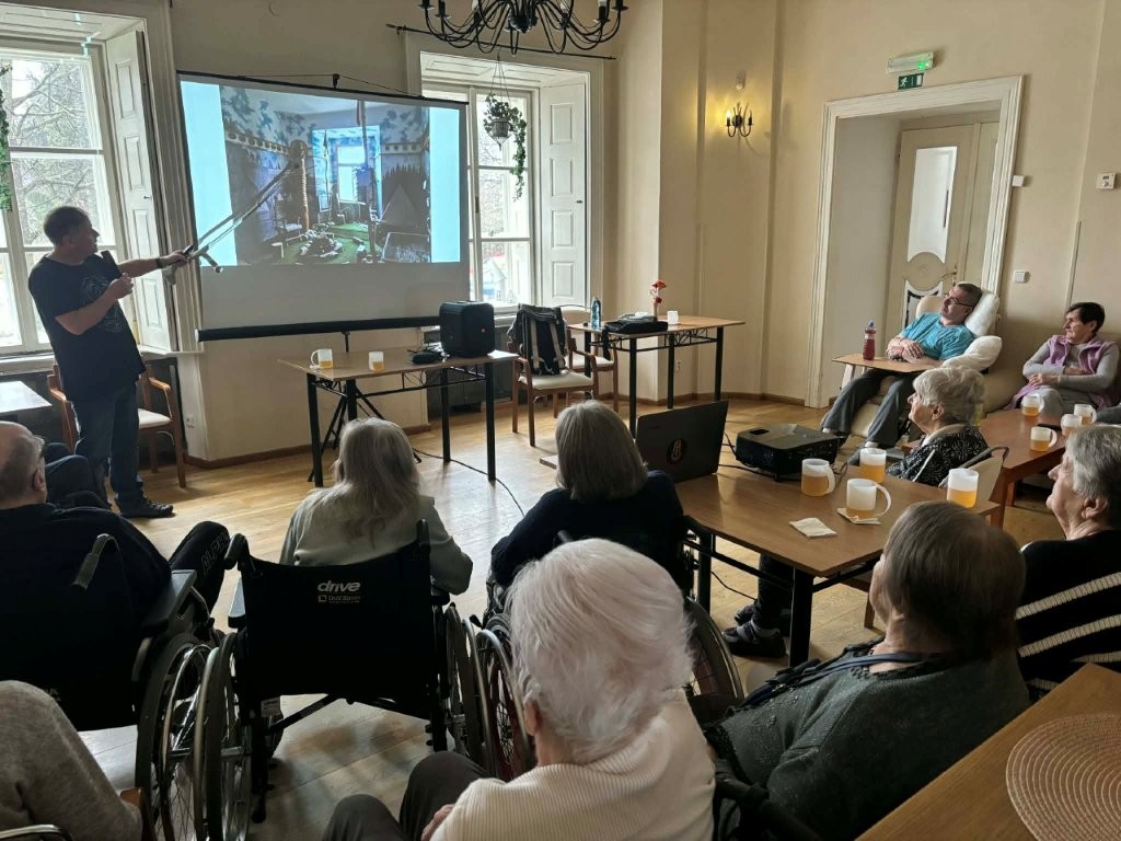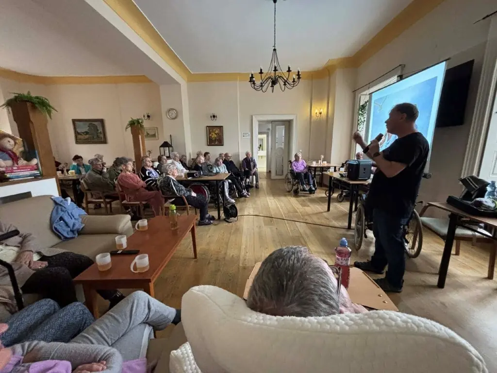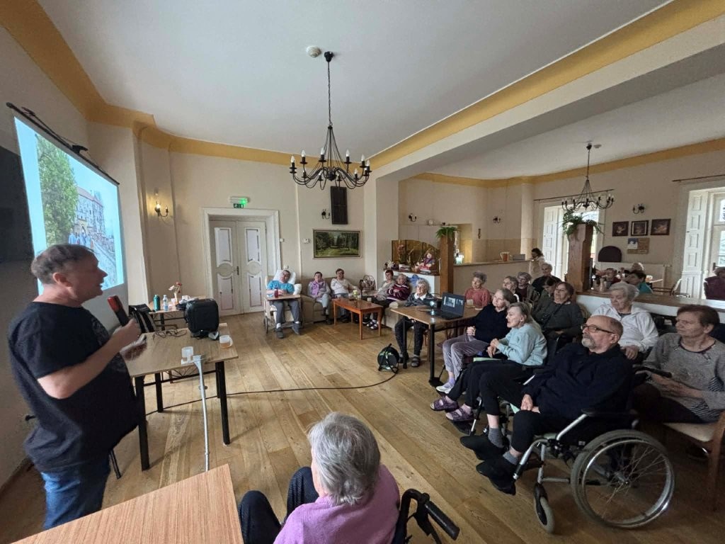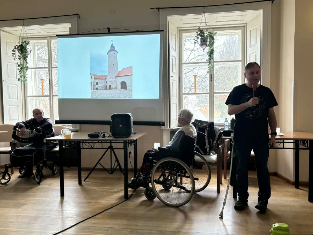 Při své návštěvě nám přednesl krásné vyprávění o Ledči nad Sázavou, ve kterém se zaměřil na návštěvu zámku a muzea Jaroslava Foglara.