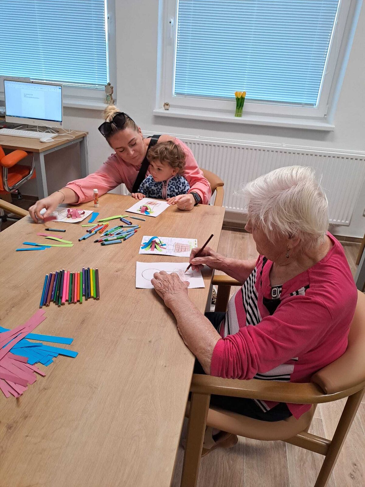 Děti z Ostrovské školičky Sluníčko dnes podnikly společnou cestu kolem světa, i když jen symbolicky – pomocí tužky a fantazie společně s klienty z Senevida Ostrov. Vyráběli krásné předměty, které znázorňovaly různé kouty světa a kreativní dílna byla plná radosti a smíchu. Po společném tvoření děti seniory potěšily krátkou básničkou a veselým tancem. Tato mezigenerační spolupráce opět ukázala, jak moc je důležité sdílení a společné tvoření mezi generacemi.❤️😀