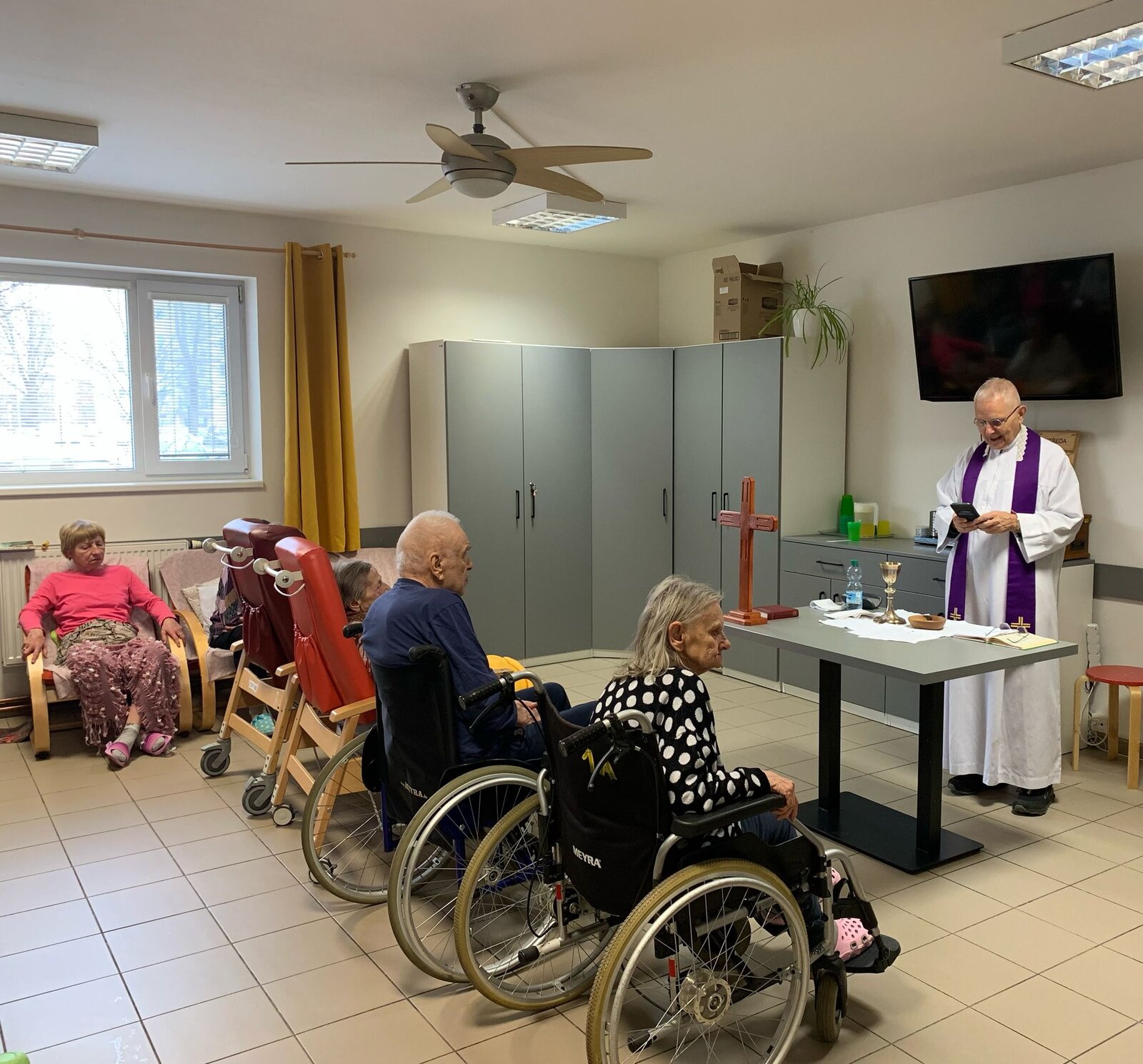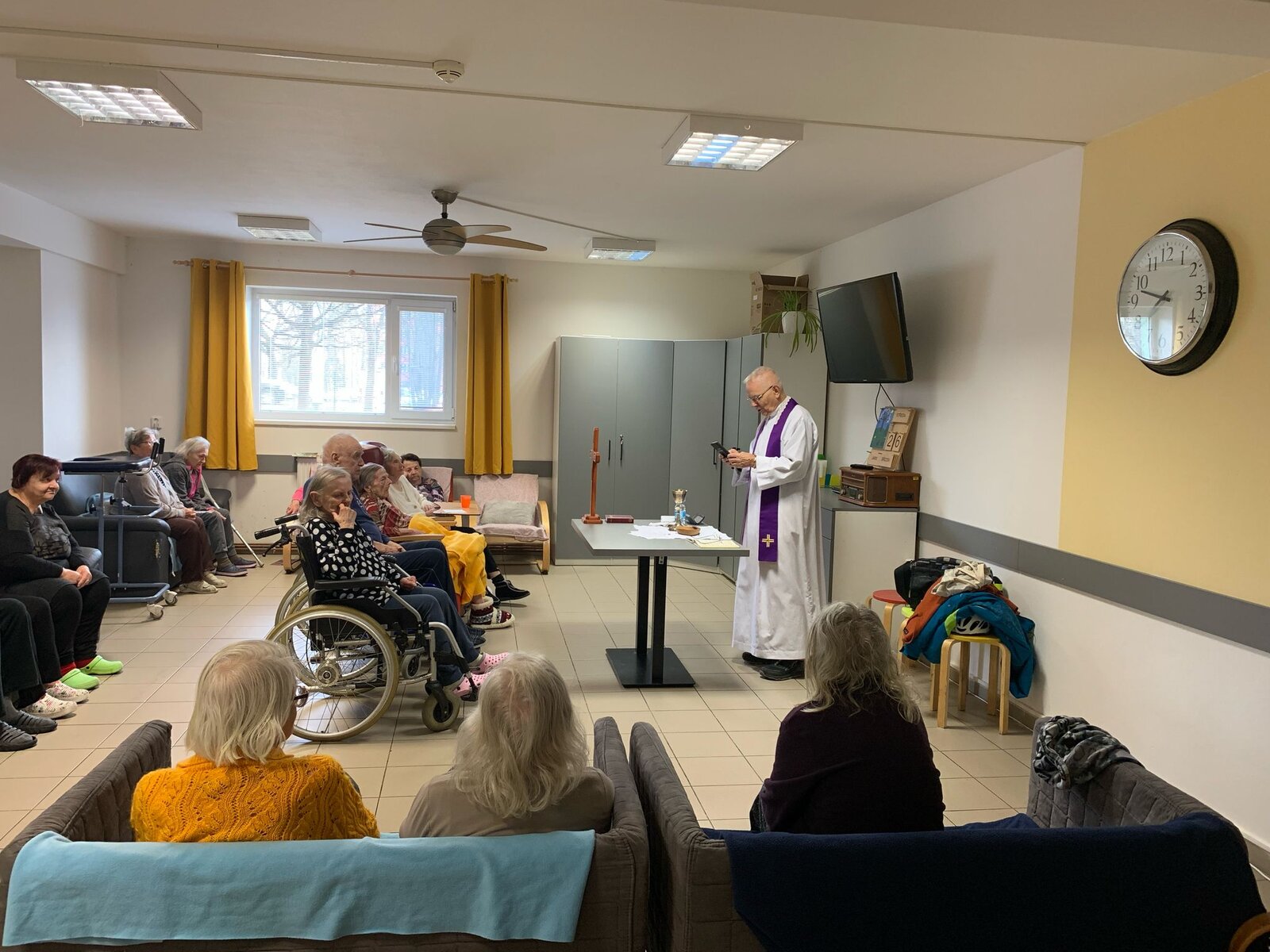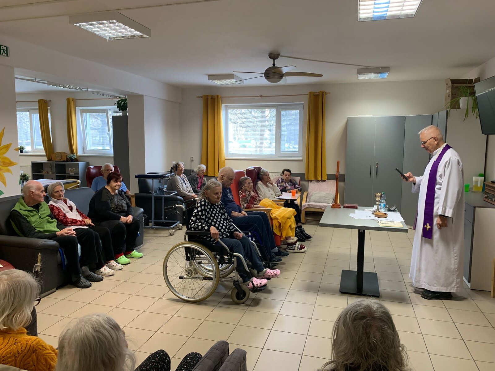 V březnu jsme se opět zúčastnili naší oblíbené Mše s panem farářem. Počasí nám ještě nedovolilo užít si Bohoslužbu na zahradě, ale i tak byla velká účast. Pan farář také dorazil za 2 klientkami na pokoj, protože jim zdravotní stav nedovolil se účastnit tradiční Mše. Moc děkujeme za tuto možnost.