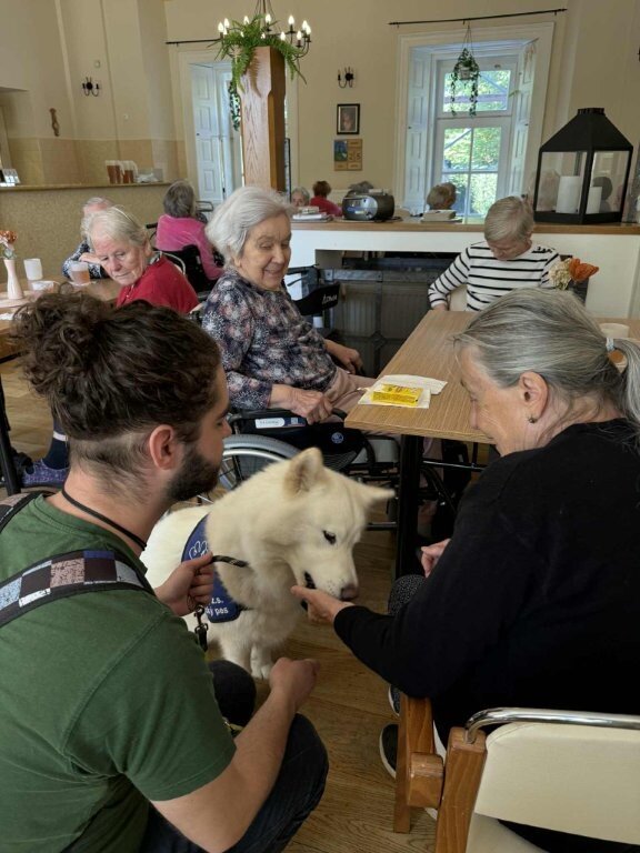 Dnes nás poprvé navštívila krásná bílá malamutka Janika – speciálně vycvičená ke canisterapii.