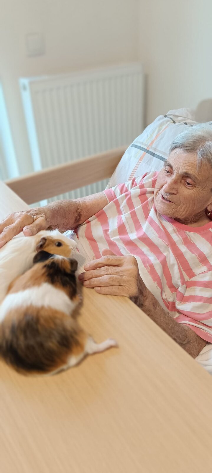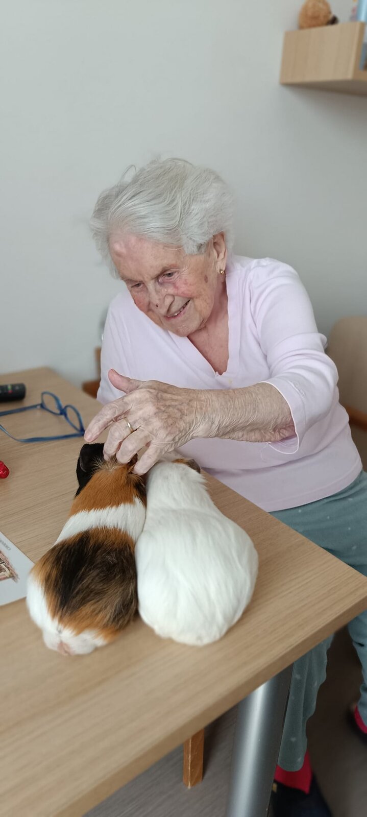 Každé pondělí a pátek odpoledne probíhá v Senevida Modřany Caviaterapie. To je terapie za pomoci našich tří morčátek. Sněženka, Josef a Čiperka se využívají v dotykové aktivitě. Dotyk je druhem komunikace a naše morčata mají nejraději drbání za ouškama. Morčátka jsou dostupná všem klientům, kteří se na ně ve volném čase mohou jít podívat, popřípadě je nakrmit.😊💙