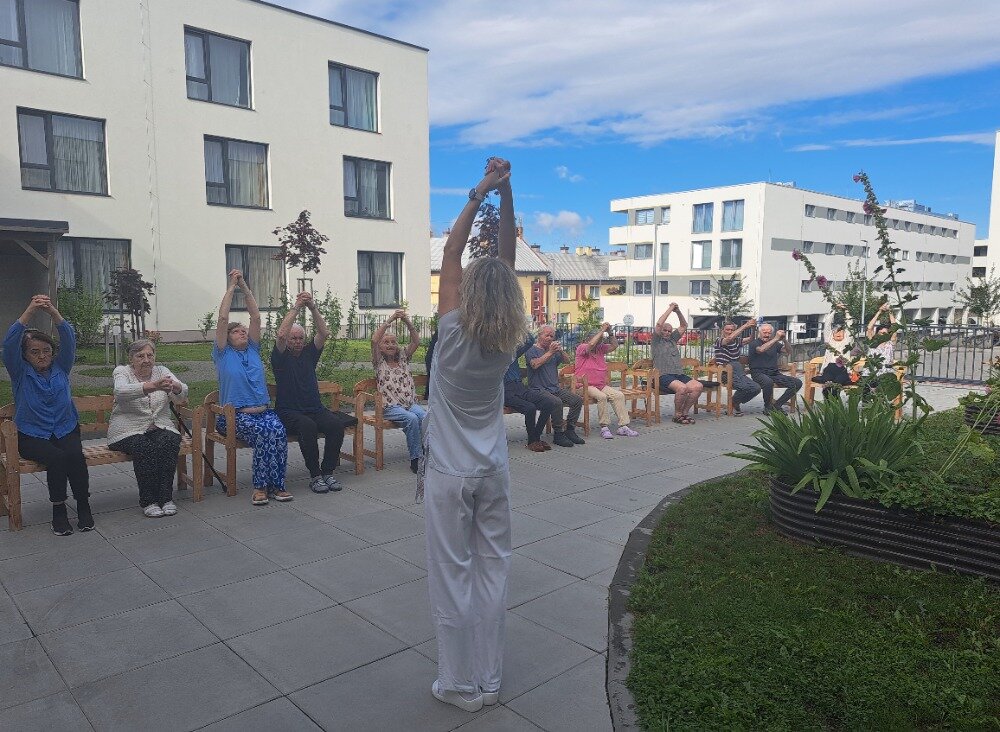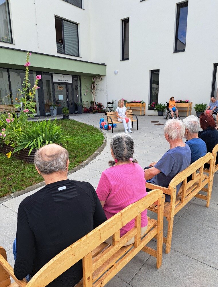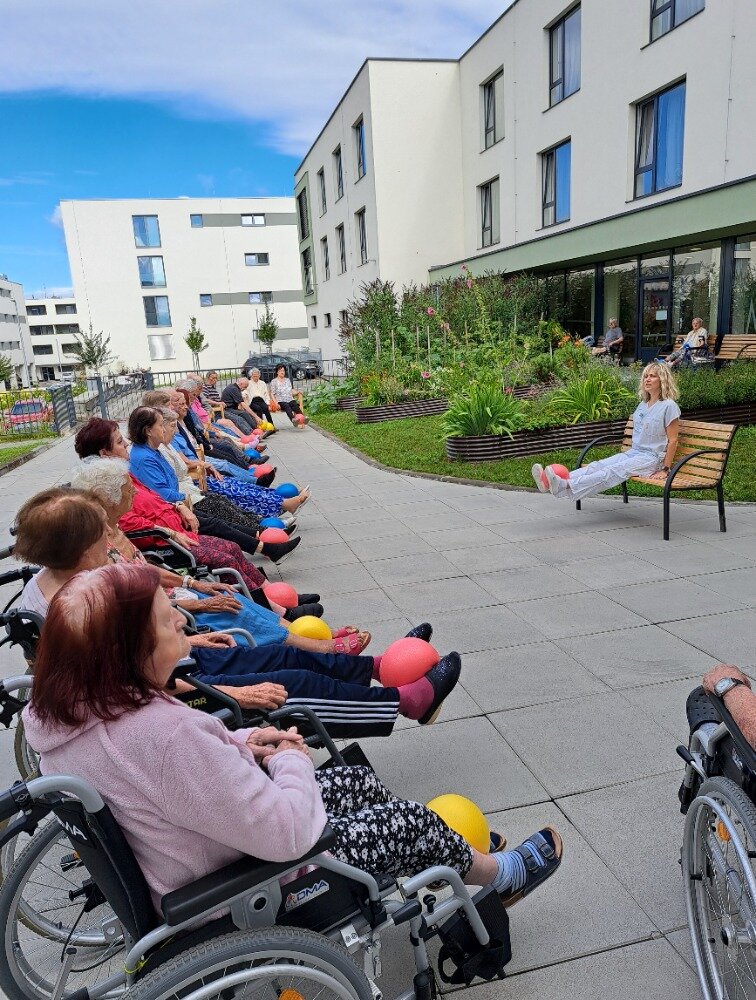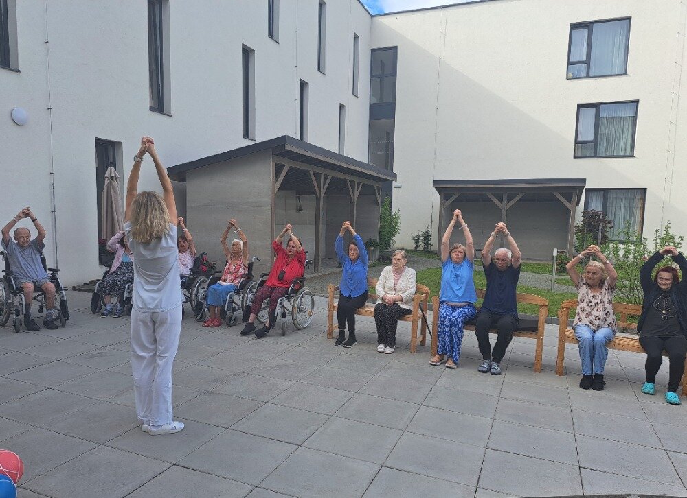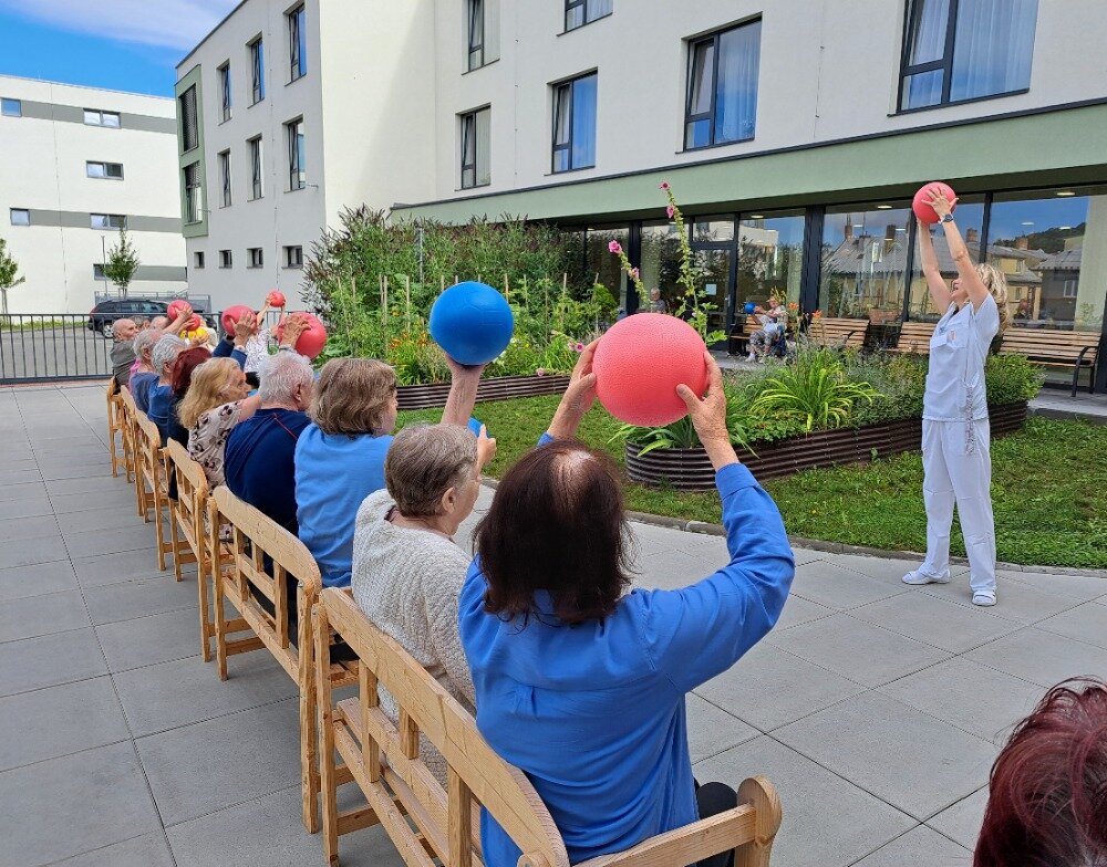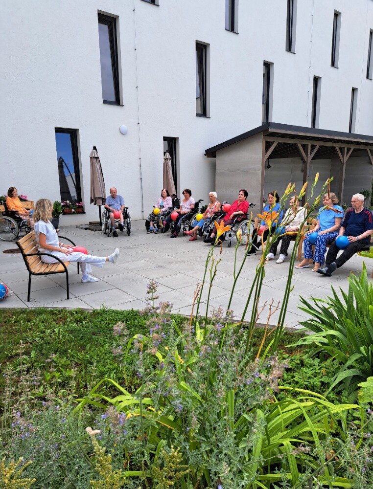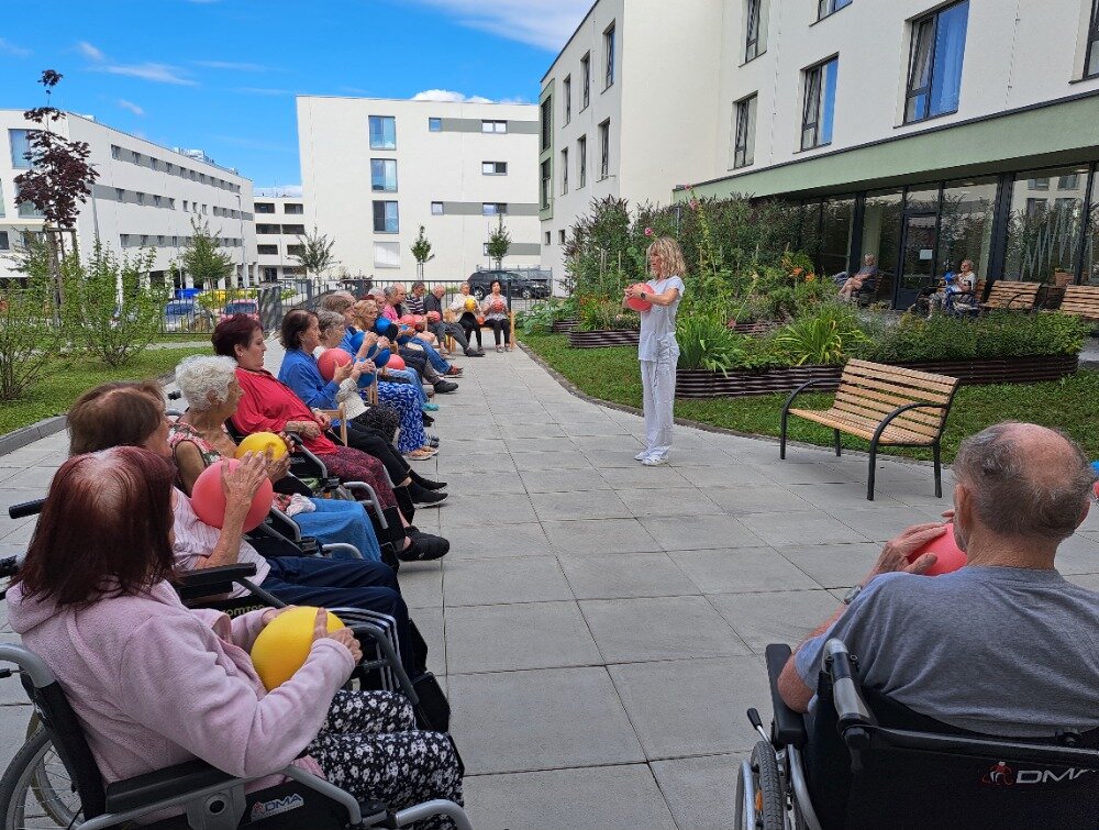 Každé všední ráno se u nás v Senevida Boskovice pravidelně setkáváme na cvičení s naší fyzioterapeutkou Klárou. Obvykle cvičíme v jídelně, ale tentokrát jsme udělali příjemnou změnu a ranní cvičení jsme přesunuli ven na zahradu. Všichni klienti se pohodlně usadili na lavičkách, nejprve se prodýchali, protáhli a poté si zacvičili s pomocí overballů.