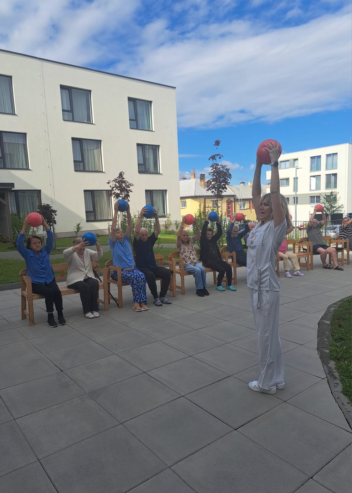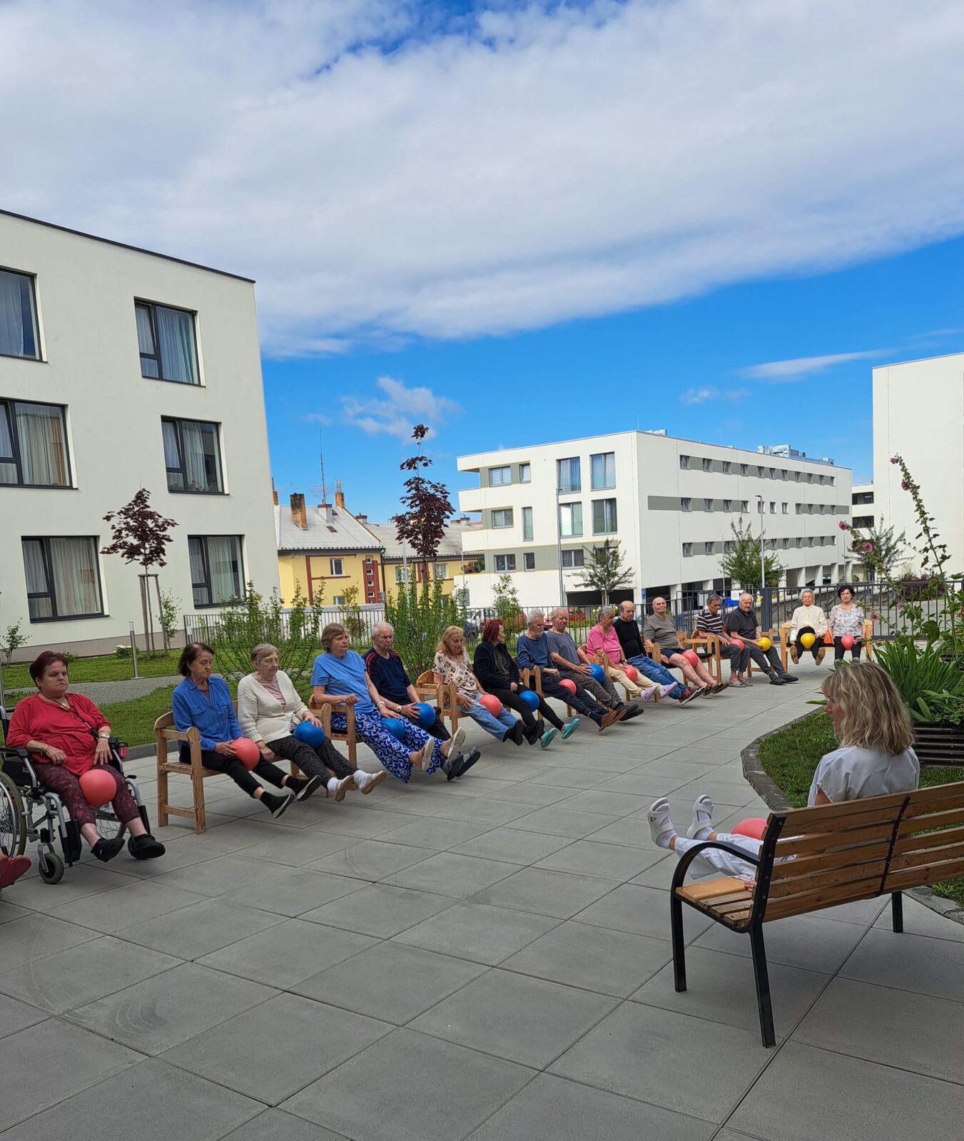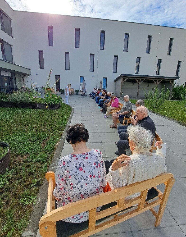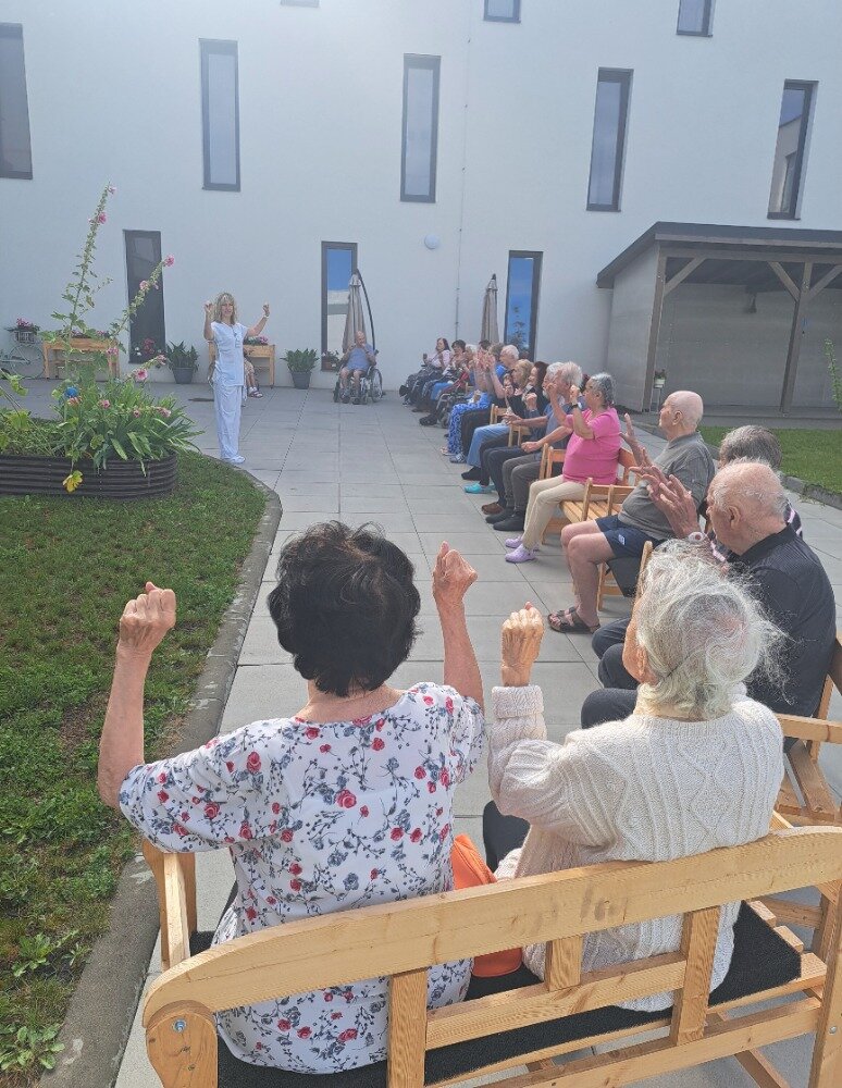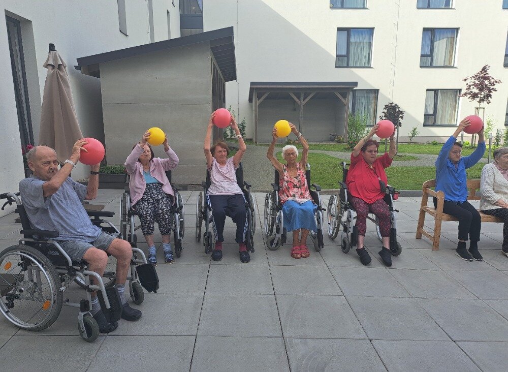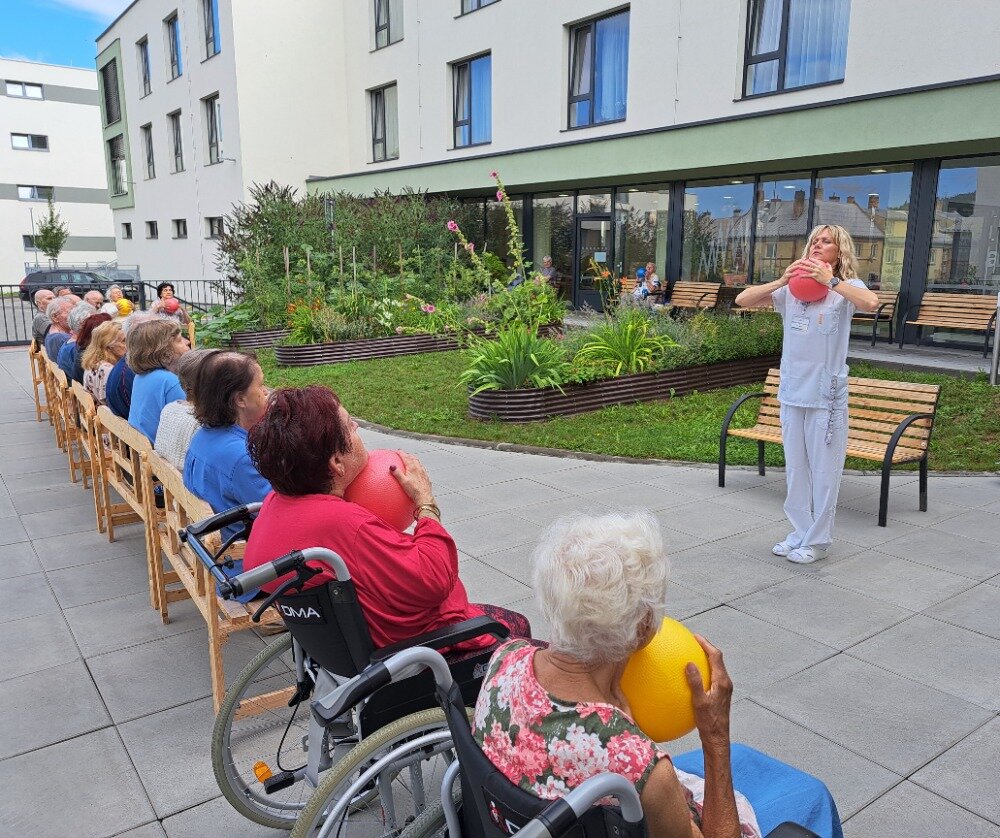 Každé všední ráno se u nás v Senevida Boskovice pravidelně setkáváme na cvičení s naší fyzioterapeutkou Klárou. Obvykle cvičíme v jídelně, ale tentokrát jsme udělali příjemnou změnu a ranní cvičení jsme přesunuli ven na zahradu. Všichni klienti se pohodlně usadili na lavičkách, nejprve se prodýchali, protáhli a poté si zacvičili s pomocí overballů.