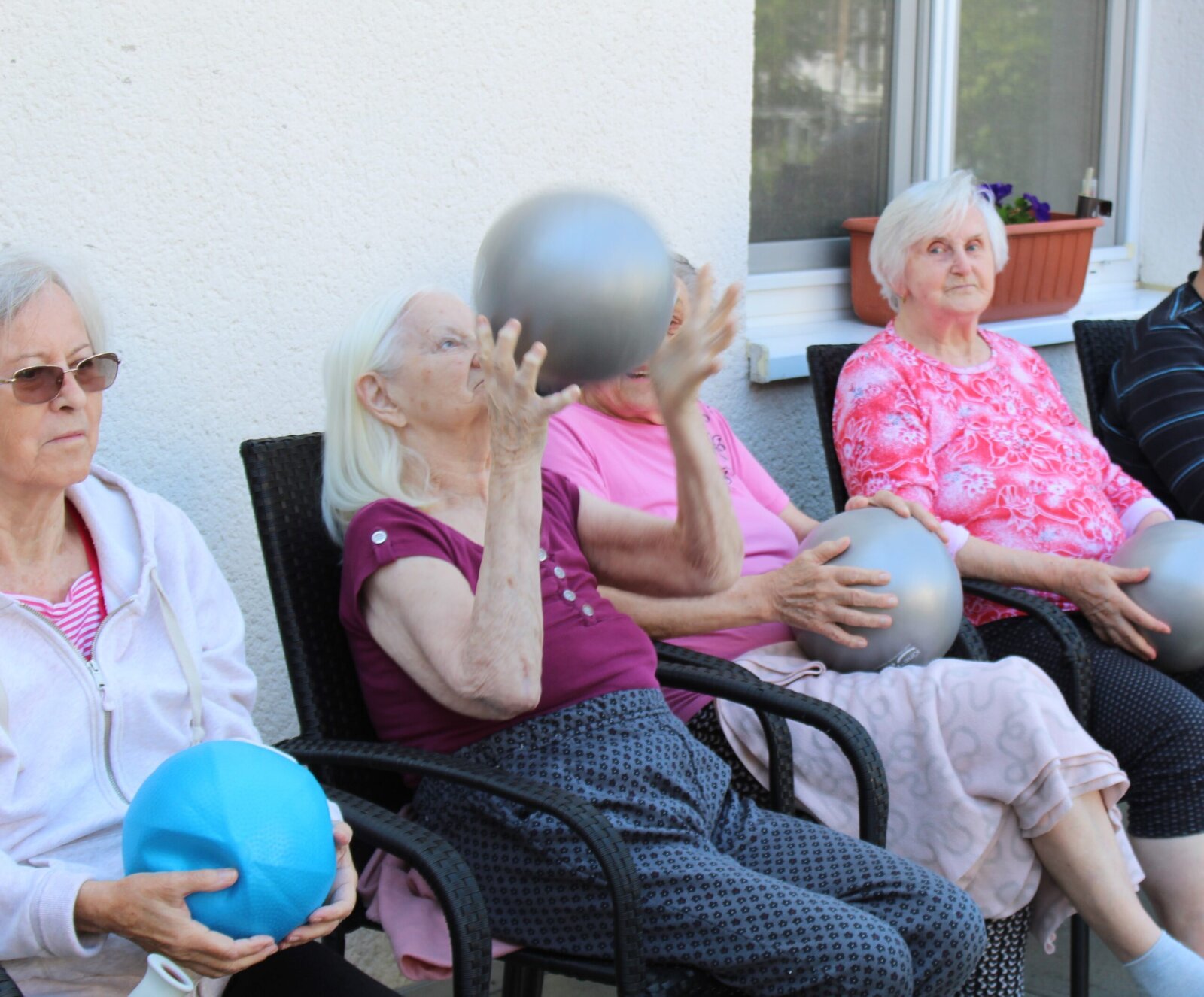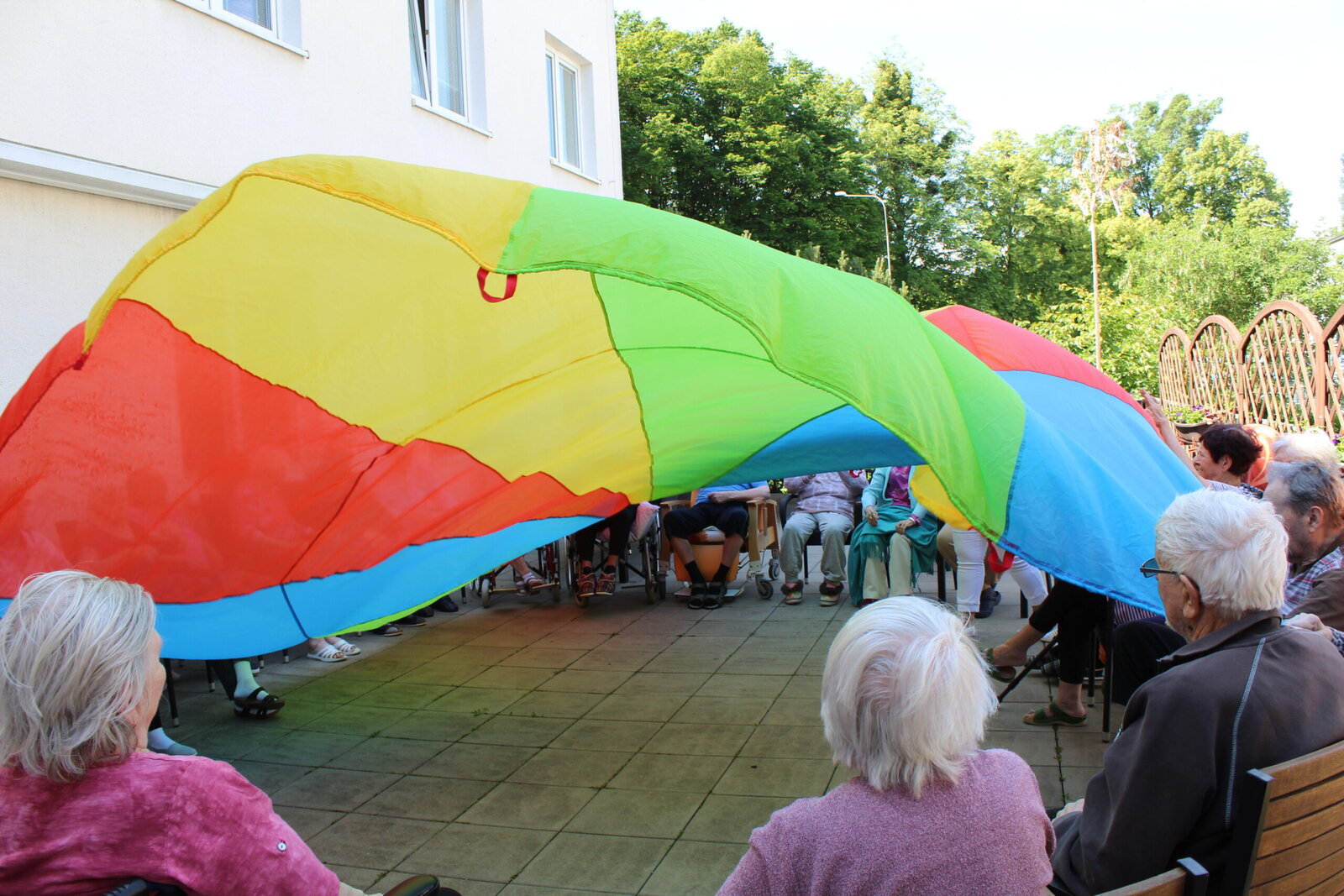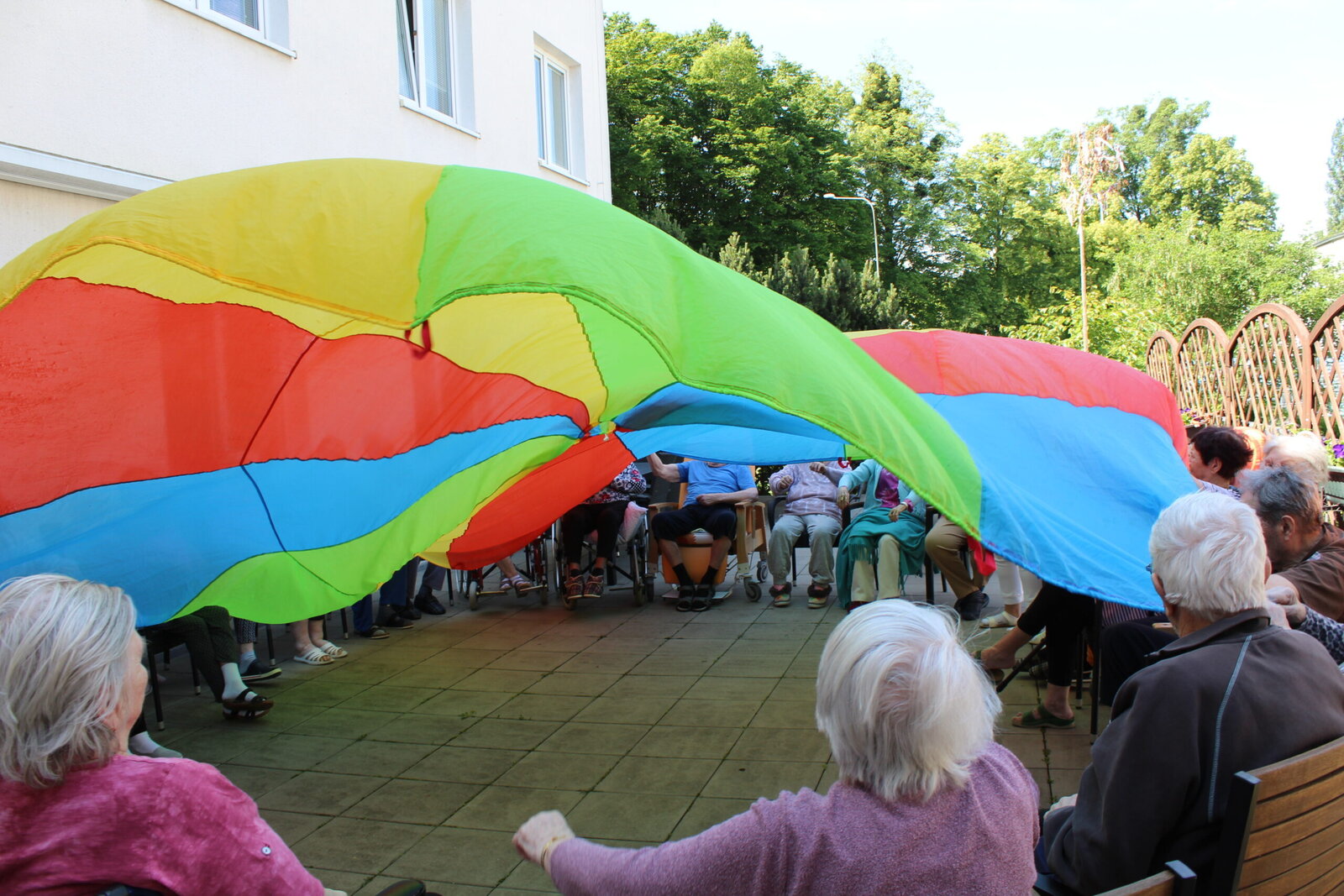 Bylo pěkné počasí, teplo, akorát vhodné na posezení venku. Začali jsme lehkým protažením, rozcvičkou a balony. Není to jednoduché udržet balon v jedné ruce, ale hravě jsme to zvládli. Následovaly cviky s pestrobarevným padákem, u kterého jsme se v Senevida Zlín nasmáli.