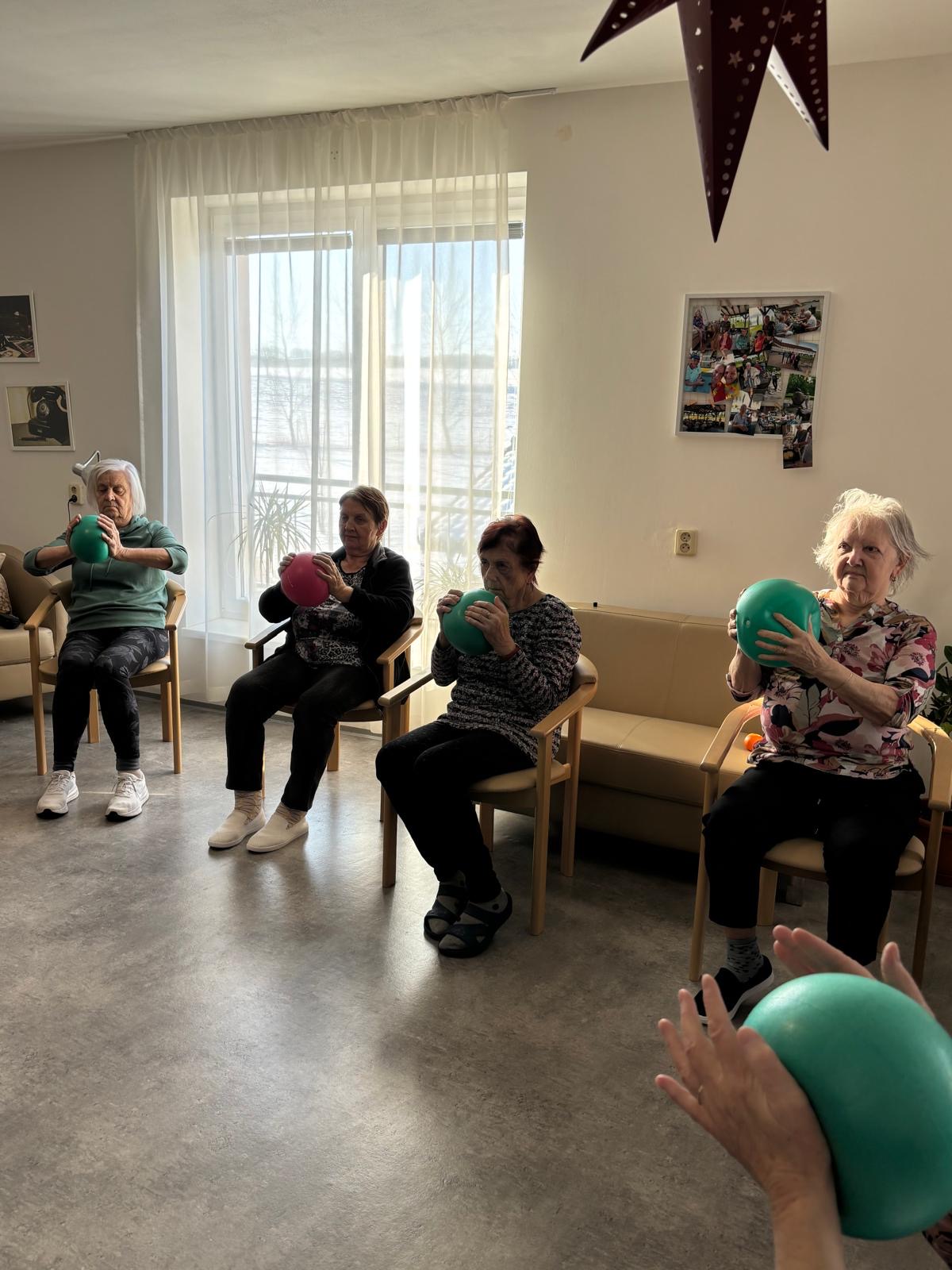 Pravidelně pořádáme u nás v domově minimálně jednou týdně cvičení na židlích s overbally, kde se zaměřujeme na opatrné posilování svalů pomocí práce s vlastní váhou, vhodné pro seniory, které je promyšlené tak, abychom eliminovali riziko vzniku úrazů nebo pádů. Dále se také protahujeme a učíme se tzv. krabicové dýchání.