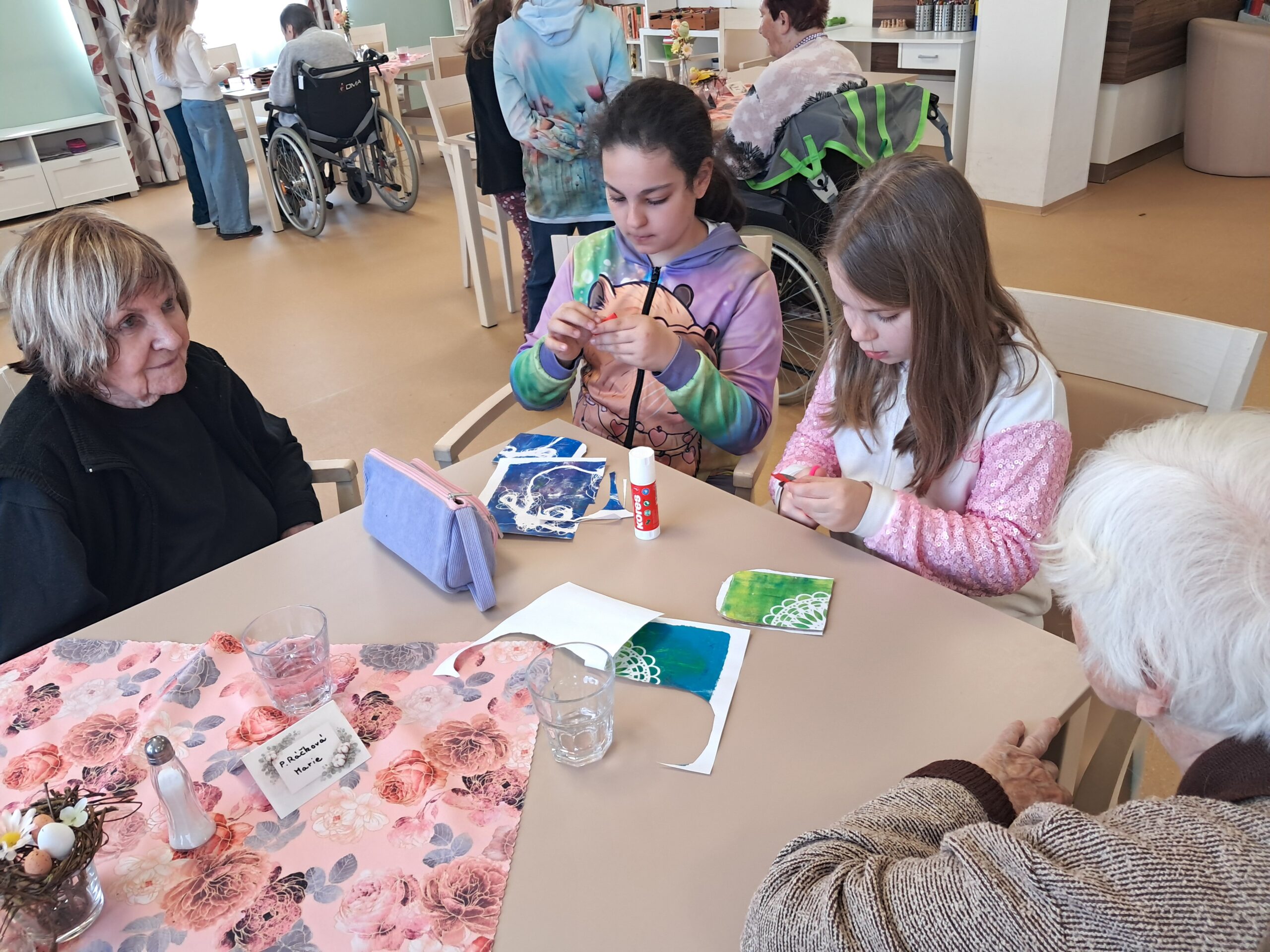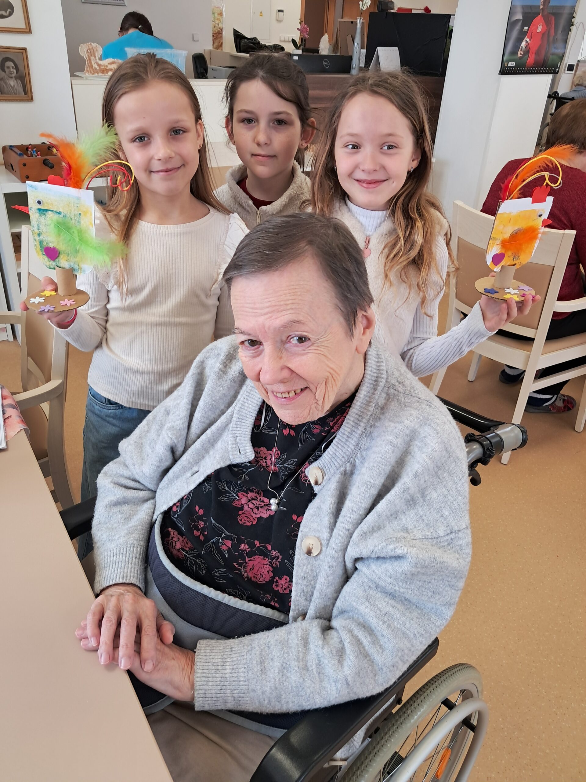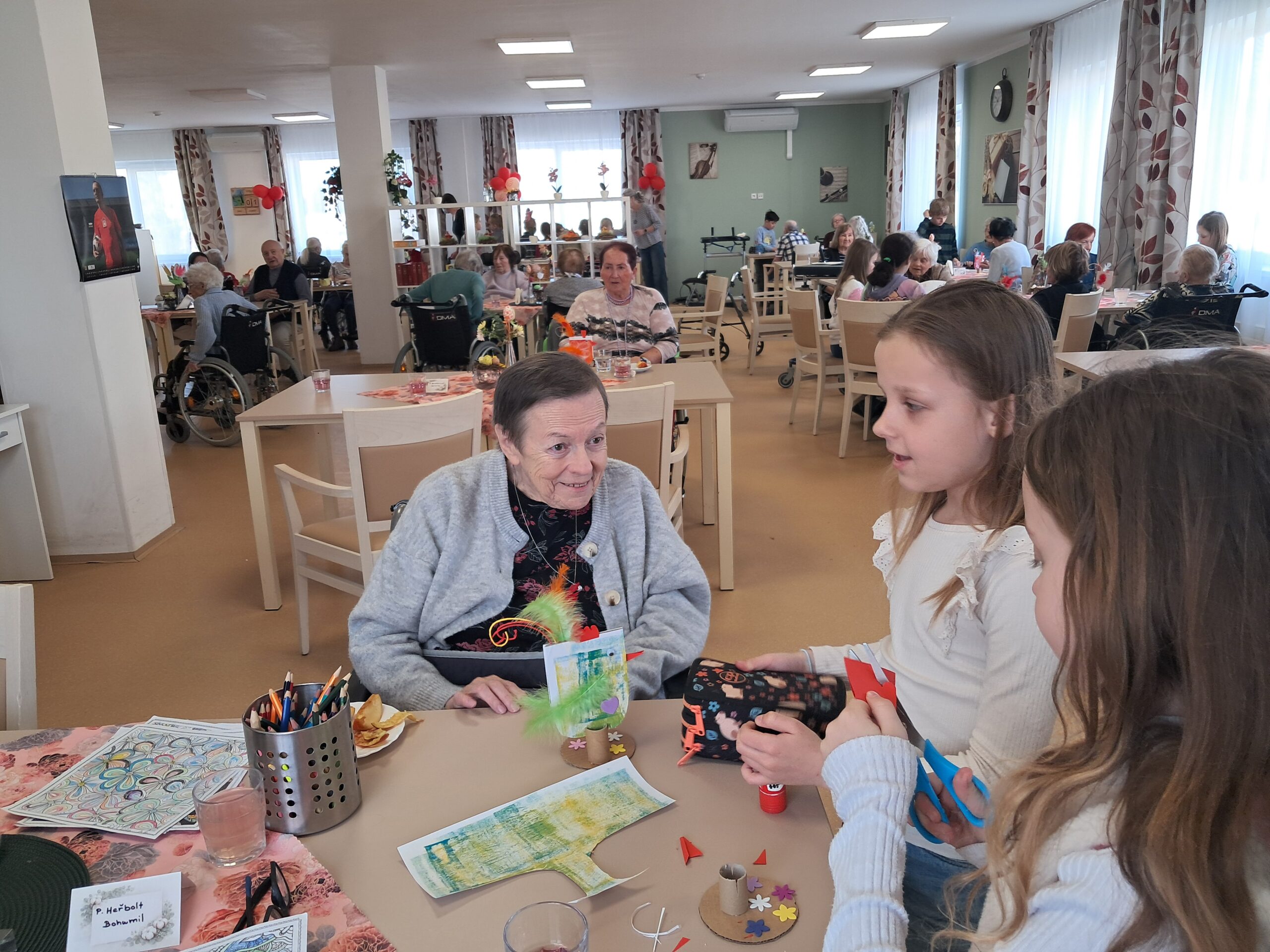 V našem domově jsme zažili krásné mezigenerační odpoledne, kdy nás navštívily děti ze Základní školy Bednářova. Společně jsme tvořili veselé velikonoční dekorace – roztomilé slepičky, které nyní zdobí naše prostory a připomínají všem příchod jara.