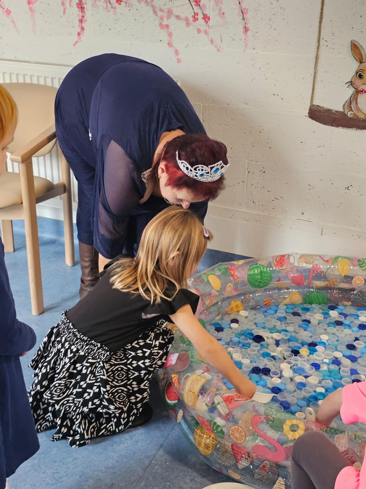 Na malé návštěvníky čekalo pět zábavných úkolů – kreslení, skládání pohádek, házení míčků do kouzelného klobouku kouzelníka Pokustóna, lovení diamantů pro královnu a chytání rybiček u vodníka.