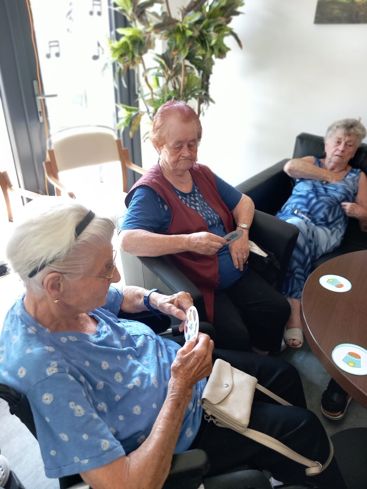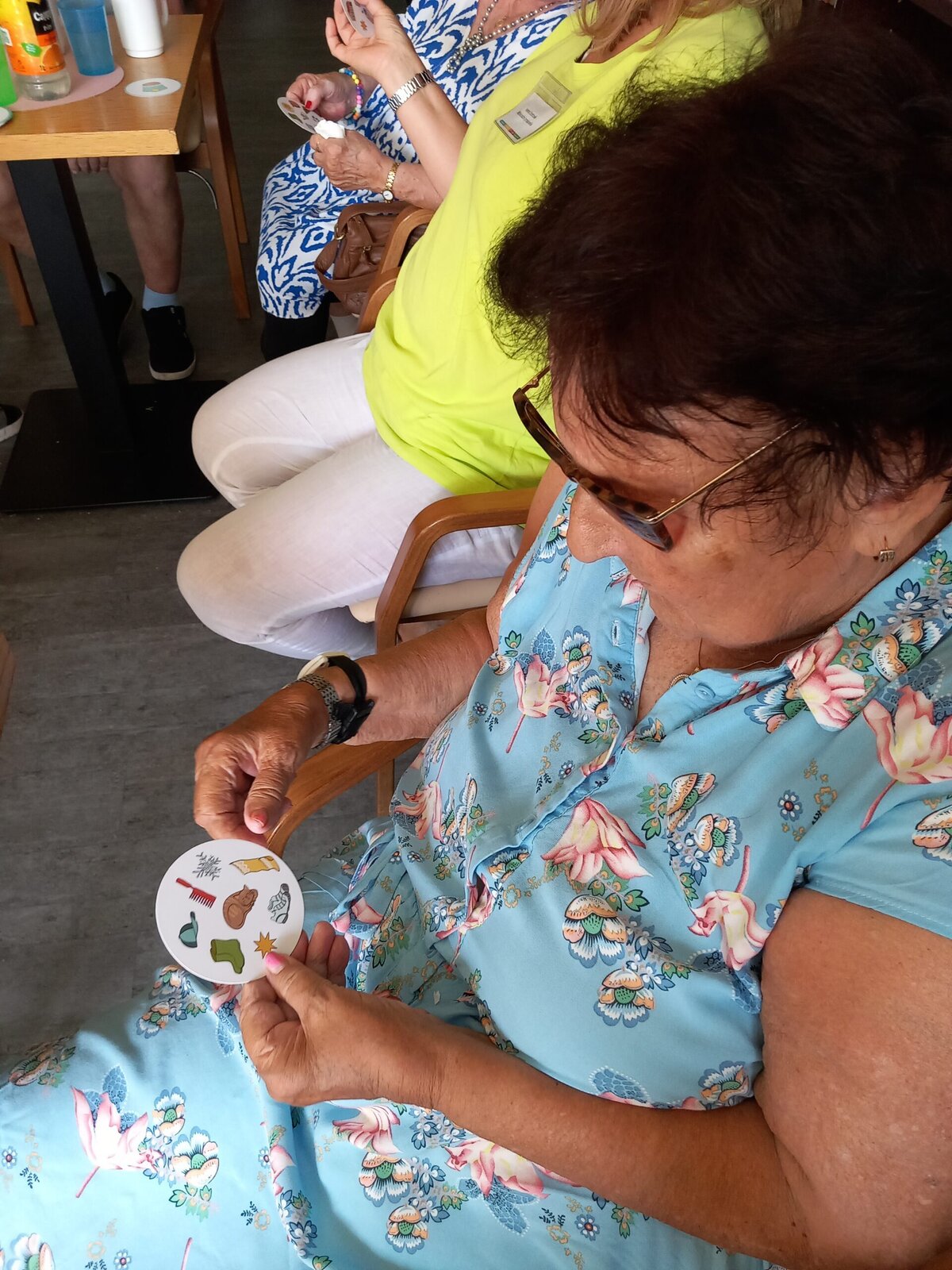 V Senevida Pitkovice jsme hráli karty, tzv. Postřeh. Hráči musí na své kartě a na kartě uprostřed najít stejný symbol, nahlas ho pojmenovat a poté kartu získávají. Vítězí ten, kdo jich má na konci nejvíce. U této hry procvičíme soustředěnost i pozornost. Klienti jsou soupeřiví a o to je hra zajímavější.