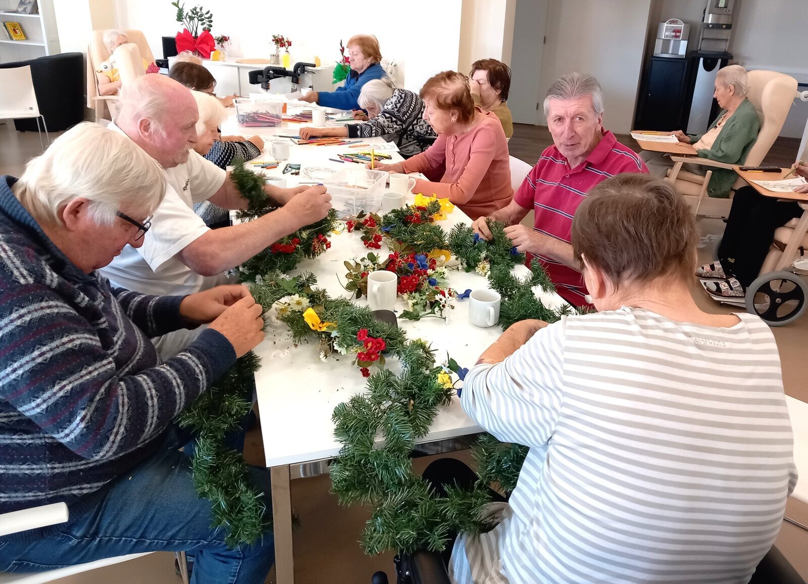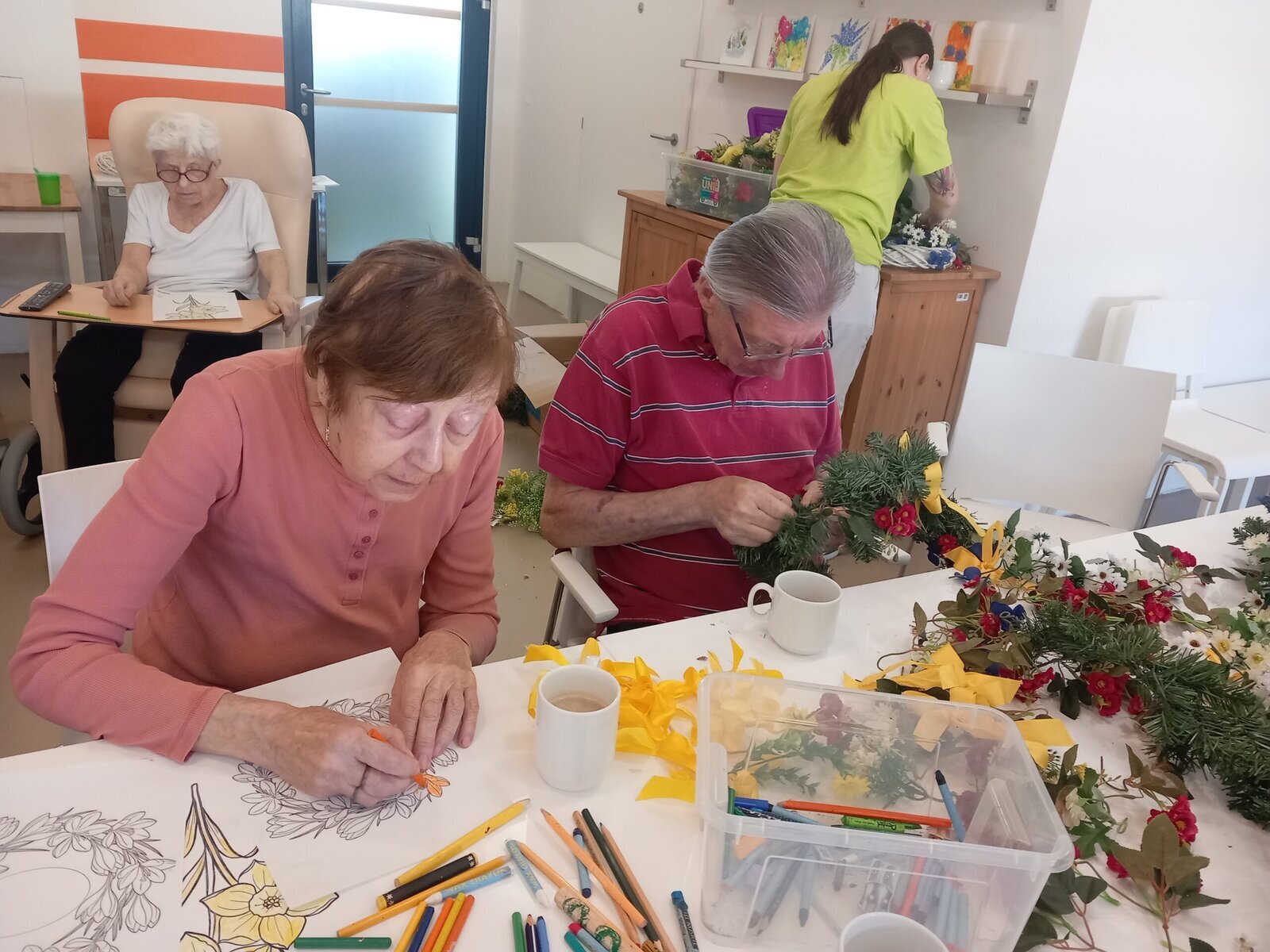 V našem zařízení Senevida Zátiší se připravujeme na jarní výzdobu. S klienty jsme společně zdobili věnce, které zdobily pestré jarní květiny. Někteří klienti se pustili do malování jarních květin, čímž vznikaly nádherné, barevné obrázky. Pestré barvy naplnily místnosti, a celková atmosféra byla plná radosti a svěžesti, která přináší jaro.