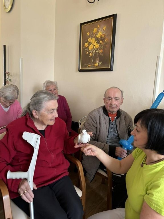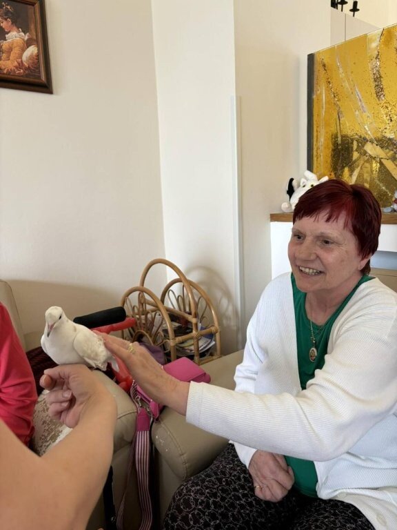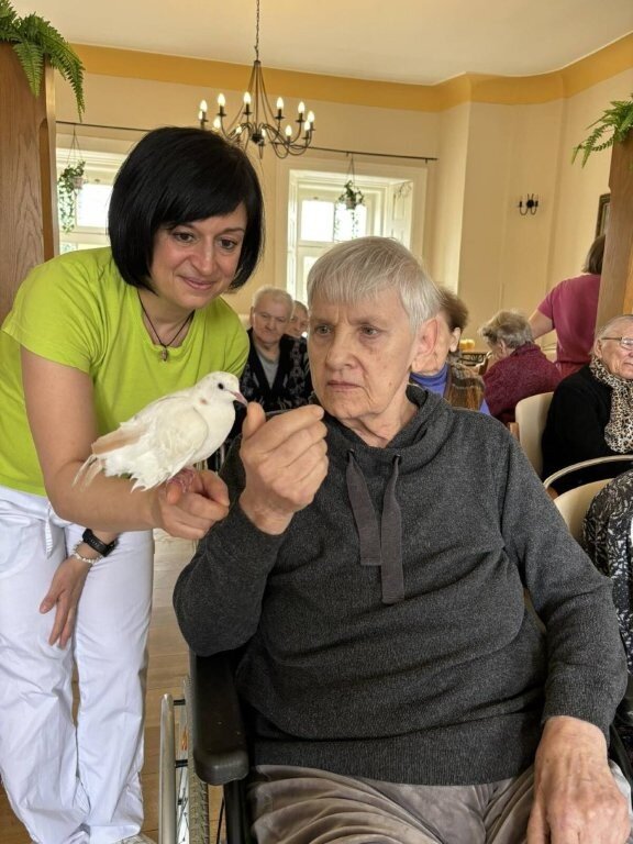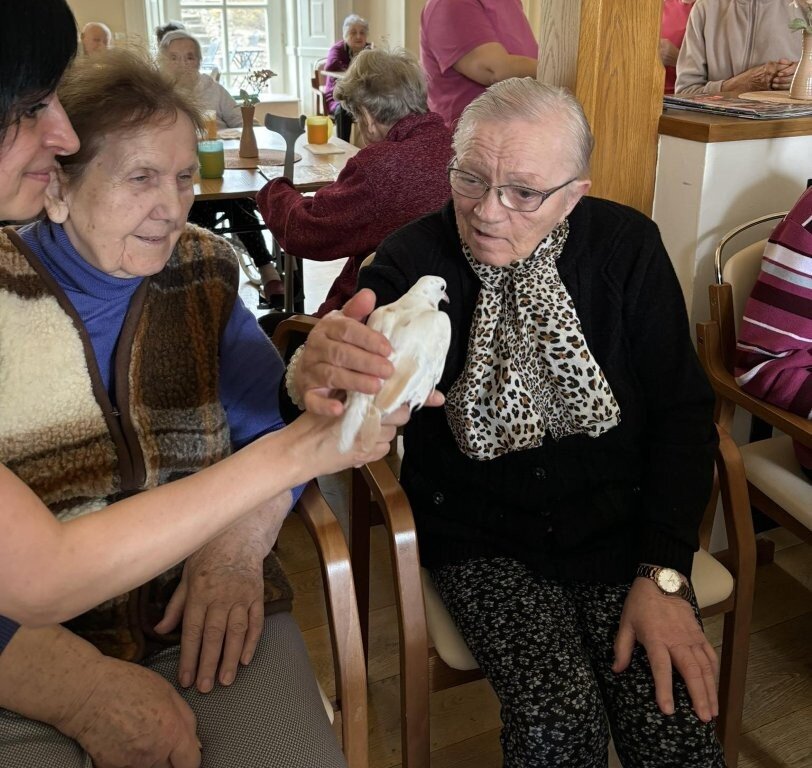 Na závěr vystoupení si naši klienti mohli pohladit, ale i třeba pochovat králíčka Honzu a holubičku Natálku, kteří byli součástí představení.