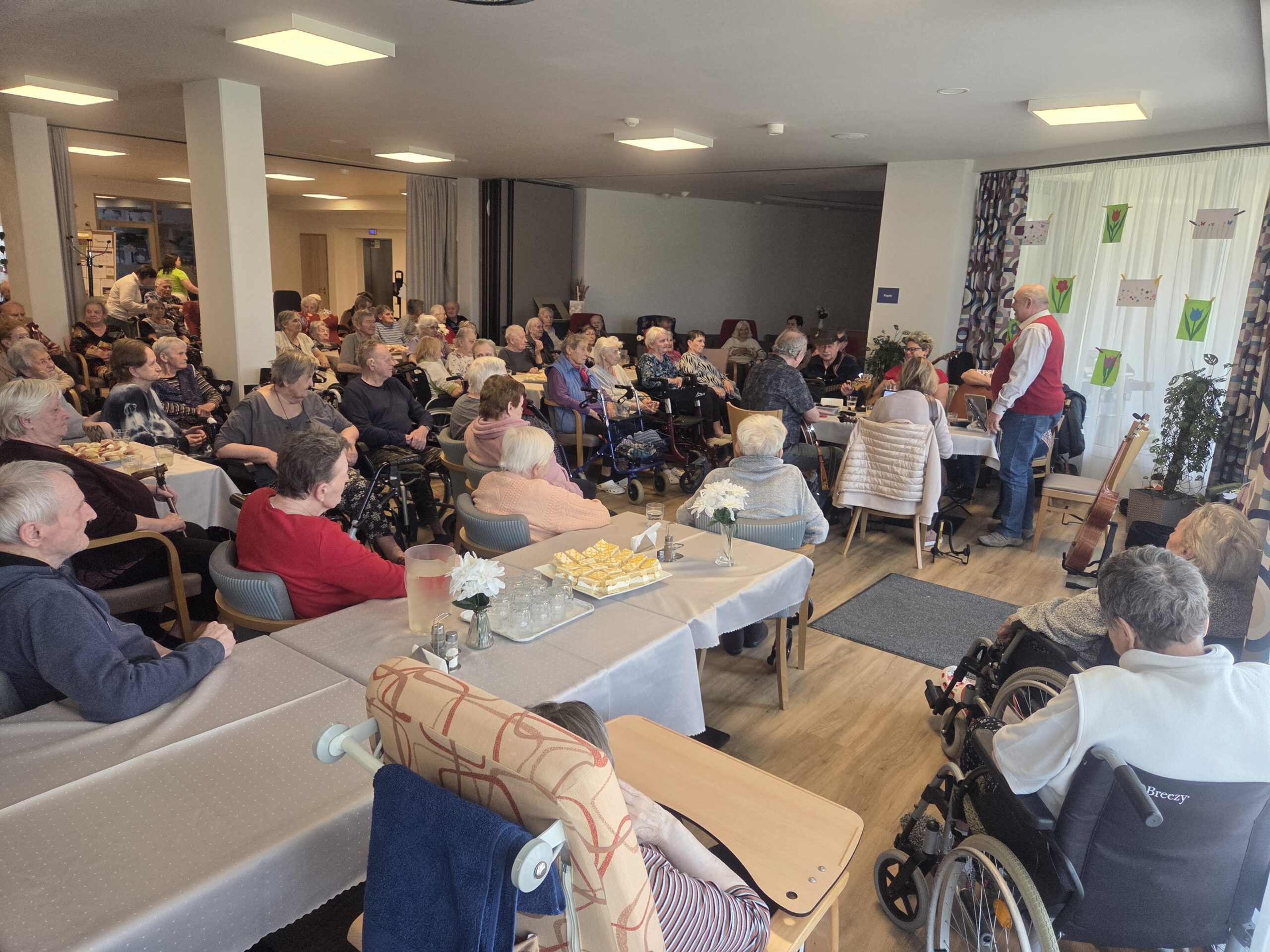 Slavnostní odpoledne se neslo v příjemné a přátelské atmosféře. Jídelna byla vyzdobena jarními květinami a nechyběly ani drobné dárky pro naše klientky.