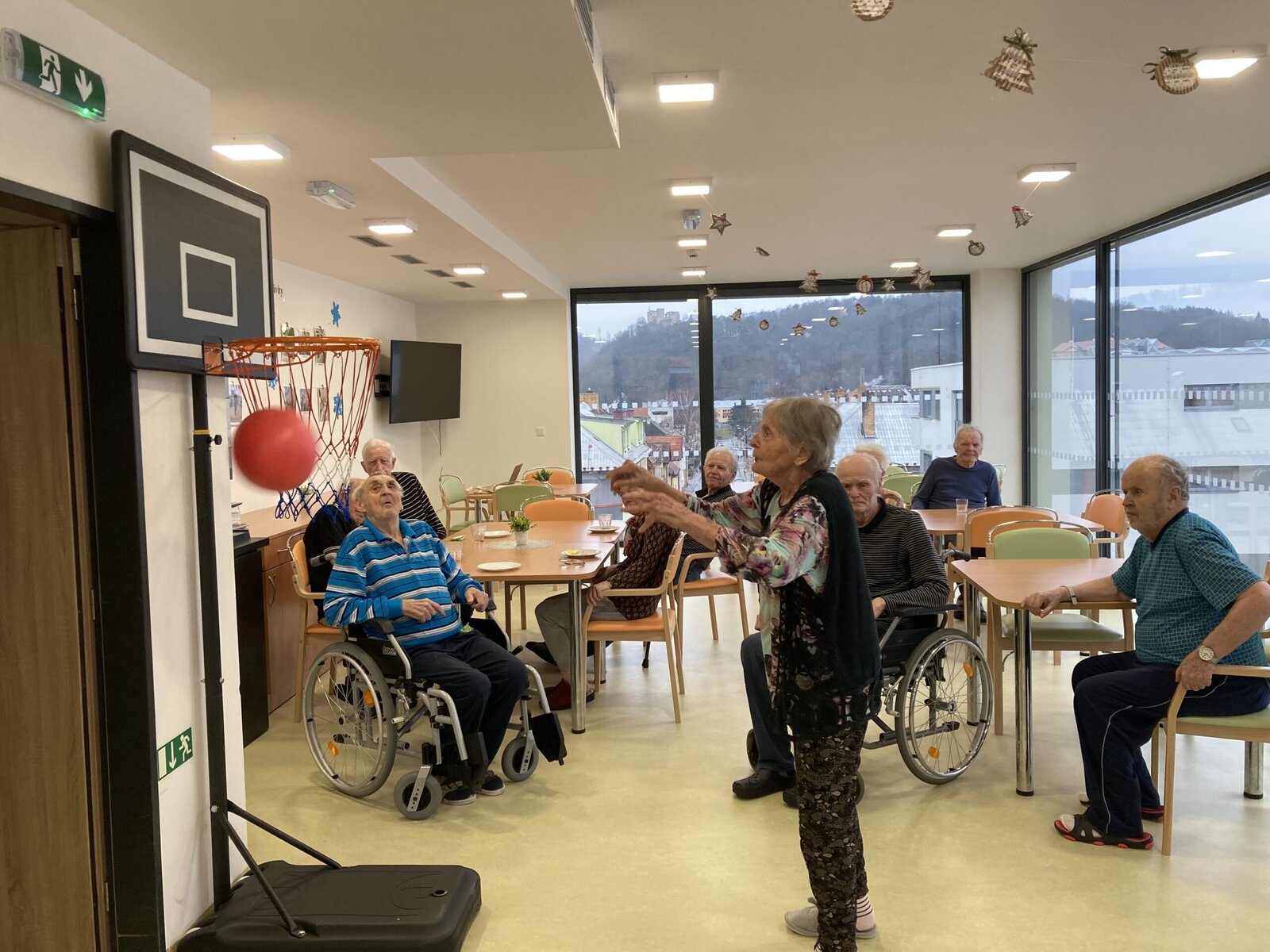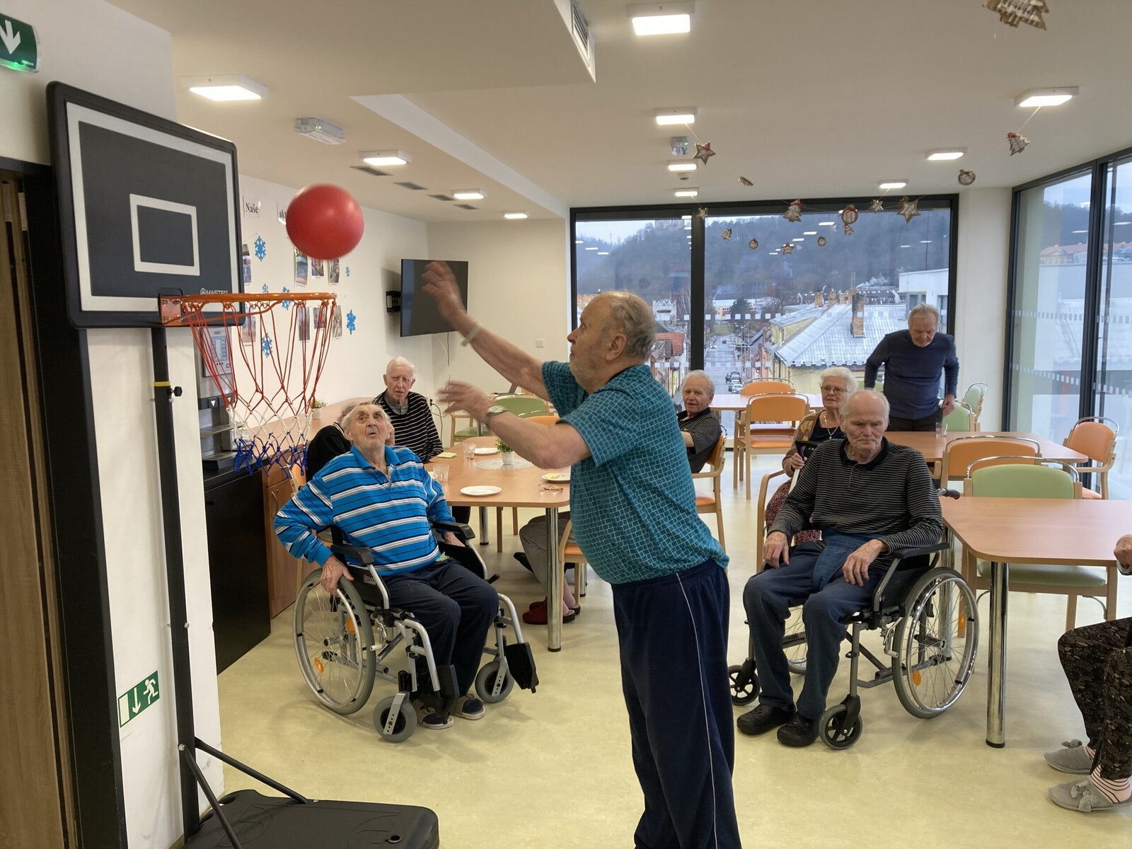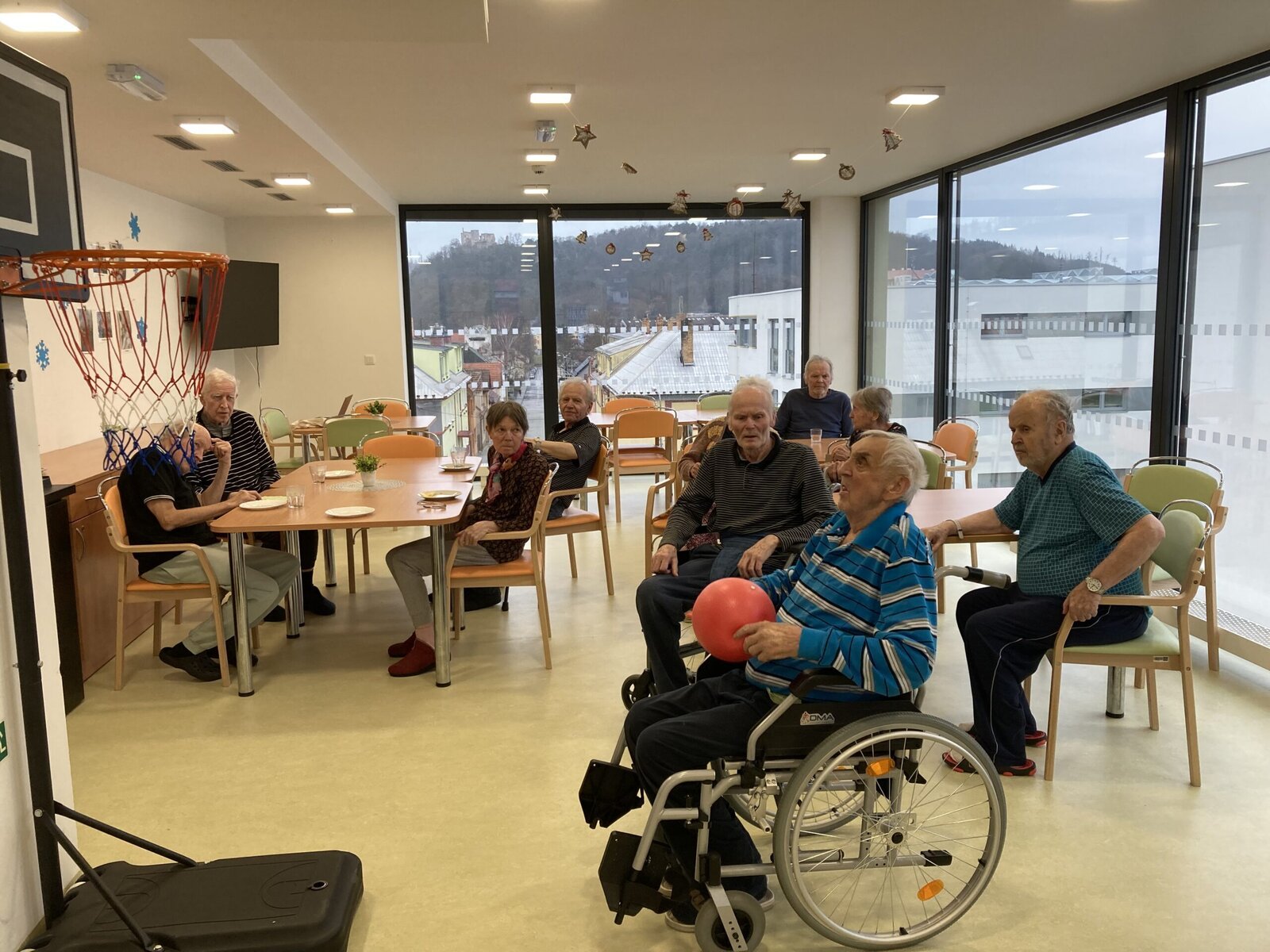 Každý pátek hrají naši klienti různé míčové hry! Dnes jsme si vyzkoušeli nový basketbalový koš, který klienti dostali díky projektu Ježíškova vnoučata. A druhá skupina klientů procvičovala psychomotoriku pomocí barevného padáku. Tyto sportovní aktivity jsou u klientů velmi oblíbené hlavně v zimních měsících, kdy nemají možnost trávit čas na naší zahradě.