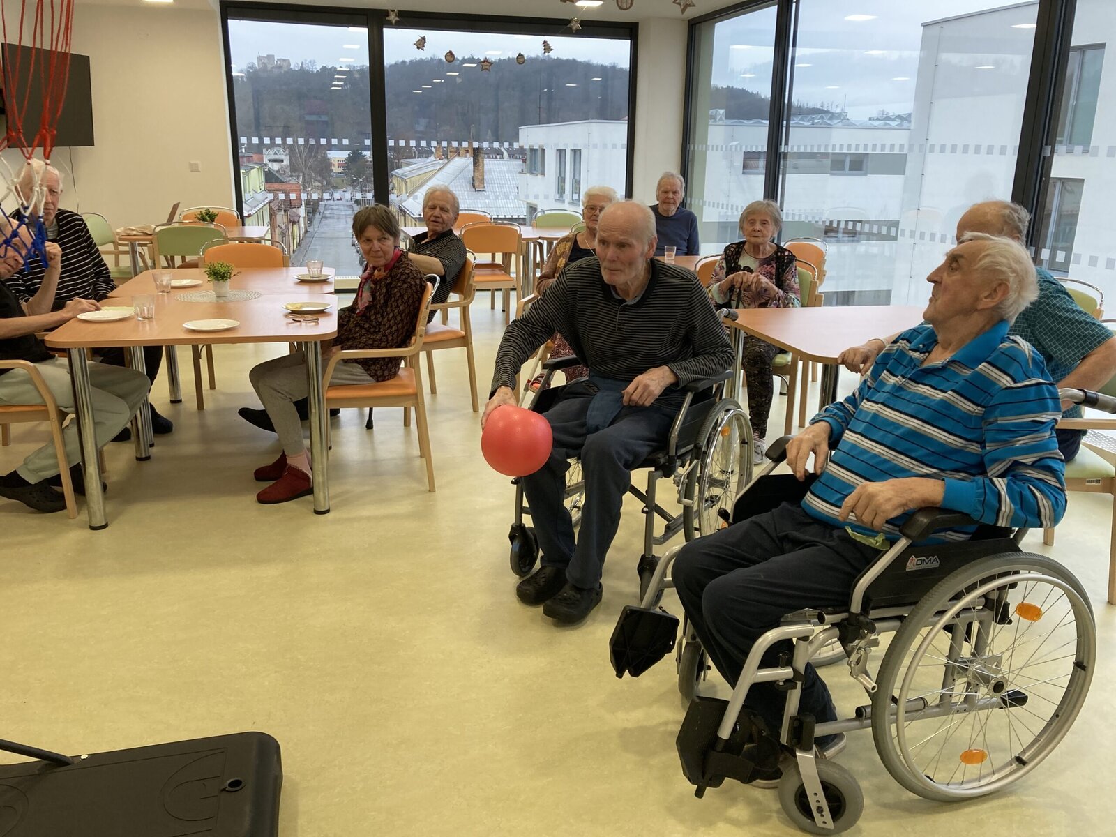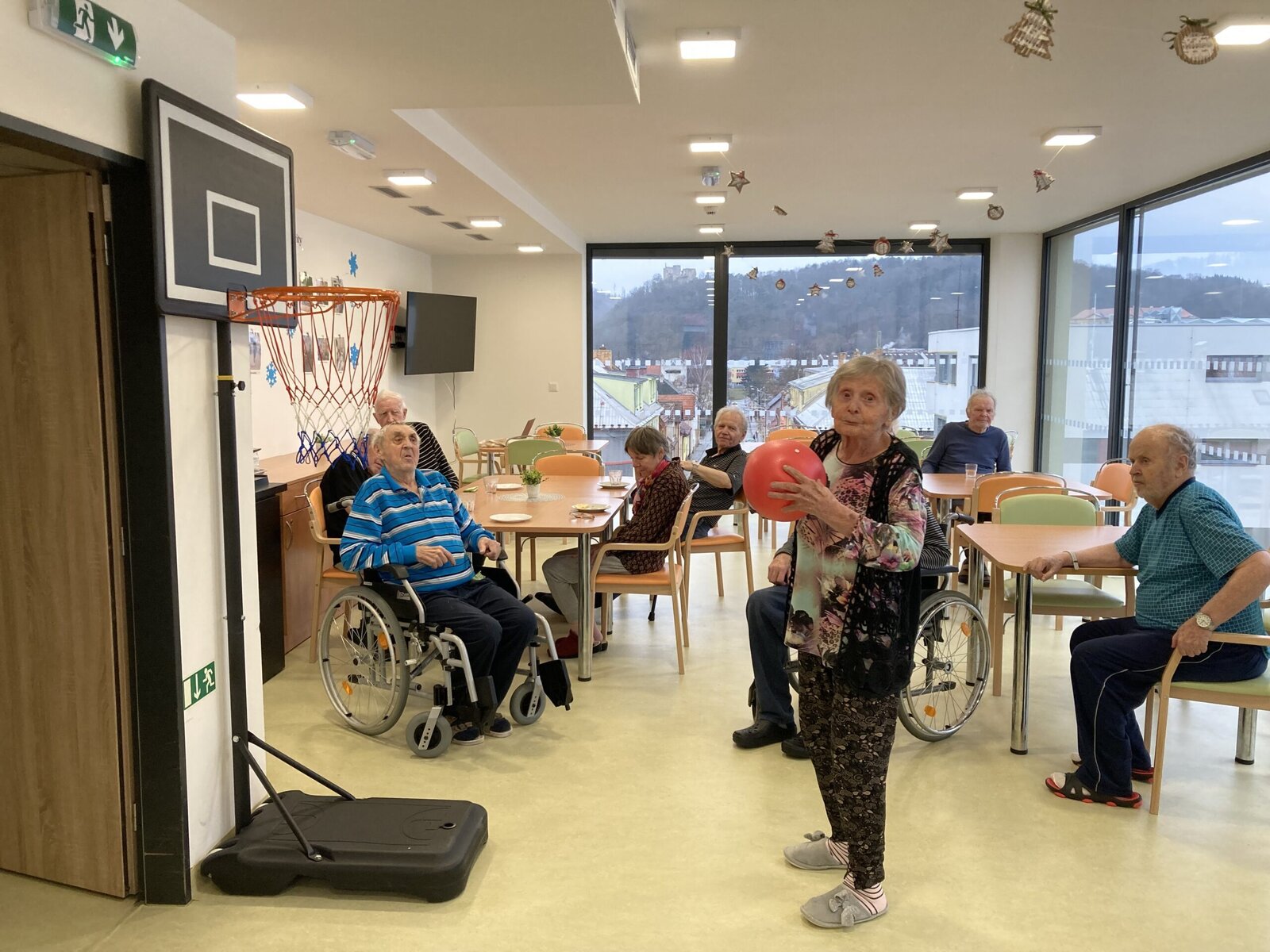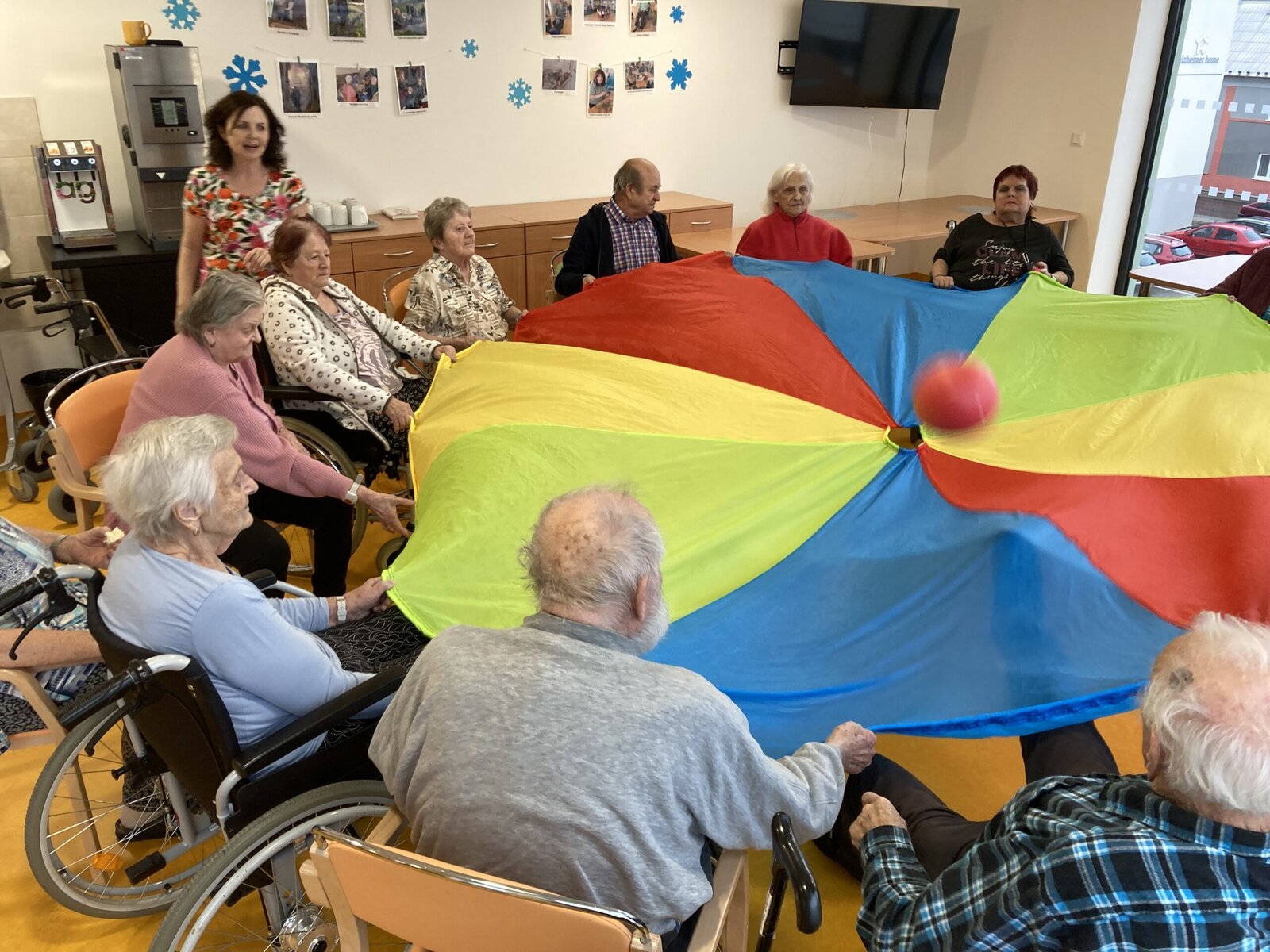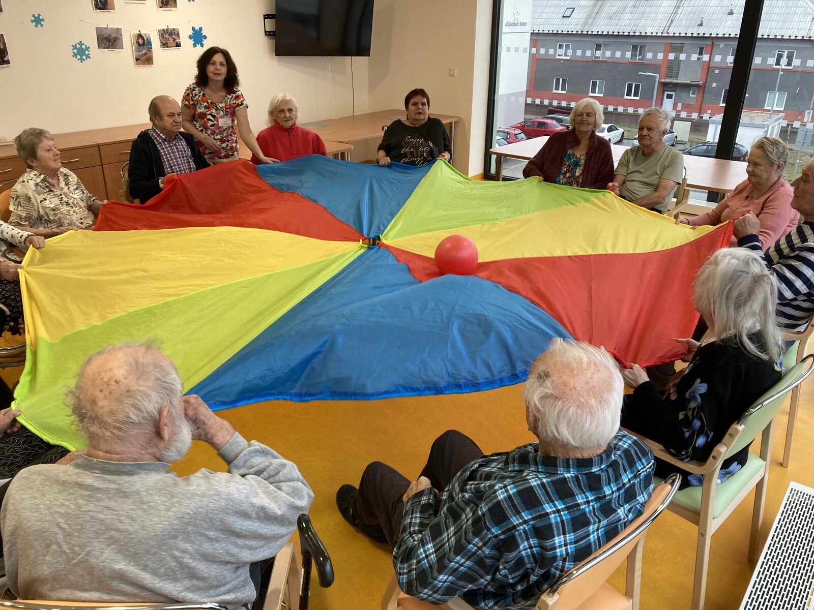 Každý pátek hrají naši klienti různé míčové hry! Dnes jsme si vyzkoušeli nový basketbalový koš, který klienti dostali díky projektu Ježíškova vnoučata. A druhá skupina klientů procvičovala psychomotoriku pomocí barevného padáku. Tyto sportovní aktivity jsou u klientů velmi oblíbené hlavně v zimních měsících, kdy nemají možnost trávit čas na naší zahradě.