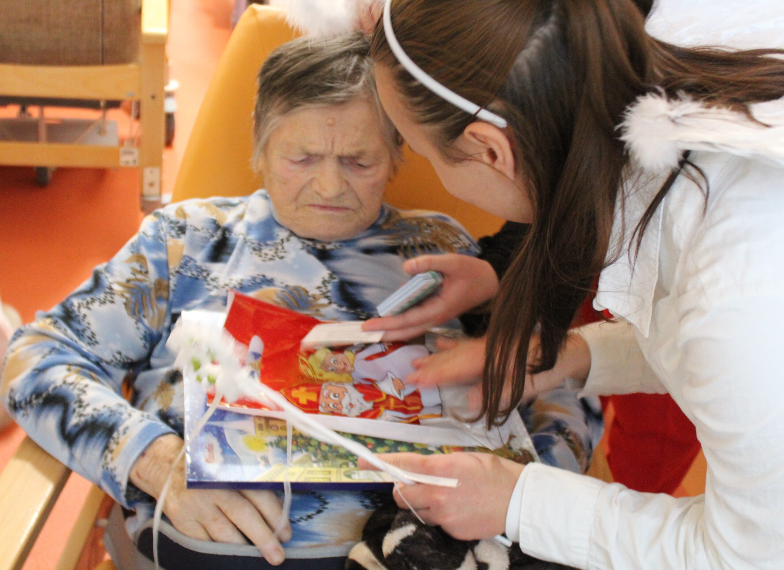 Mikuláš každému popřál krásný adventní čas a přinesl drobnou nadílku, která vykouzlila úsměvy na tvářích všech přítomných. Klienti za nadílku Mikulášské družině zazpívali.