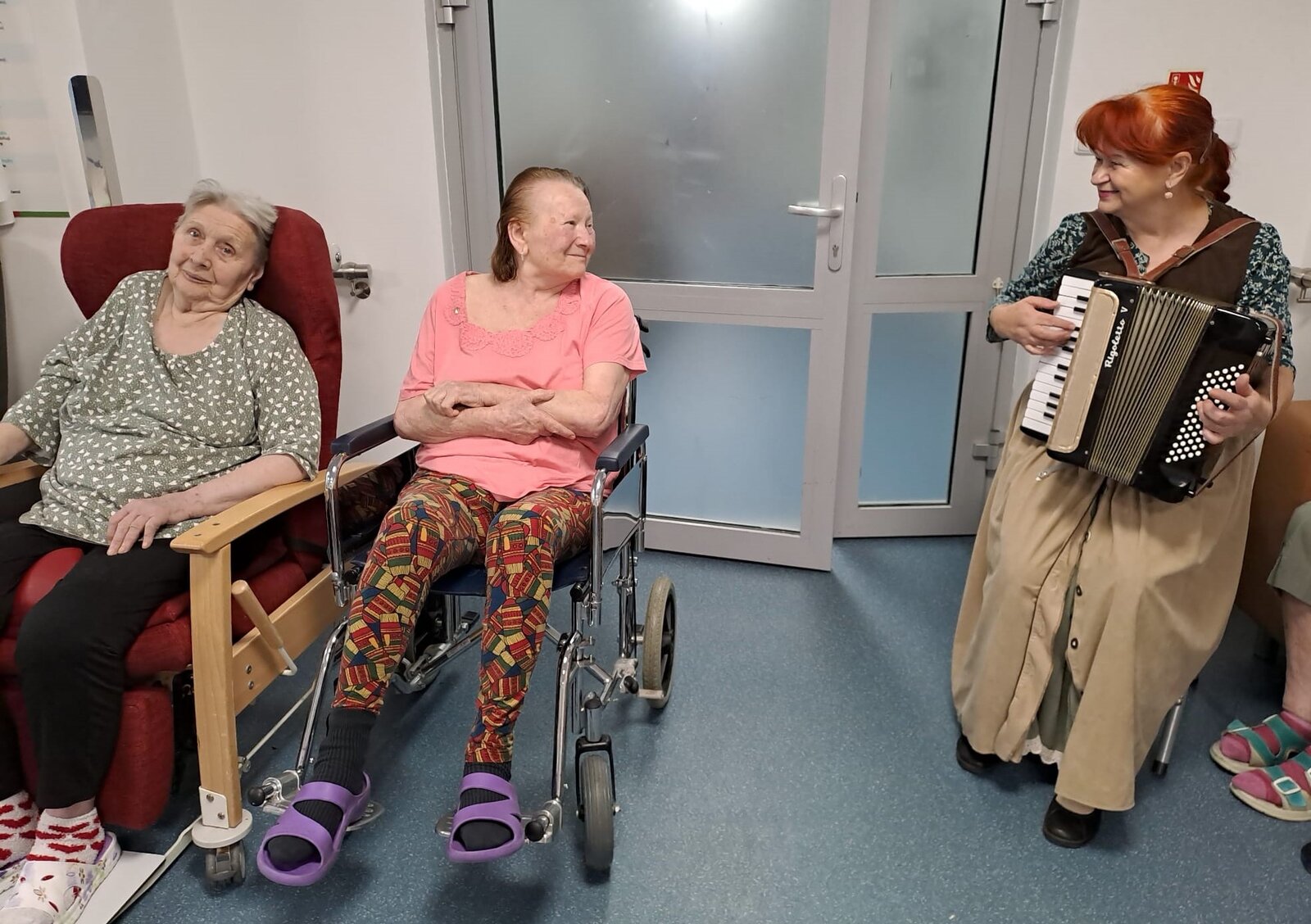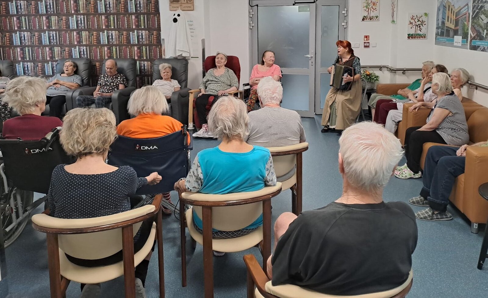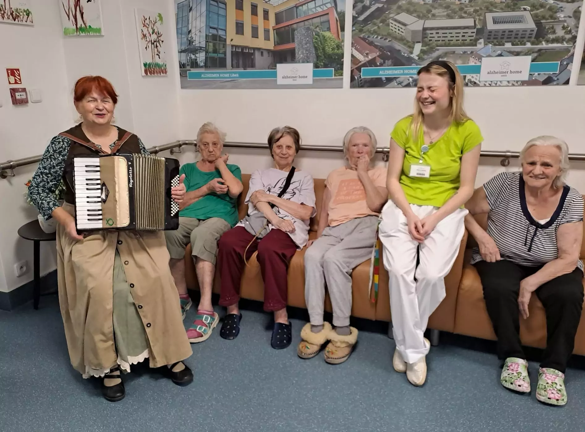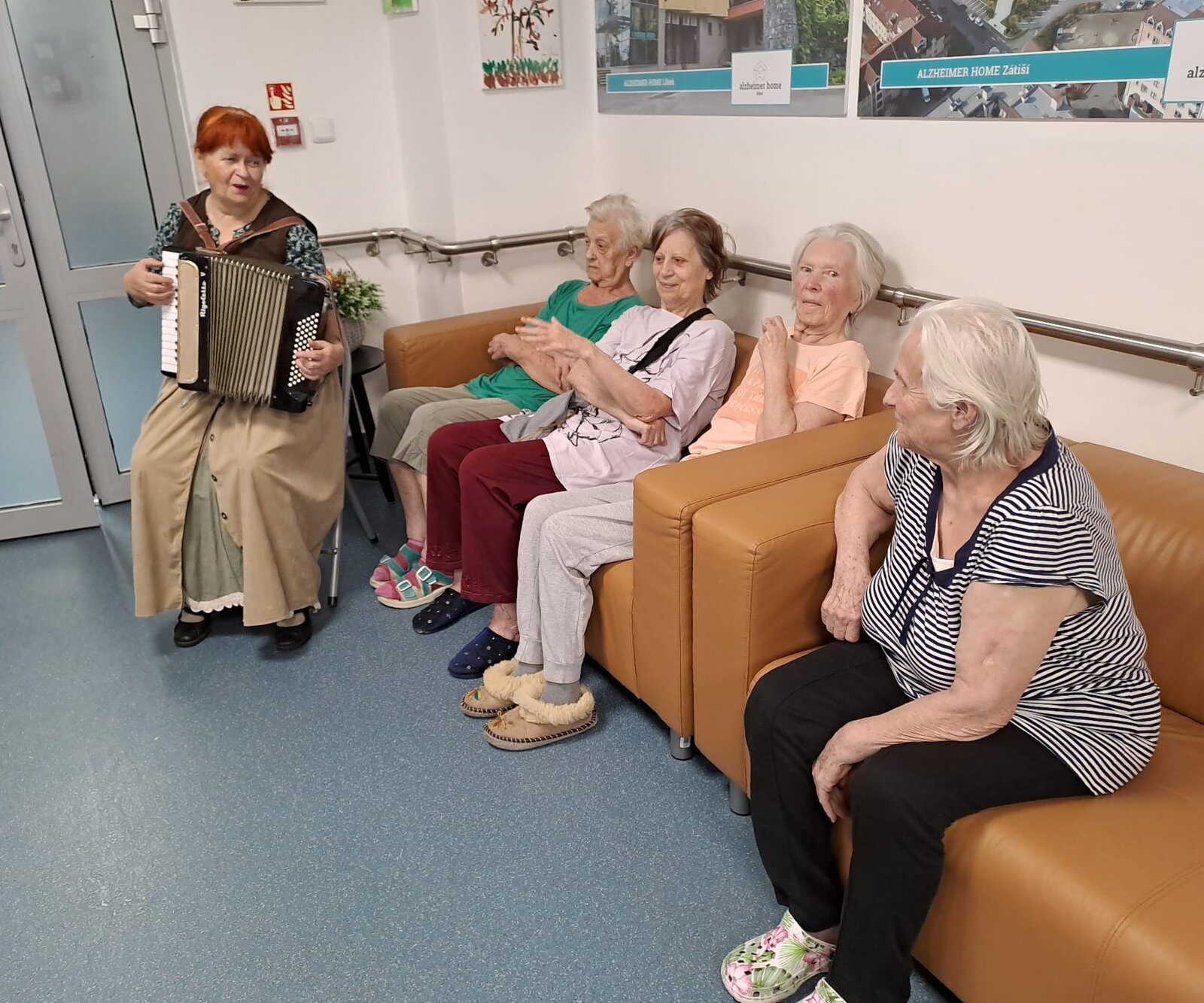 ALZEIMER HOME Ostrov navštívila paní harmonikářka, která svým vystoupením přinesla klientům radost a pohodu. Oblékla se do stylového dobového kostýmu, který krásně podtrhl atmosféru jejího hudebního vystoupení. S velkým nasazením zahrála známé staré písničky, které okamžitě rozezpívaly naše klienty. Nezůstalo však jen u hudby – paní harmonikářka si pro všechny připravila i zajímavé povídání, plné veselých historek a zajímavostí z minulosti.