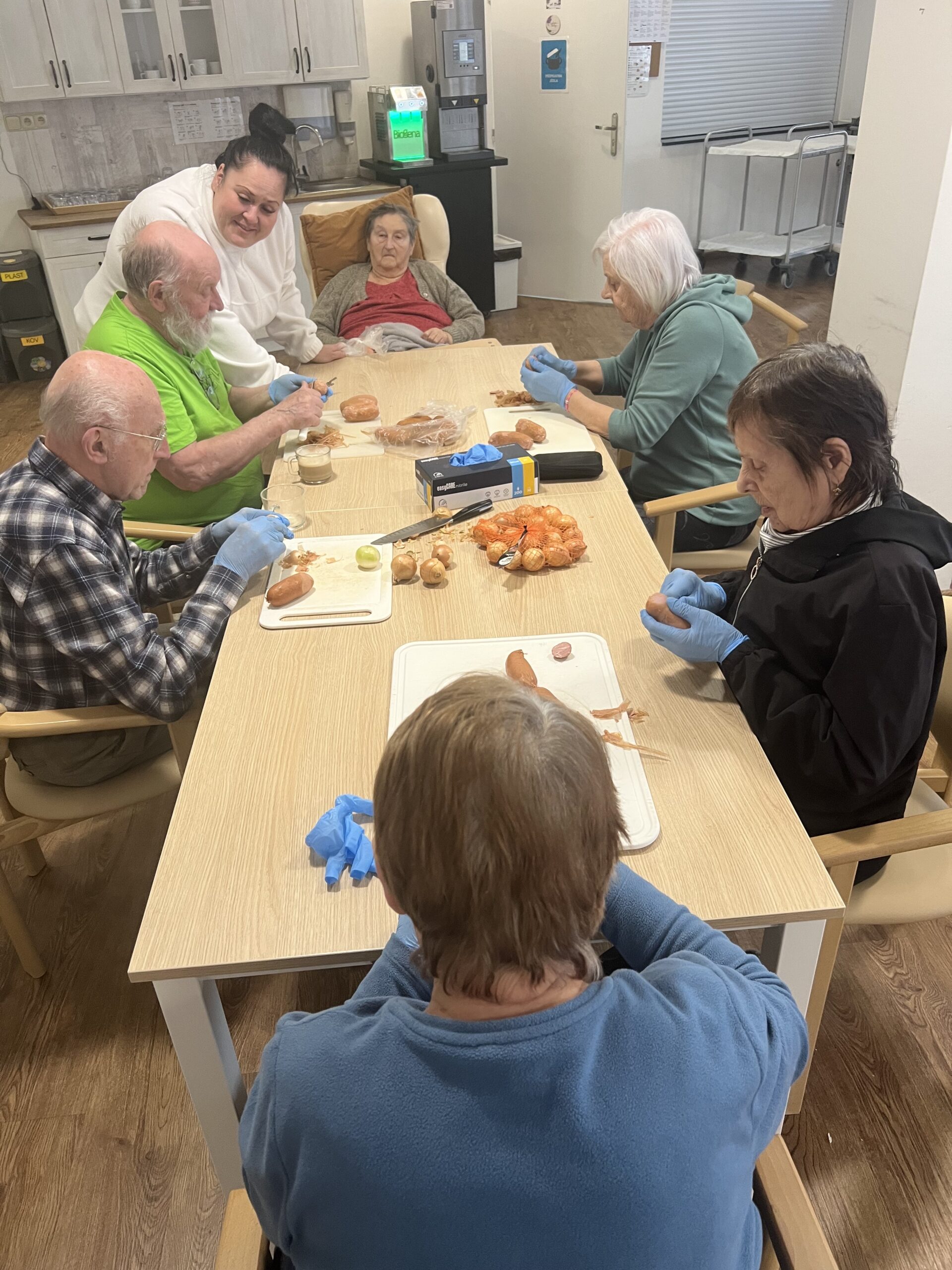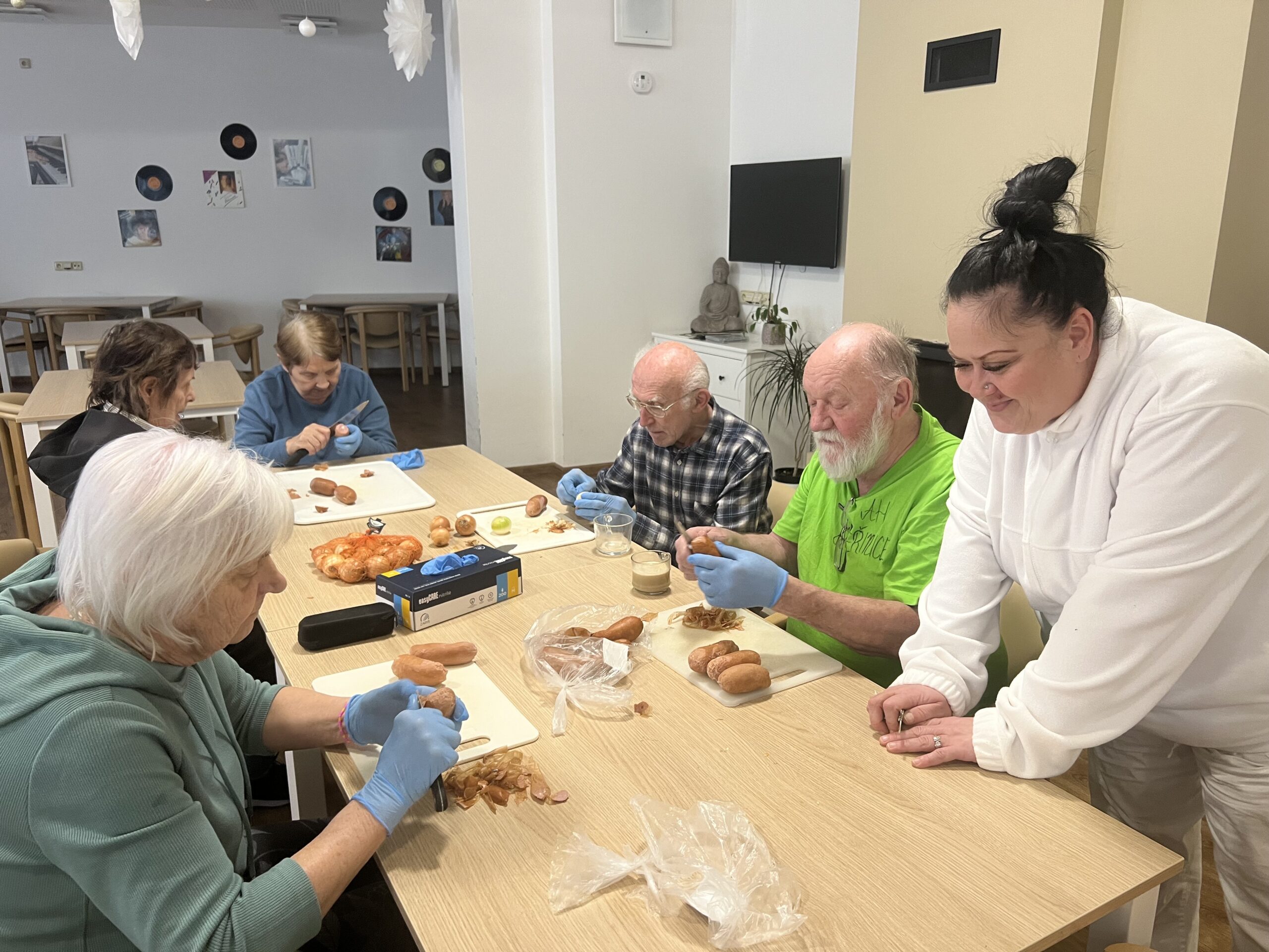 Dnes odpoledne jsme si trochu poplakali nad cibulí a nadělali si chutě při loupání špekáčků. Na zaslouženou odměnu své práce si bohužel budeme muset alespoň týden počkat, než se špekáčky správně proleží. Už se moc těšíme!