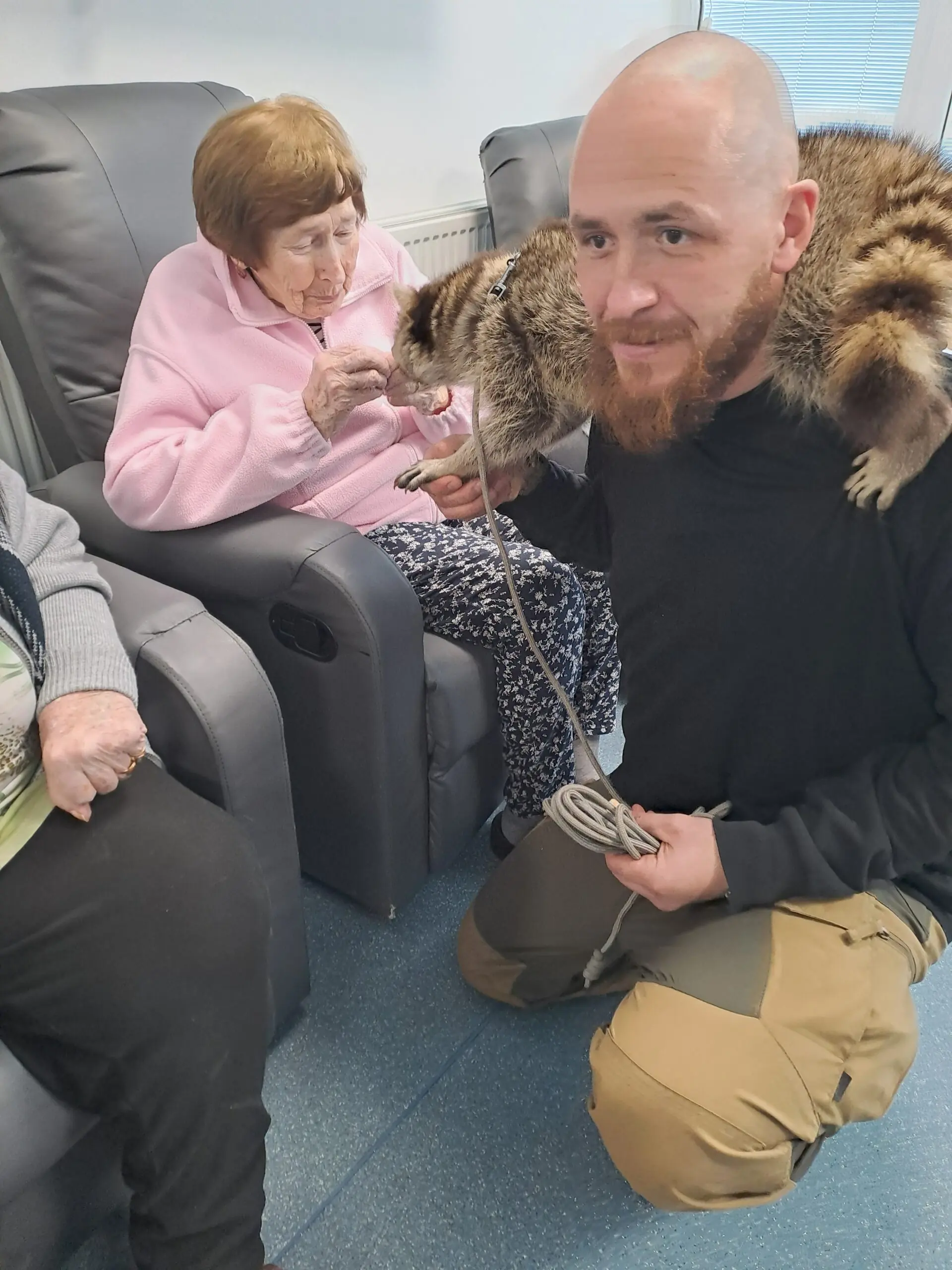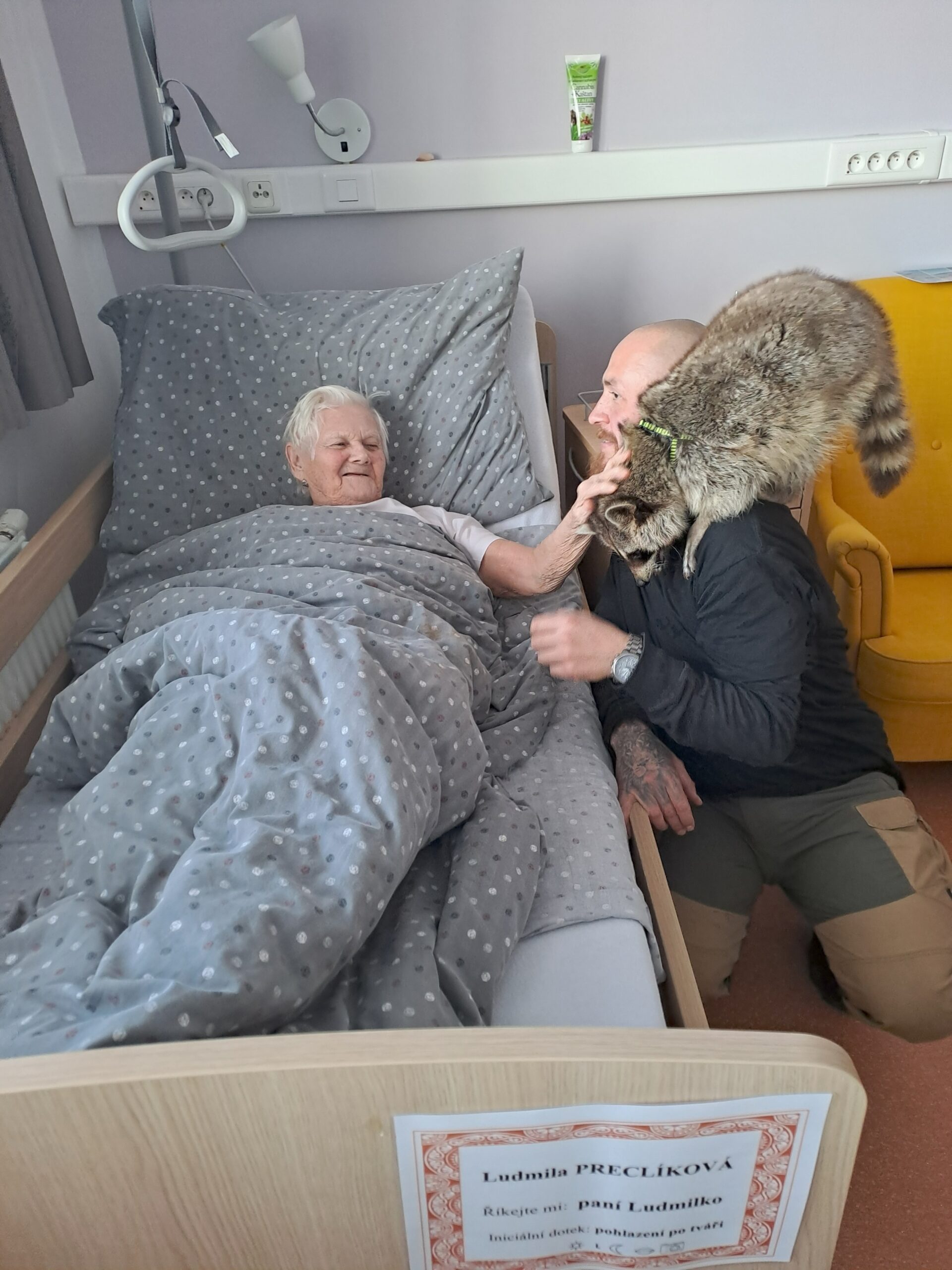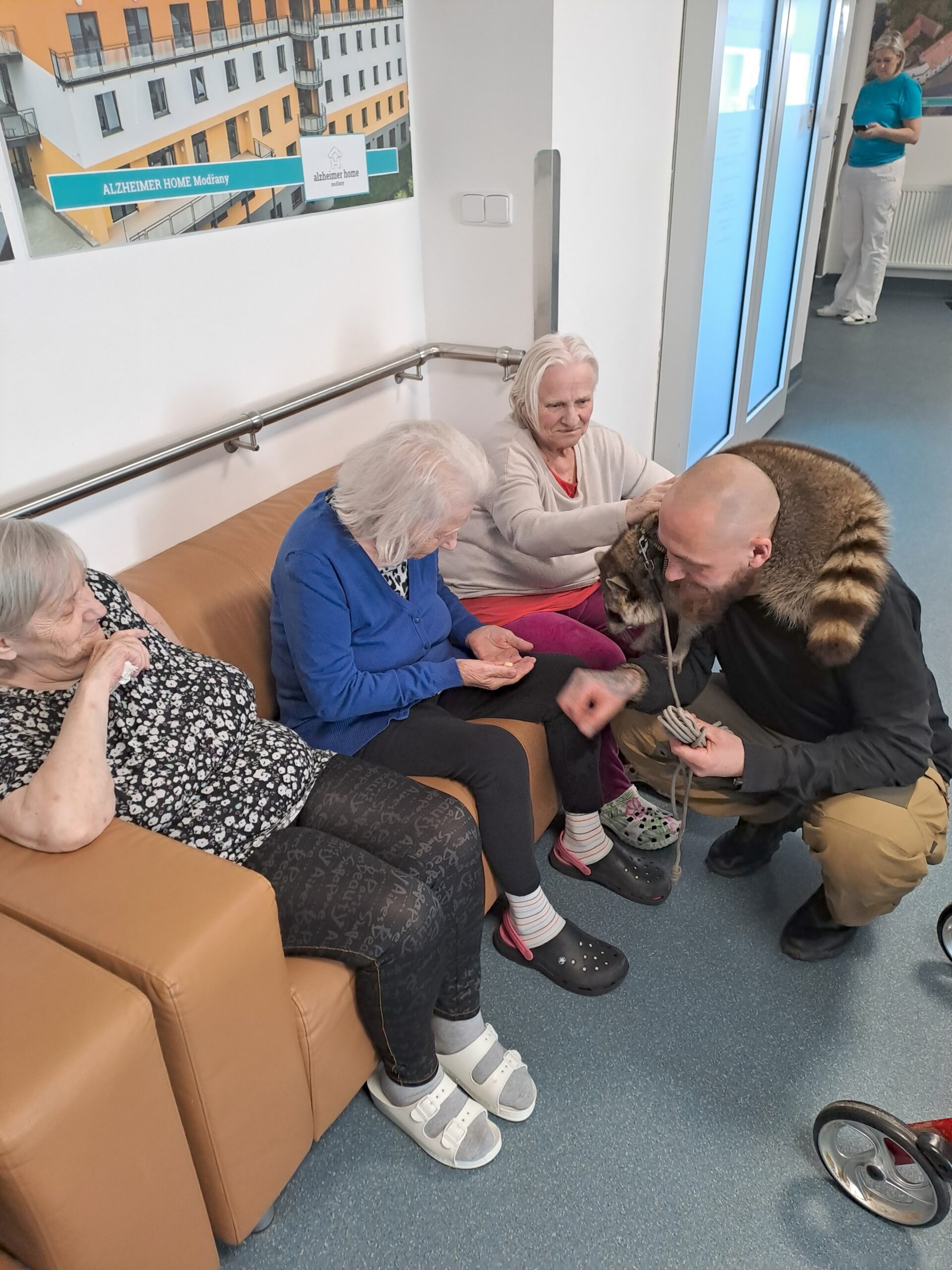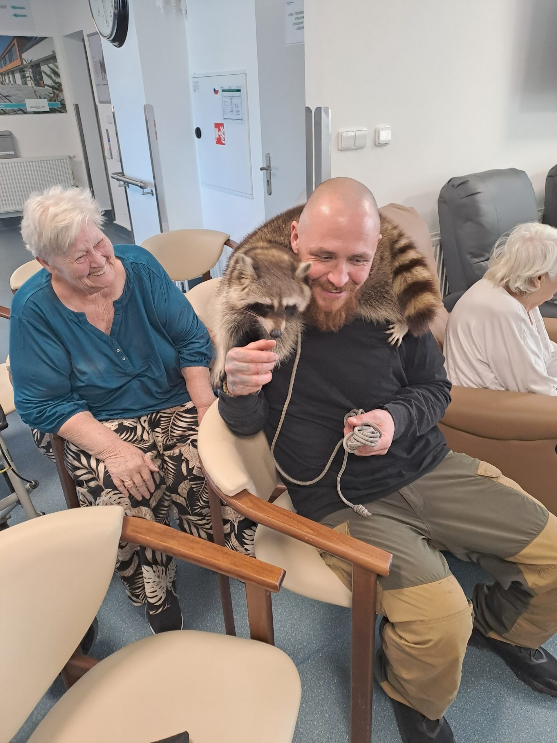 V našem zařízení jsme zvyklí na návštěvy zvířecích kamarádů, ale tentokrát byla opravdu netradiční. Navštívit nás přijel pan Jaroš s mývalem. Byli jsme velmi překvapení, když se mýval ničeho nebál a nechal se hladit, krmit piškoty a prohlédnout si drápky.