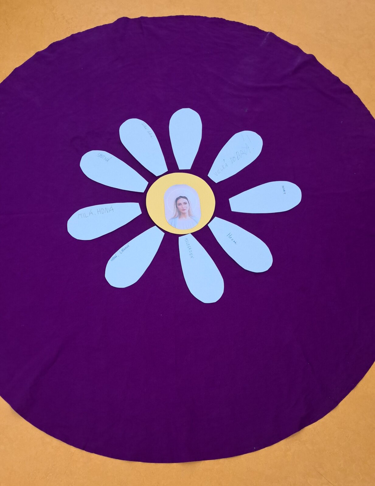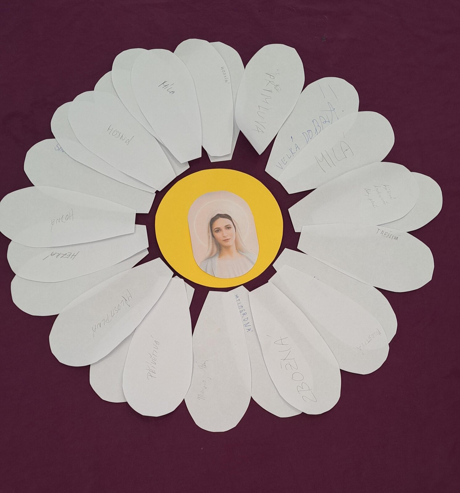 Z jednotlivých lístků jsme poté společně vytvořili symbolický květ, každý lístek představoval jeden okvětní plátek. Celý květ pak jako celek symbolizoval Pannu Marii – něžnou, laskavou a ochraňující Matku. 😊