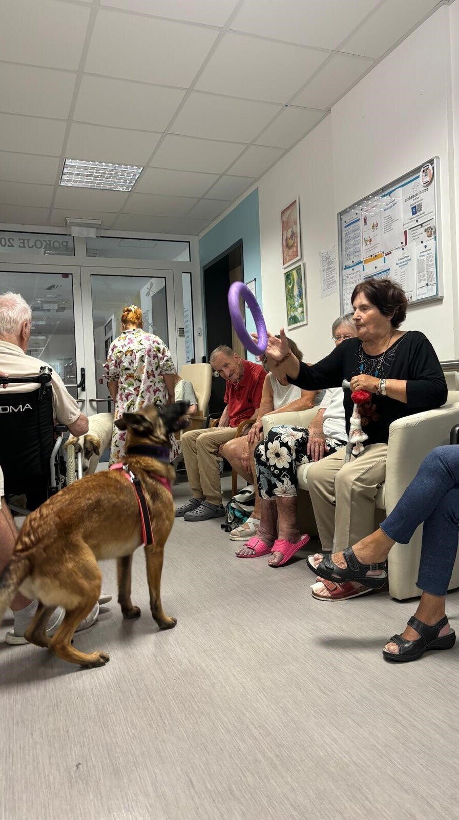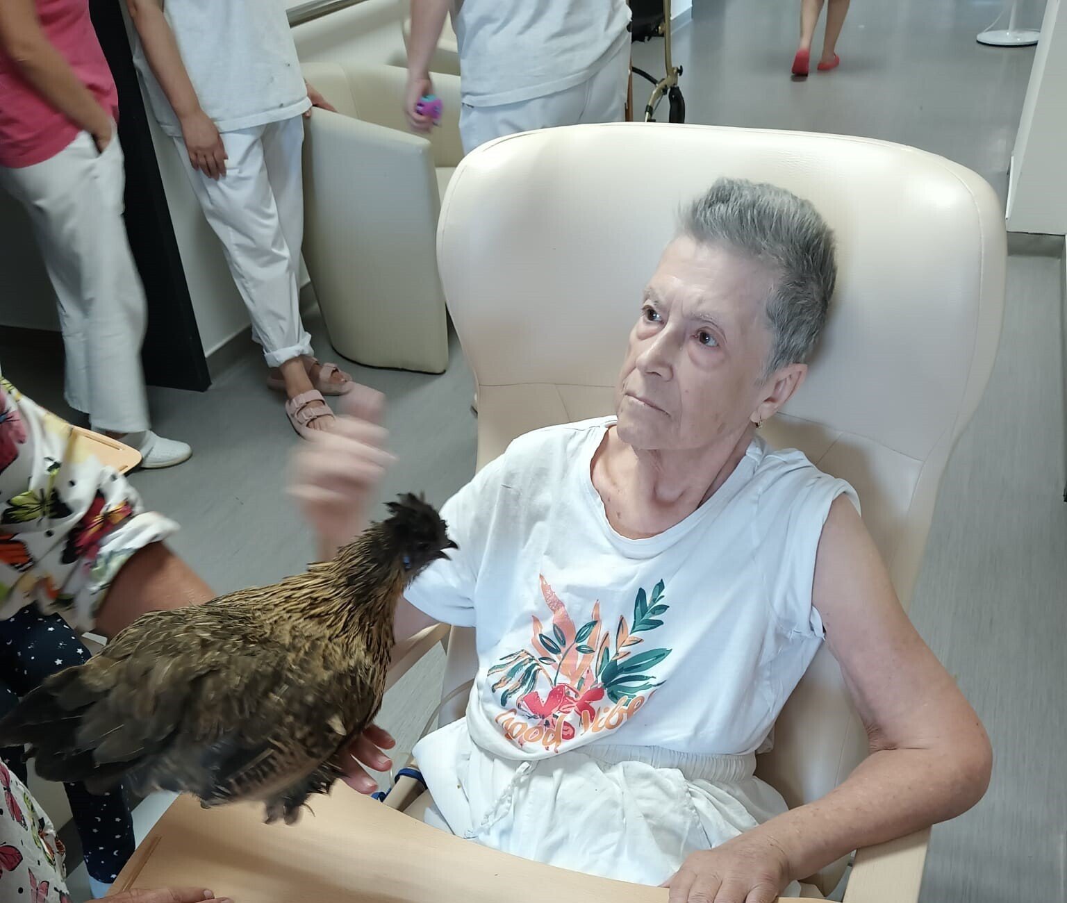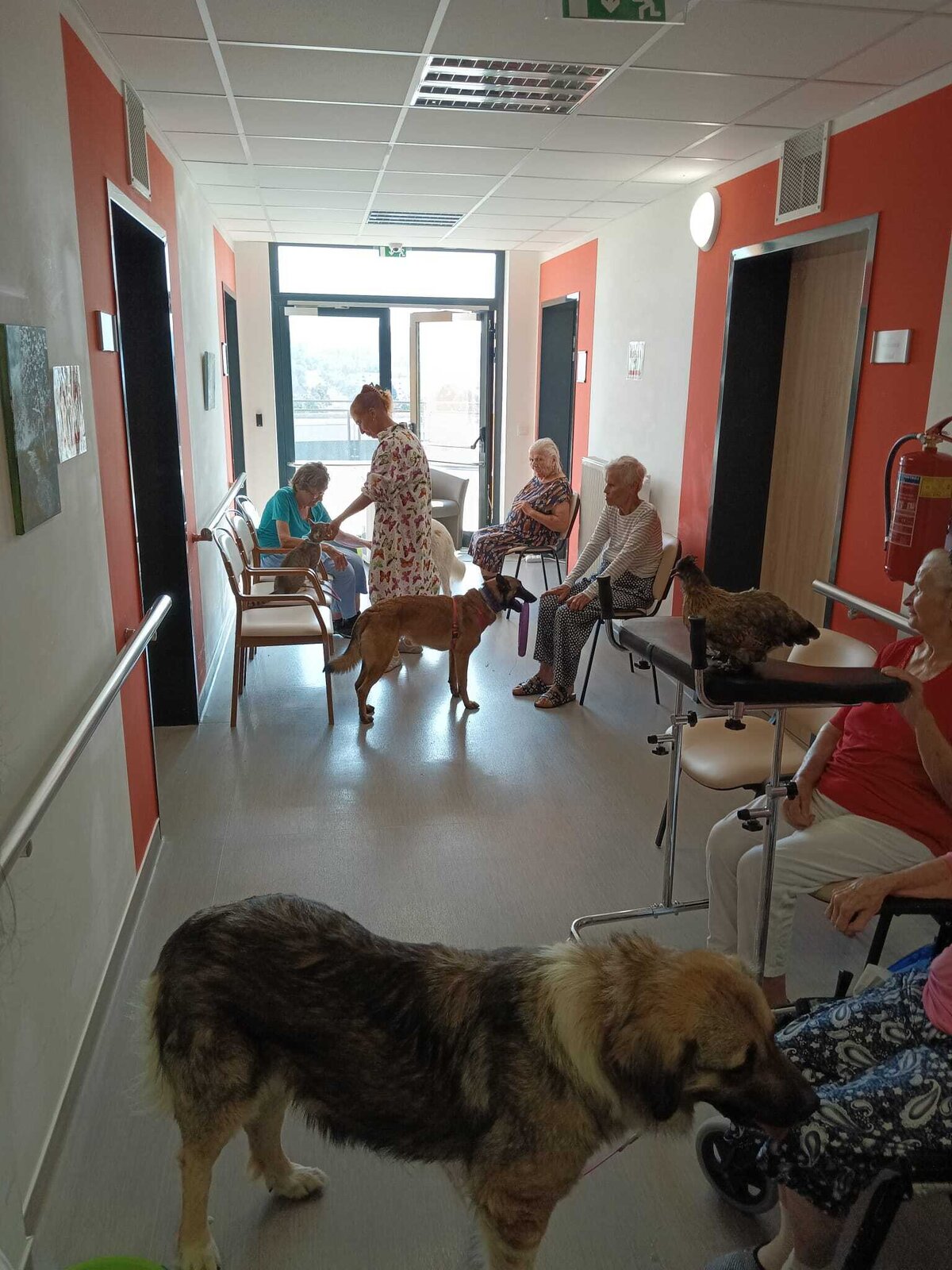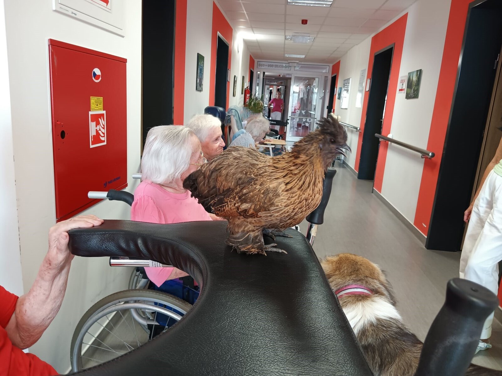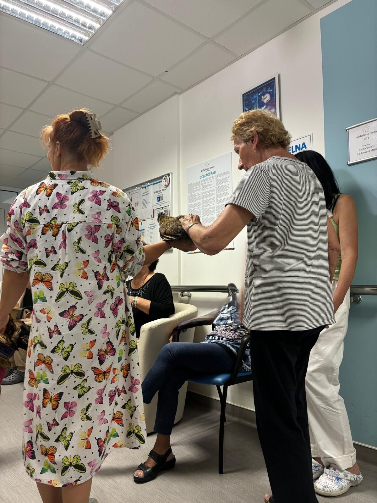 Ve čtvrtek odpoledne nás znovu navštívila zvířata z Boušic s majitelkou Evou. Kvůli vysokým teplotám jsme raději zvolili návštěvu klientů na pokojích. Náš zvířecí tým se skládal ze psů, slepic, kohouta, kocoura a králíka. O zábavu bylo opět postaráno. 😀🩵