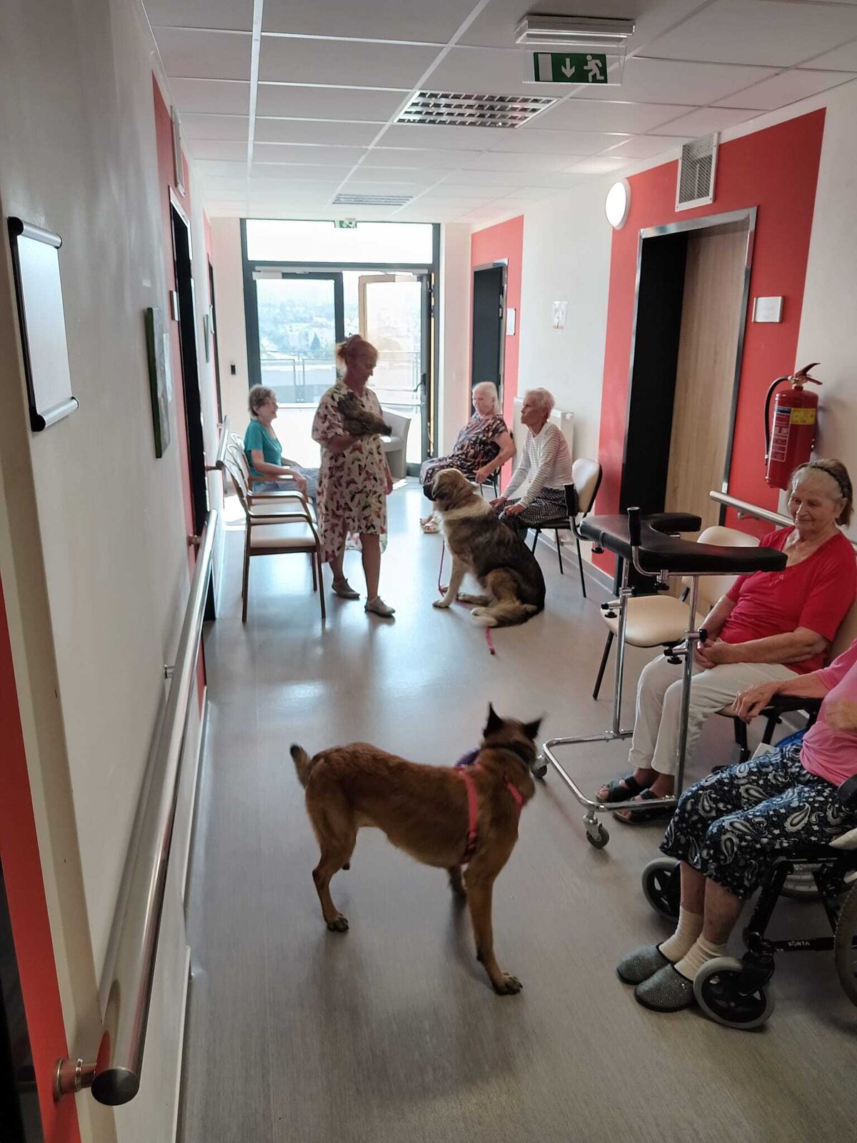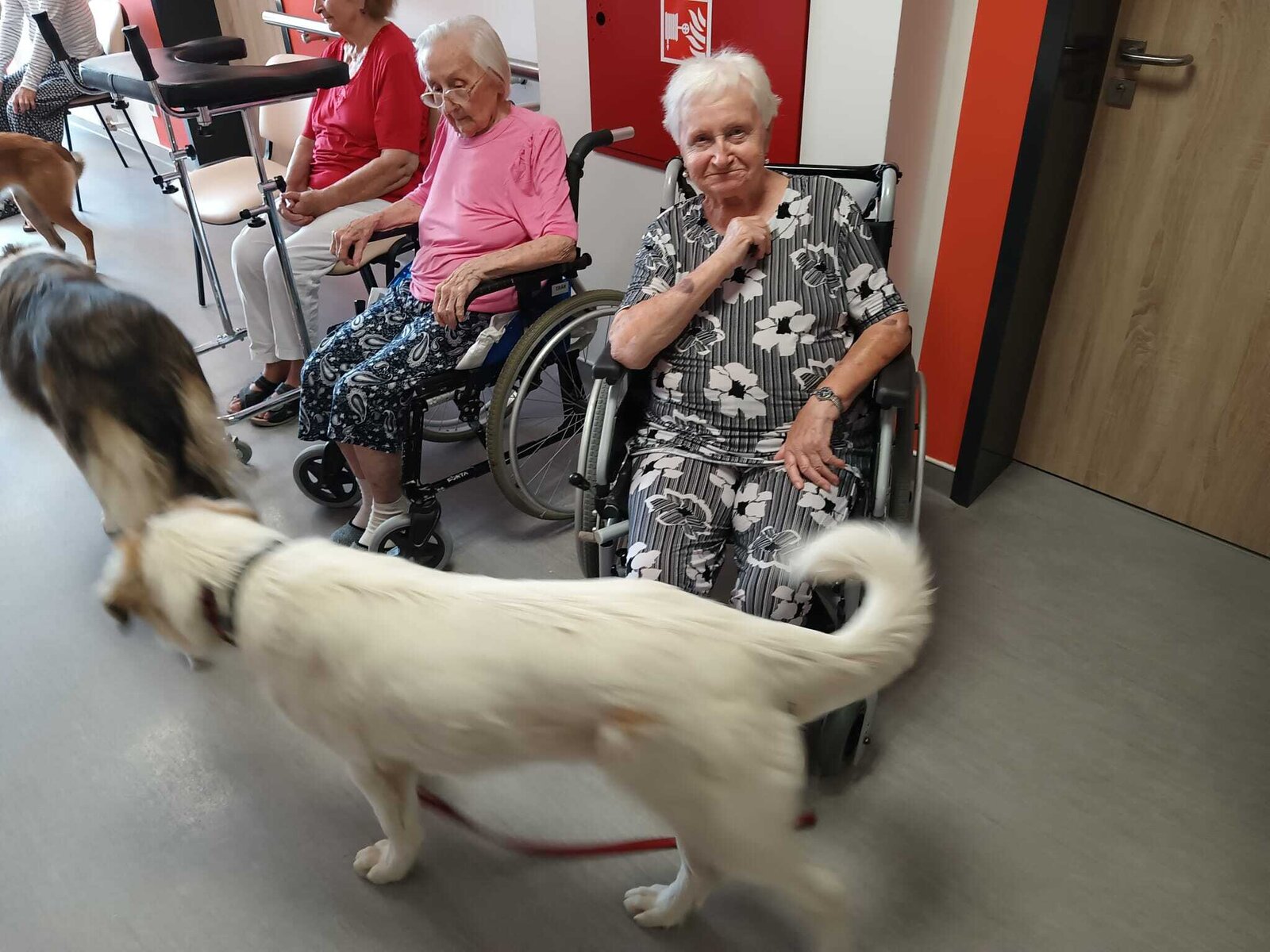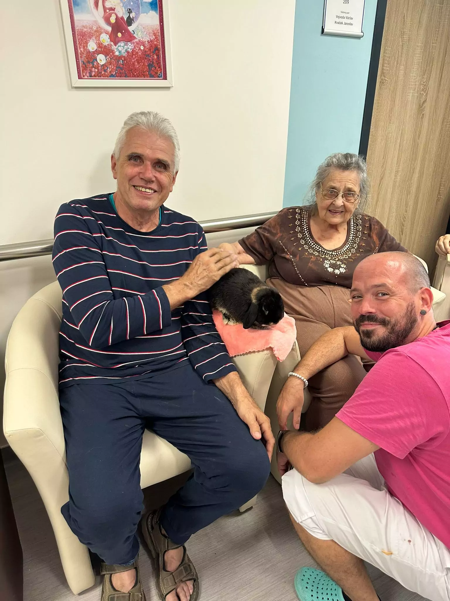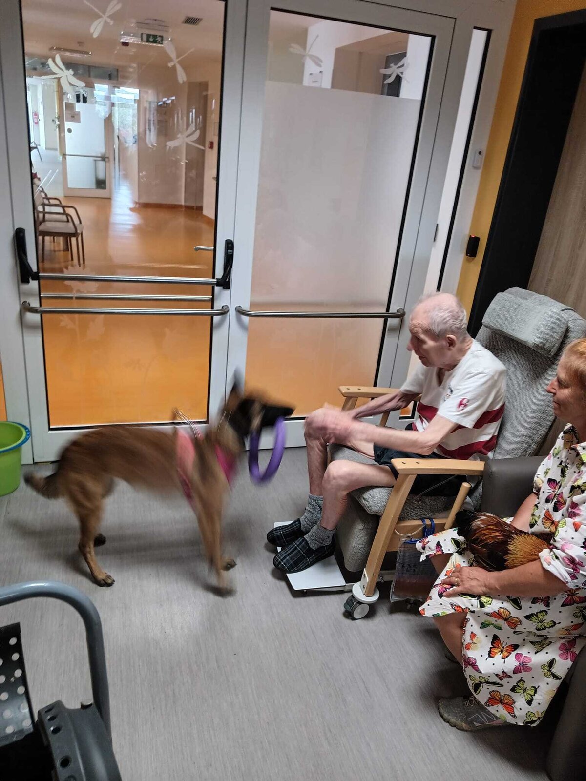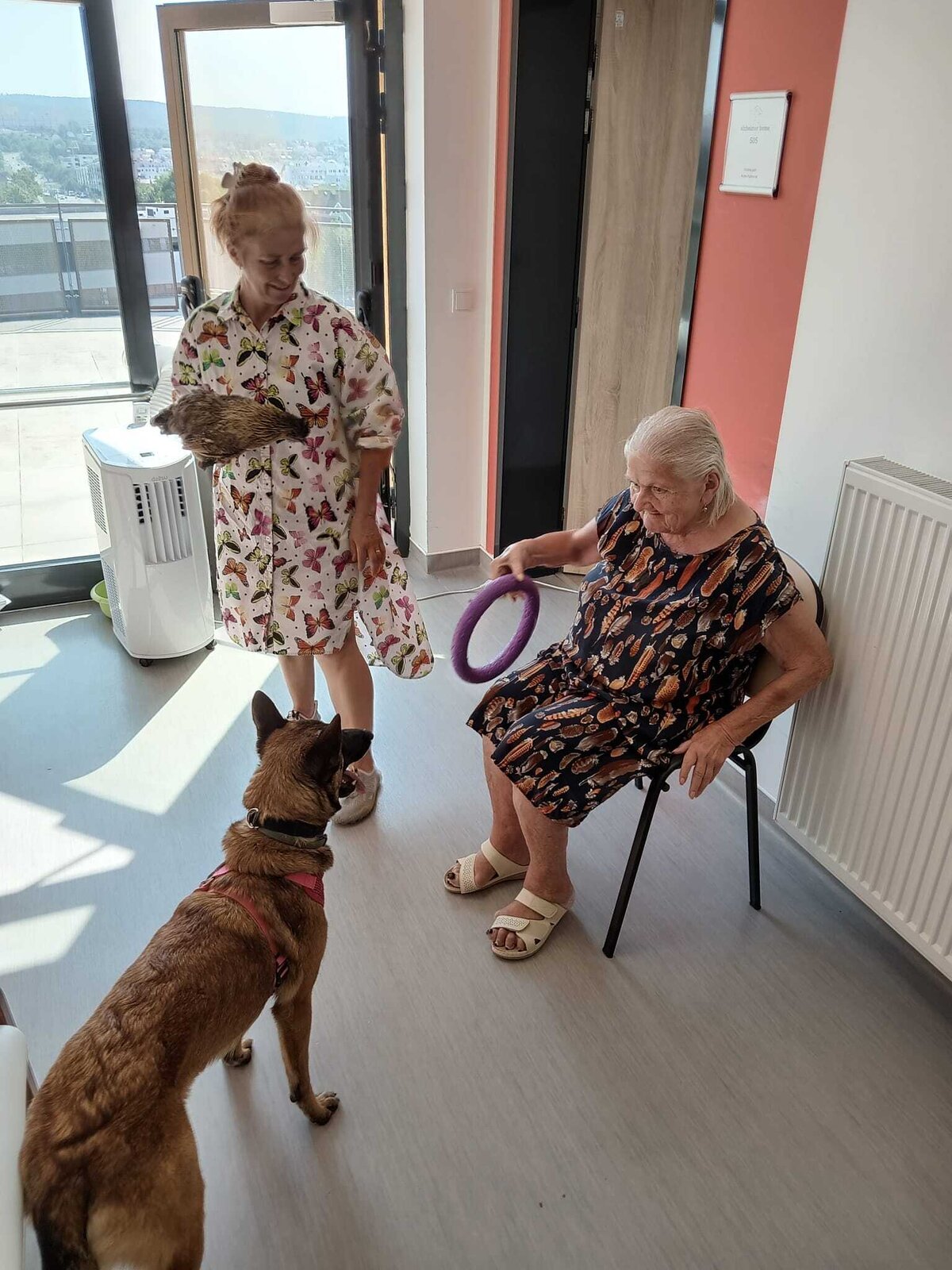 Ve čtvrtek odpoledne nás znovu navštívila zvířata z Boušic s majitelkou Evou. Kvůli vysokým teplotám jsme raději zvolili návštěvu klientů na pokojích. Náš zvířecí tým se skládal ze psů, slepic, kohouta, kocoura a králíka. O zábavu bylo opět postaráno. 😀🩵