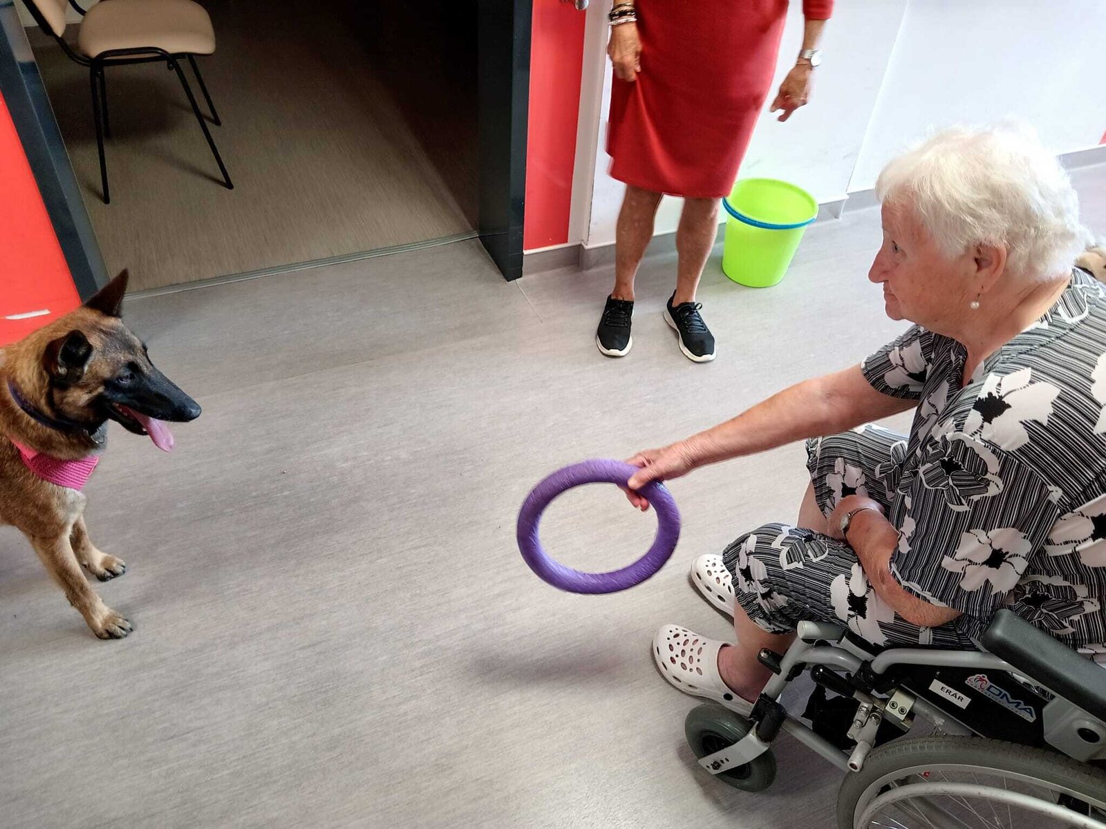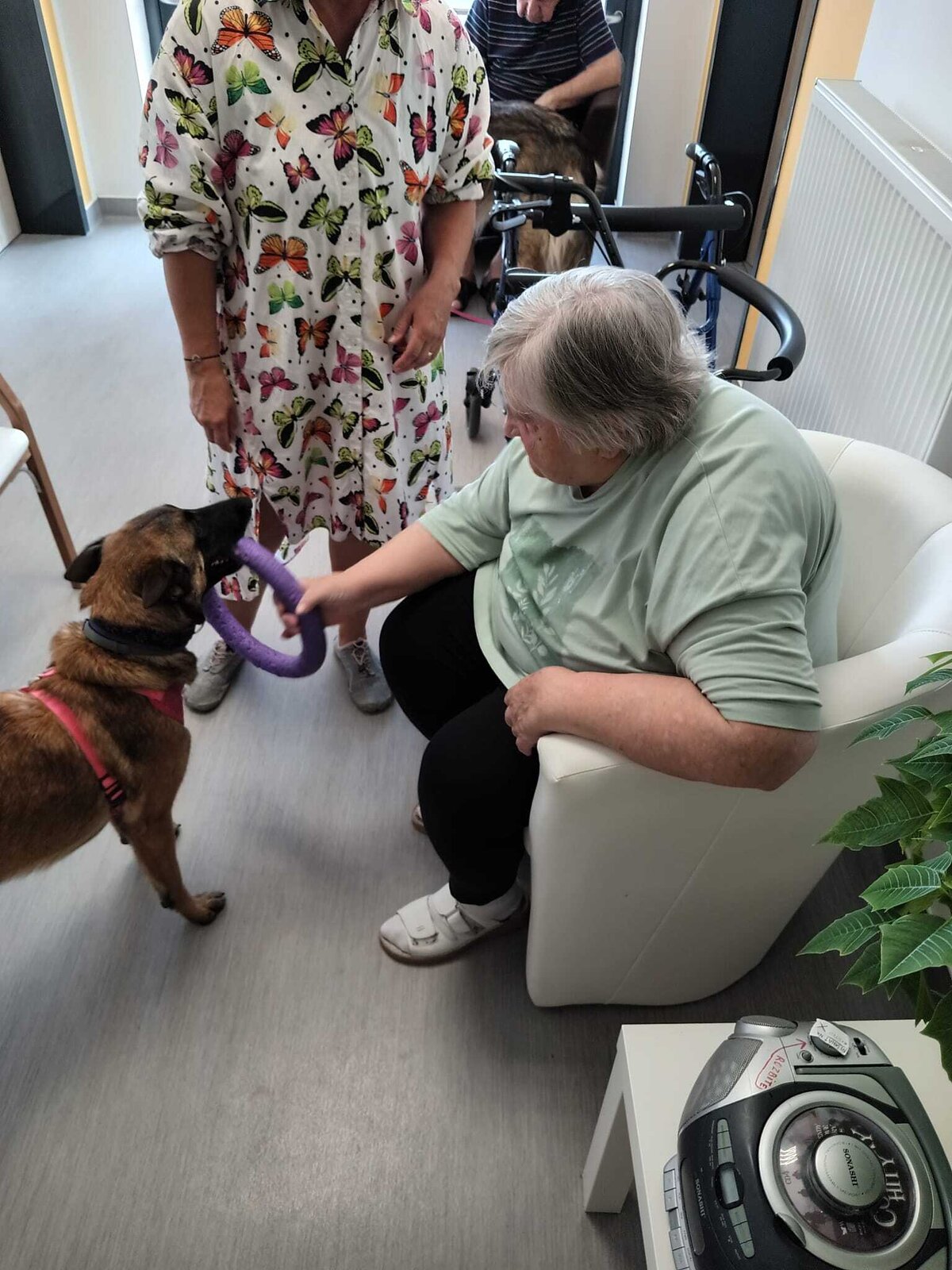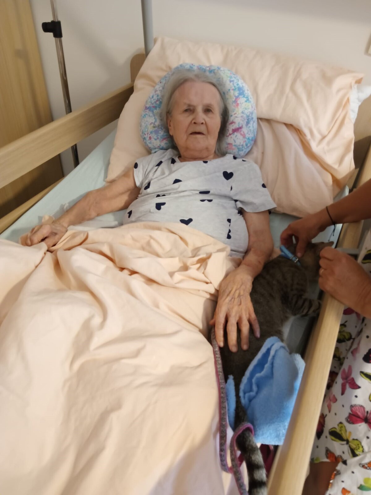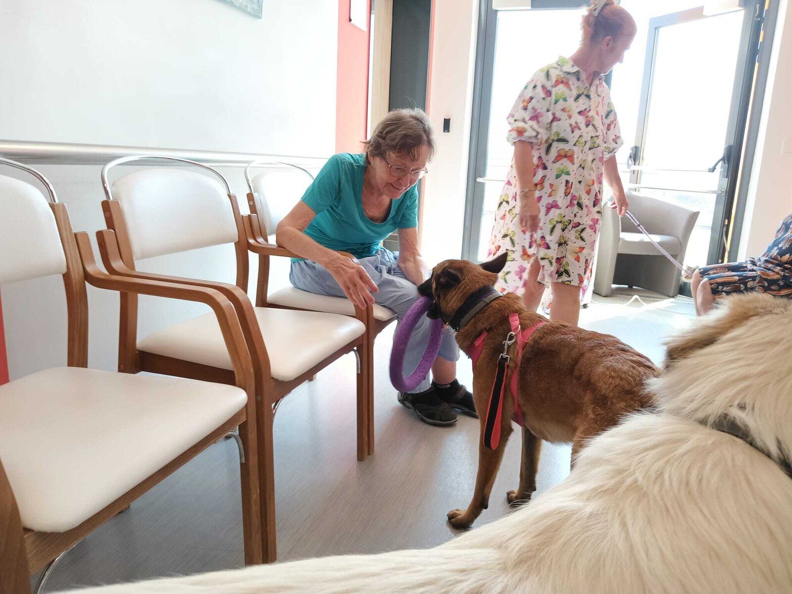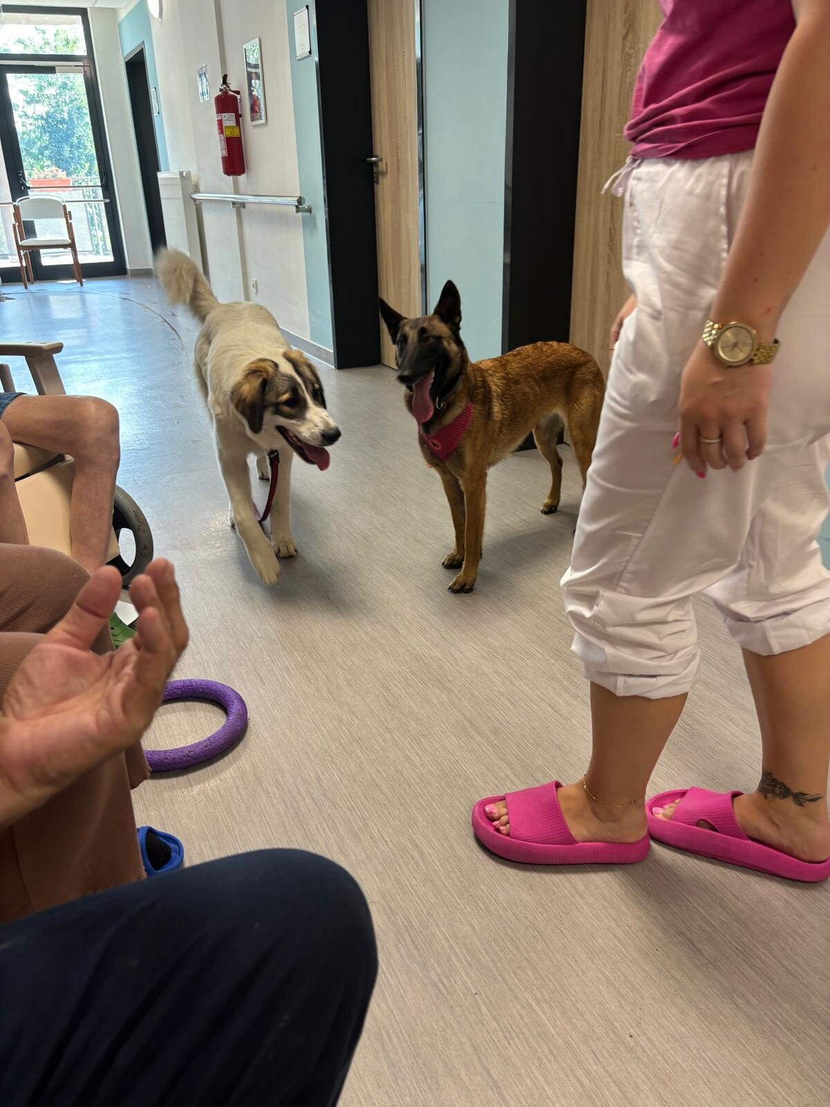 Ve čtvrtek odpoledne nás znovu navštívila zvířata z Boušic s majitelkou Evou. Kvůli vysokým teplotám jsme raději zvolili návštěvu klientů na pokojích. Náš zvířecí tým se skládal ze psů, slepic, kohouta, kocoura a králíka. O zábavu bylo opět postaráno. 😀🩵