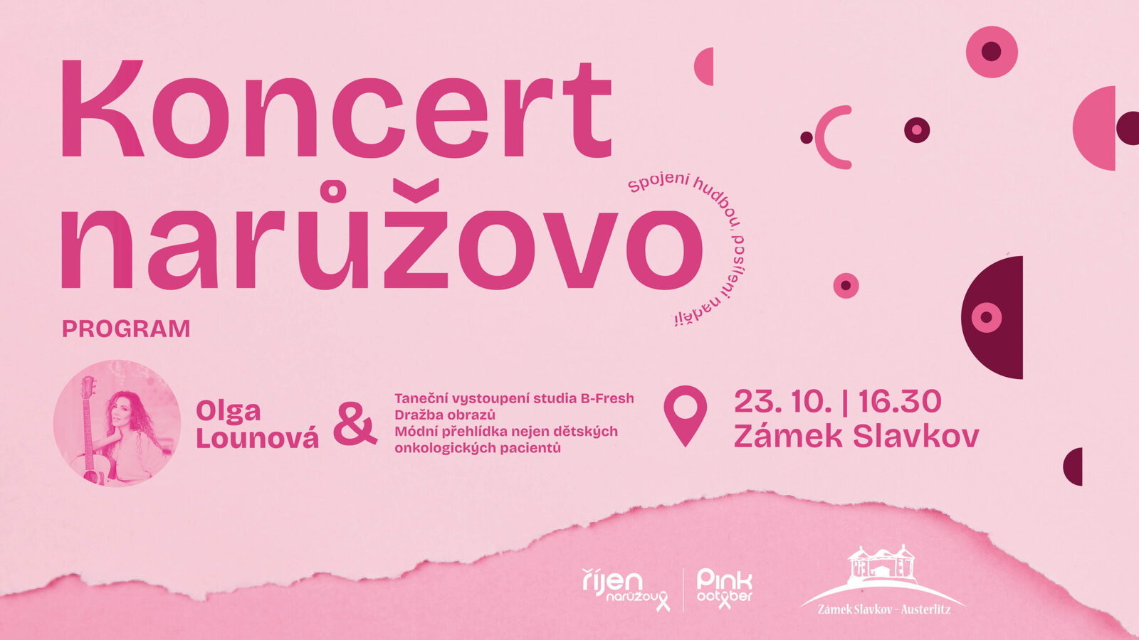 Koncert narůžovo s Olgou Lounovou se vznešeně nesl Historickým sálem ve Slavkově u Brna. Naši klienti z Senevida Slavkov u Brna dostali na tuto akci pozvánku od paní Mariky Hemmerové z organizace Pink October. Program byl vskutku bohatý - vystoupila taneční skupina studia B-Fresh, Mini Glitter Stars, Olga Lounová a nechyběla ani módní přehlídka. Naděje a sounáležitost, vzájemná podpora. Nejen to symbolizovala akce Koncert narůžovo. Za pozvání moc děkujeme.