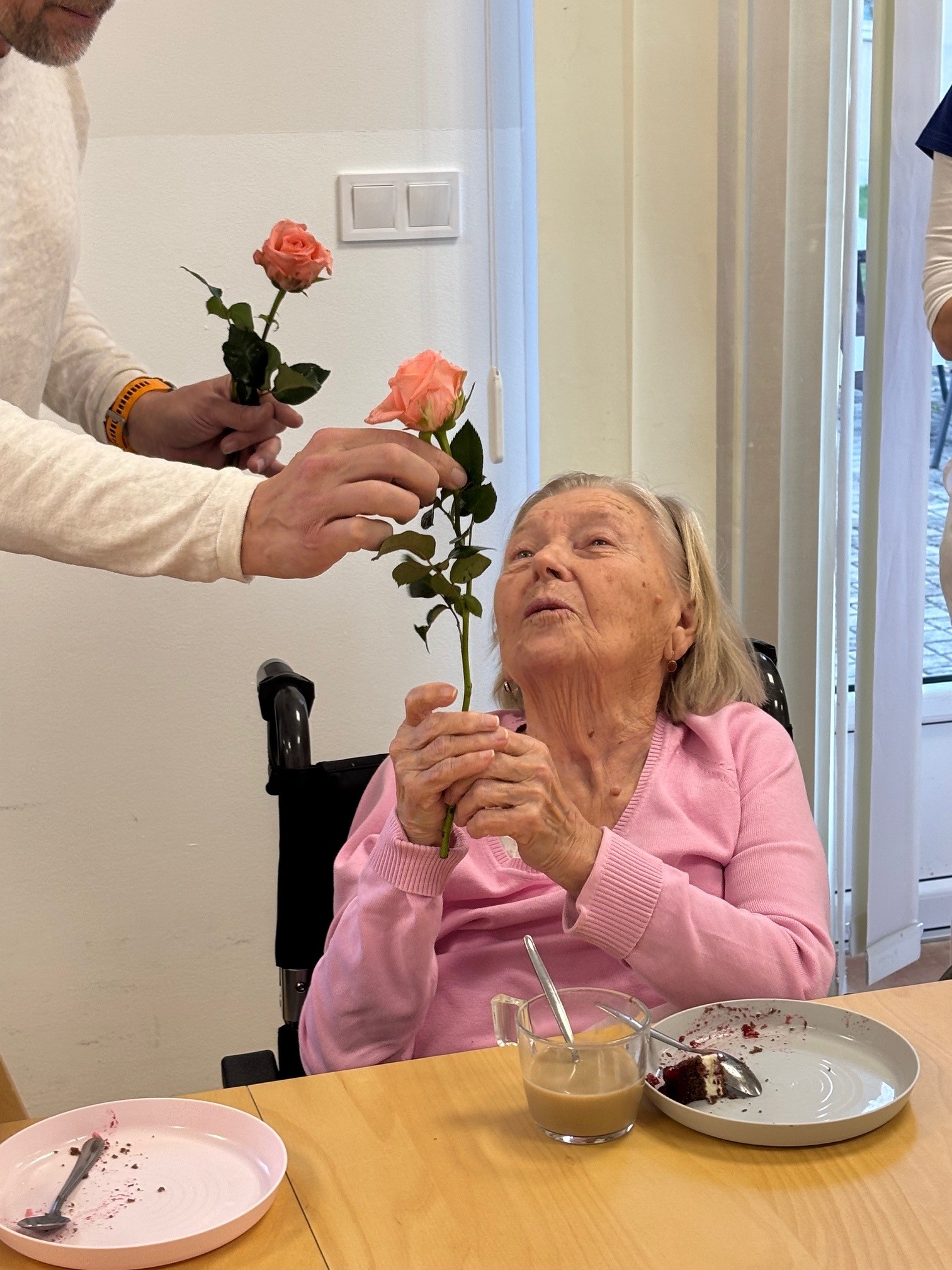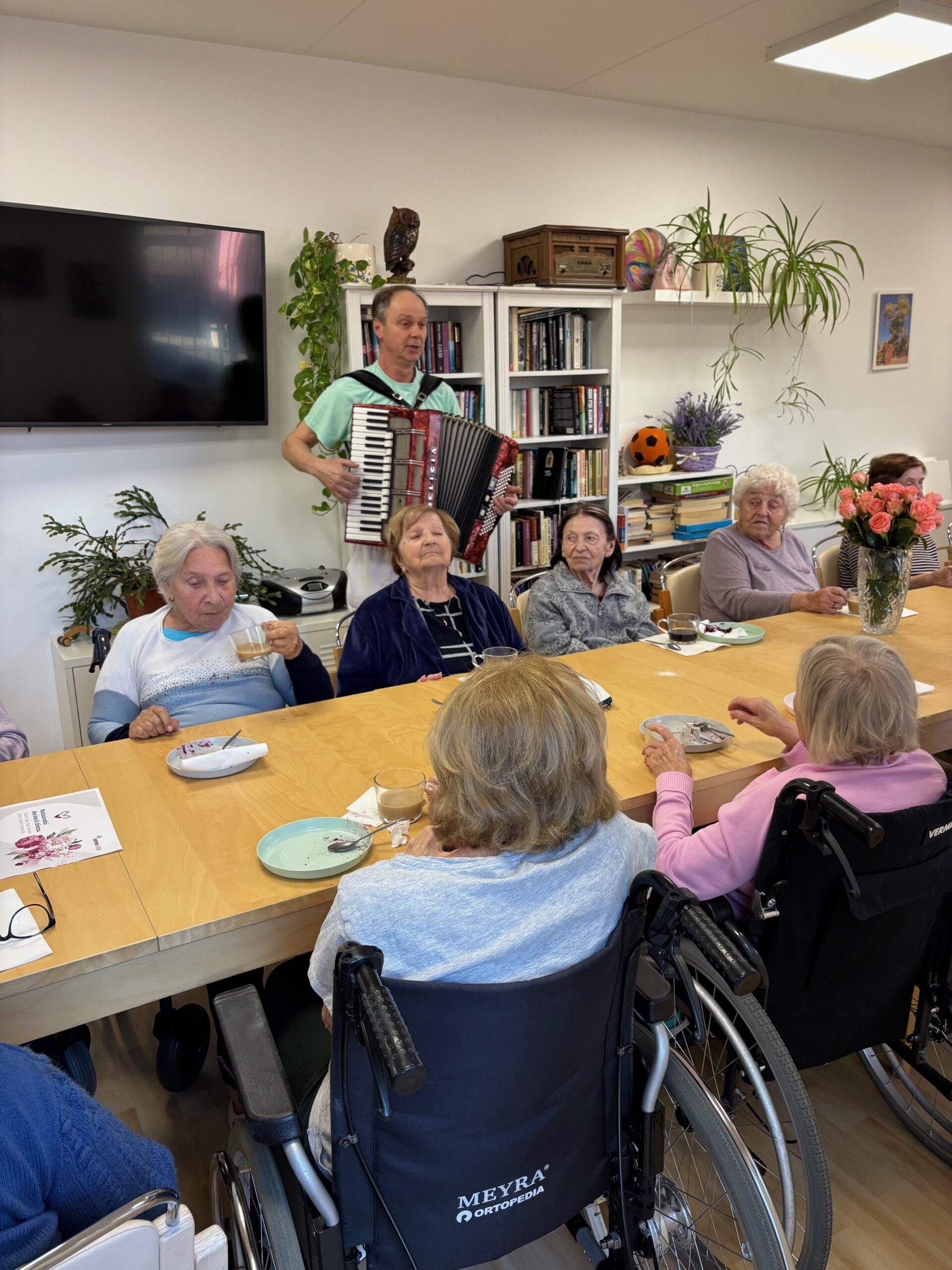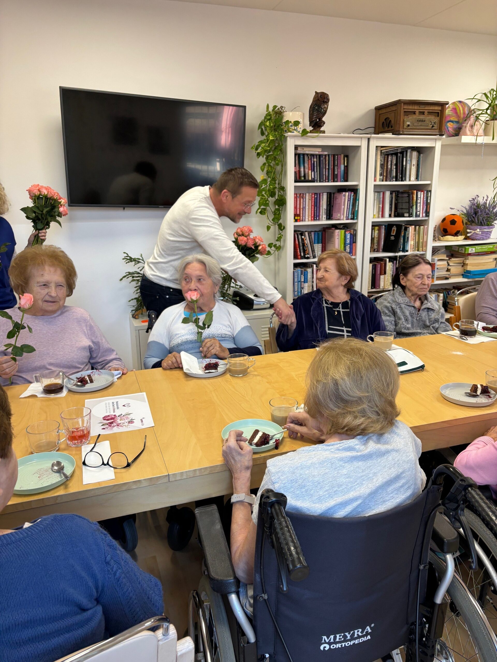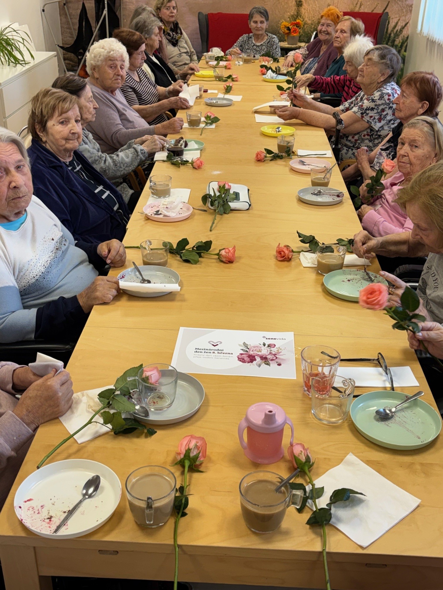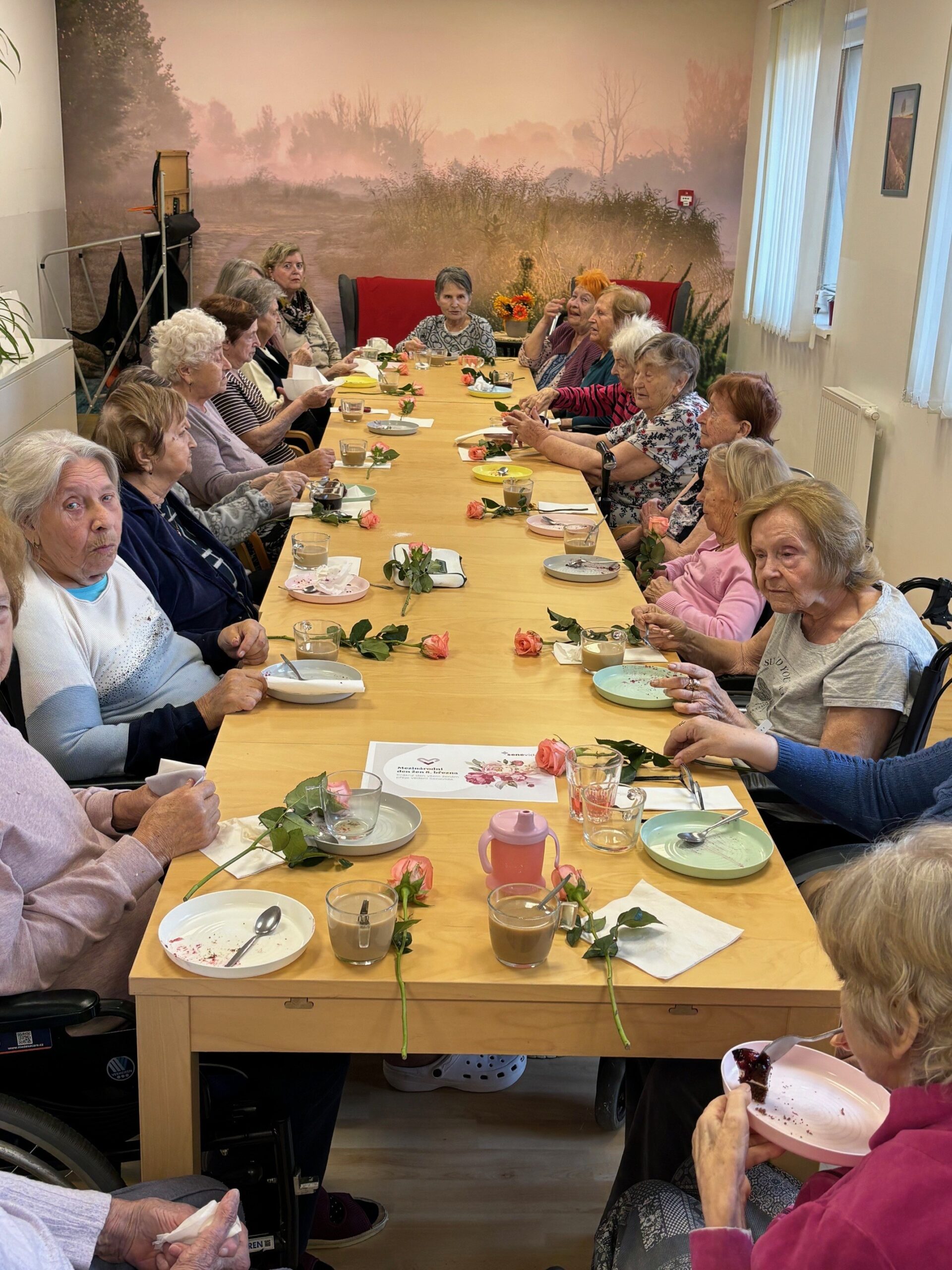 Všechny ženy, žijící a nebo pracující v domově, byly osobně ředitelem domova obdarovány růží s gratulací. K dortu a kávě zahrál na harmoniku všemi milovaný pečovatel František. Náladu měli všichni zúčastnění skvělou.