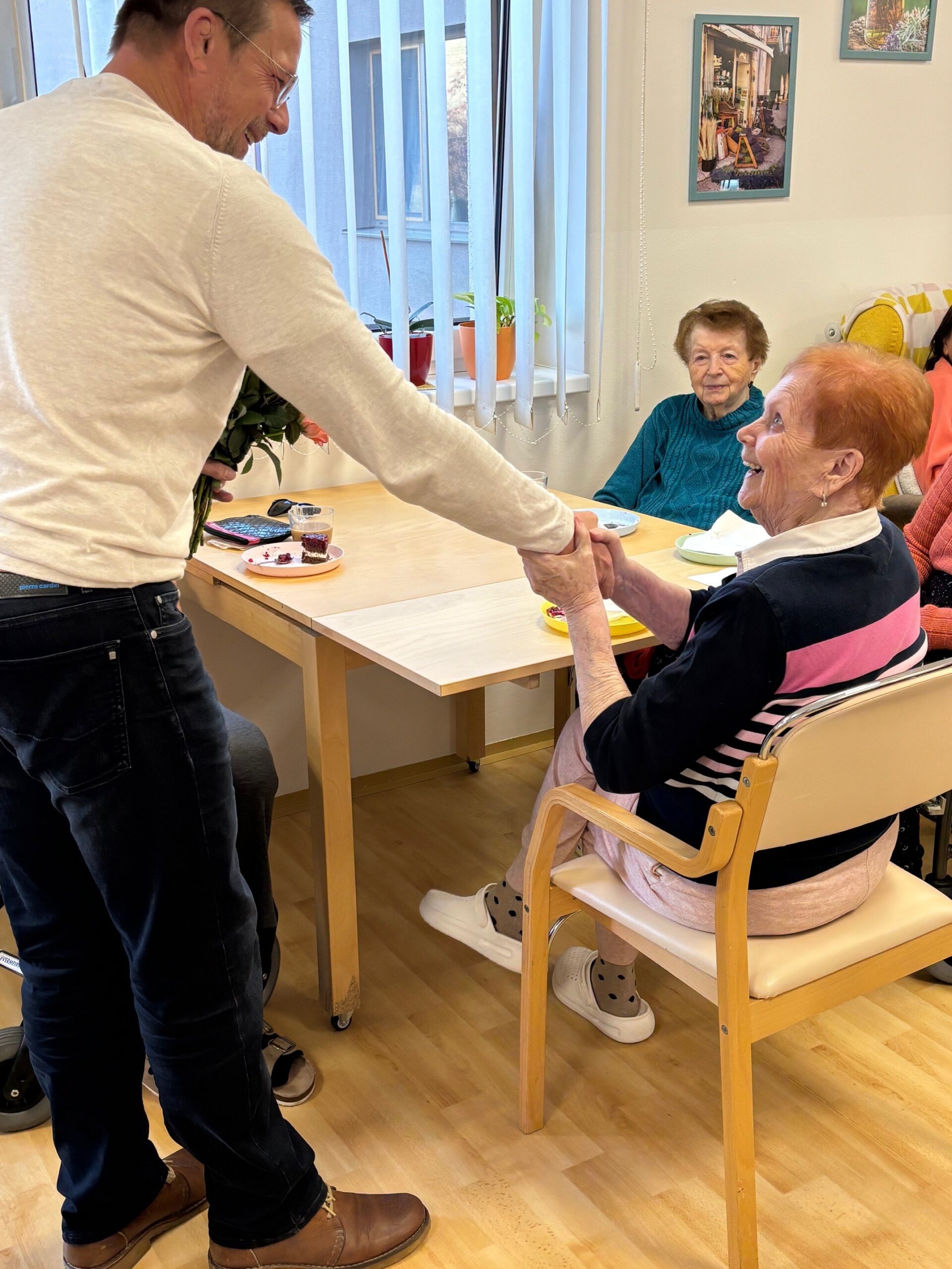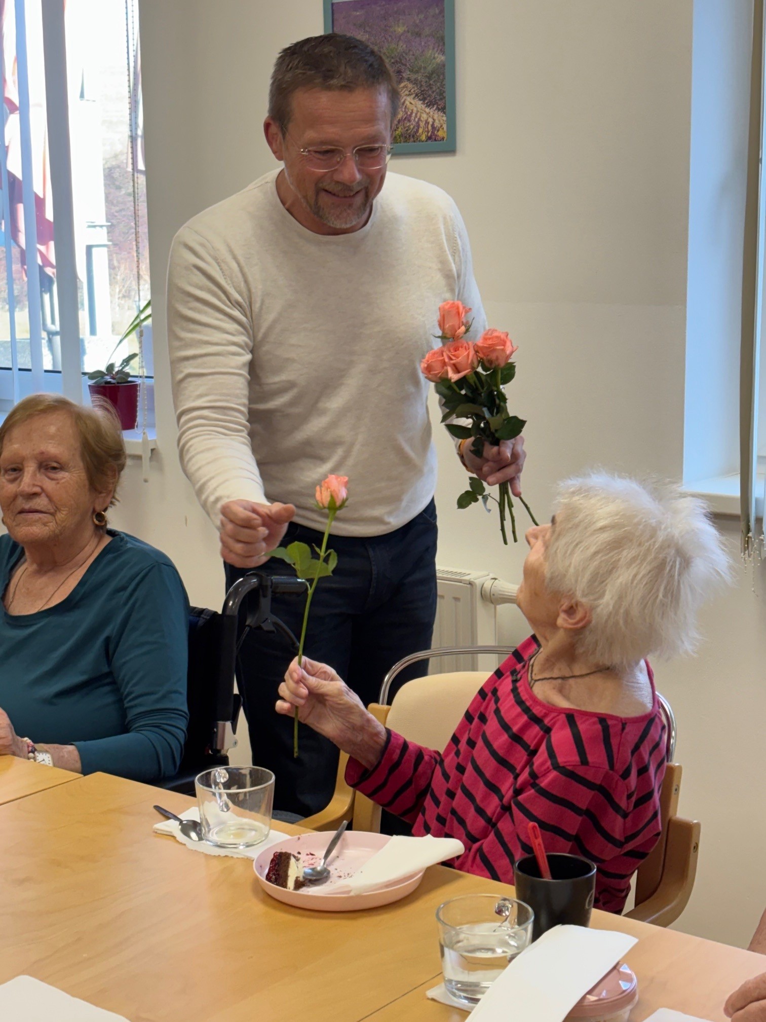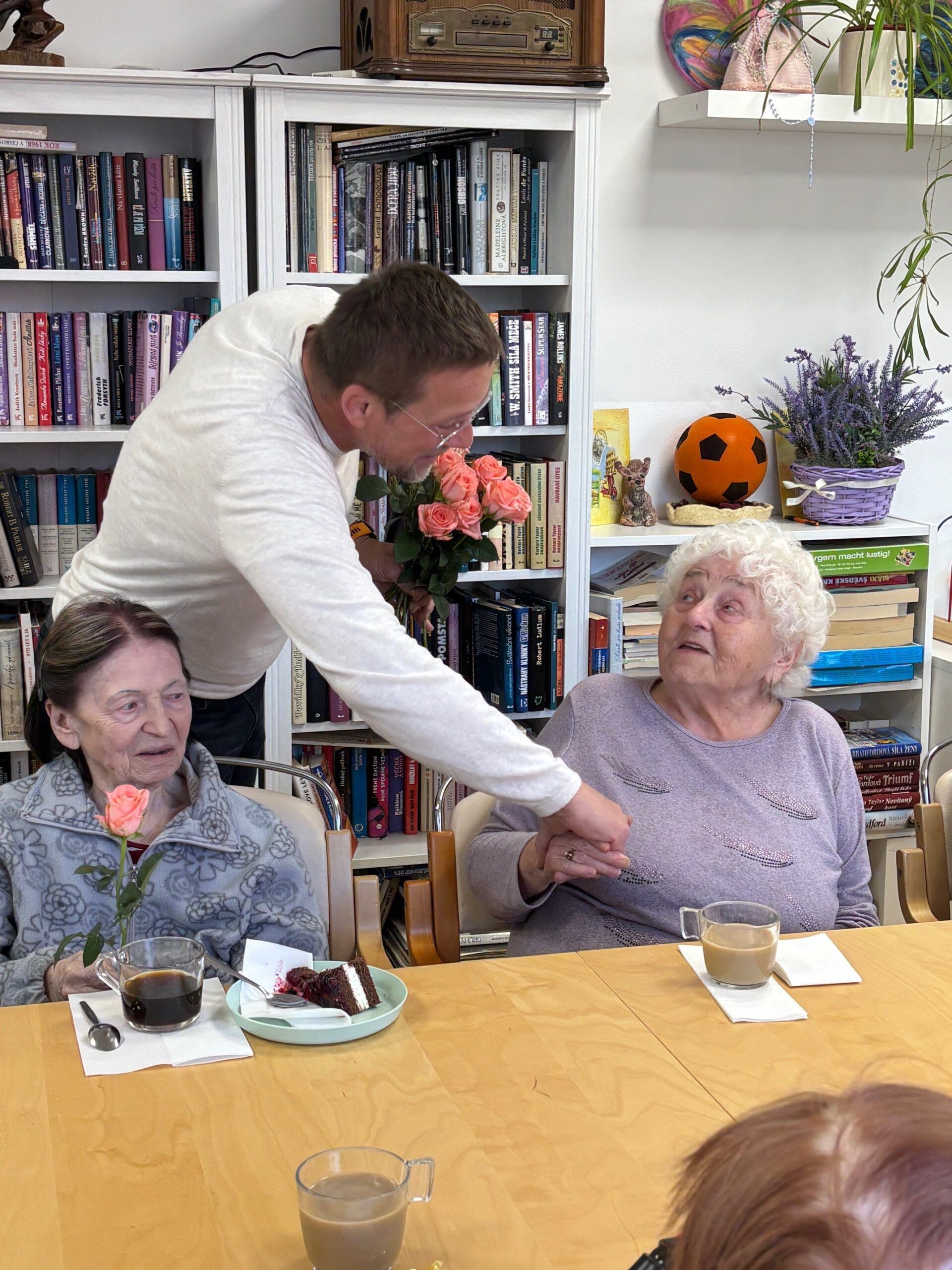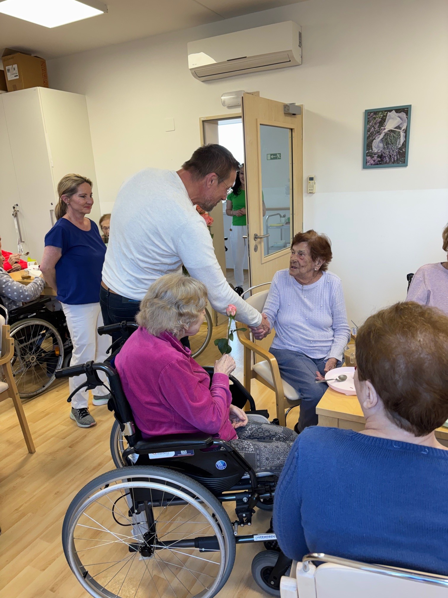 Všechny ženy, žijící a nebo pracující v domově, byly osobně ředitelem domova obdarovány růží s gratulací. K dortu a kávě zahrál na harmoniku všemi milovaný pečovatel František. Náladu měli všichni zúčastnění skvělou.