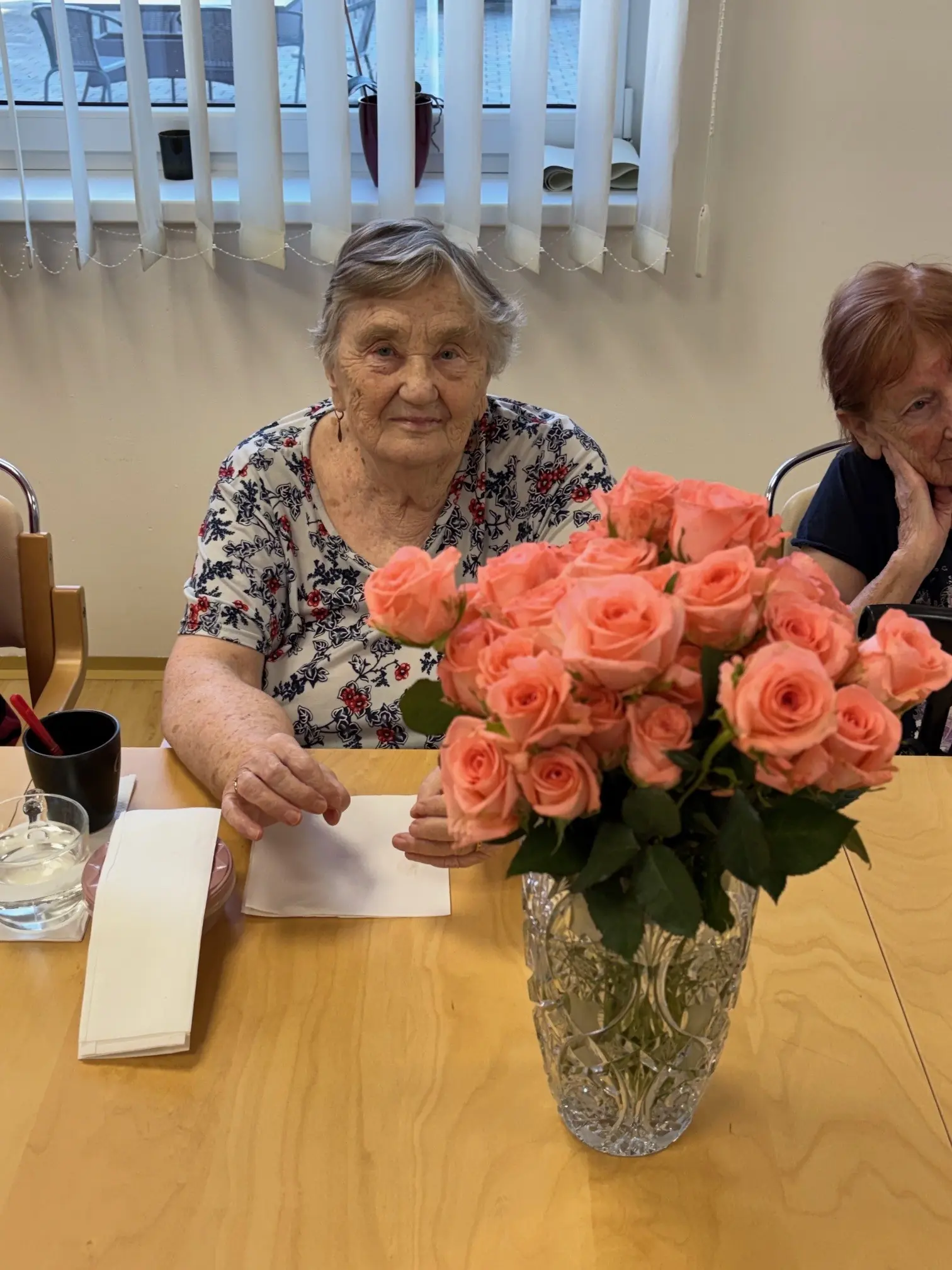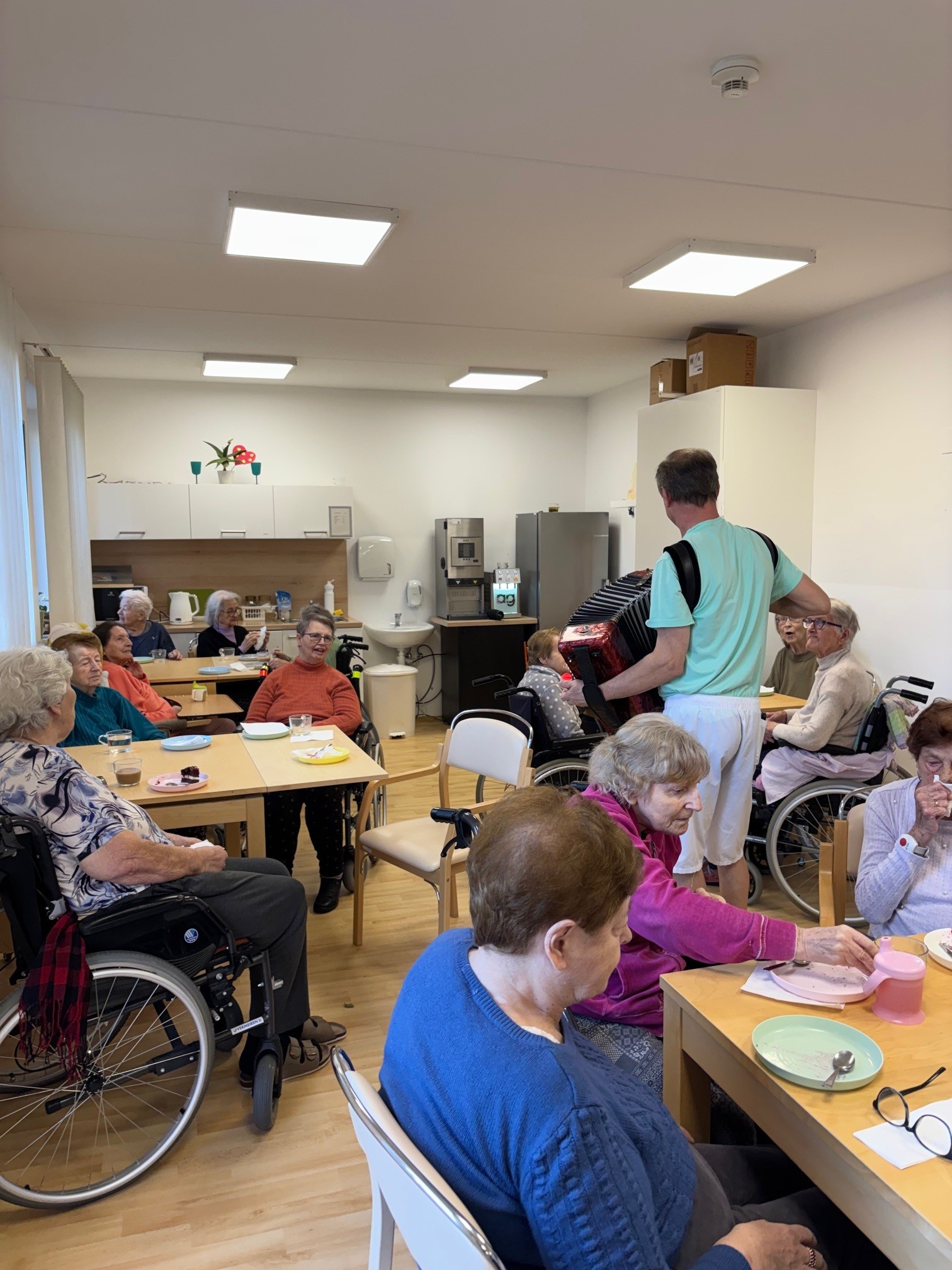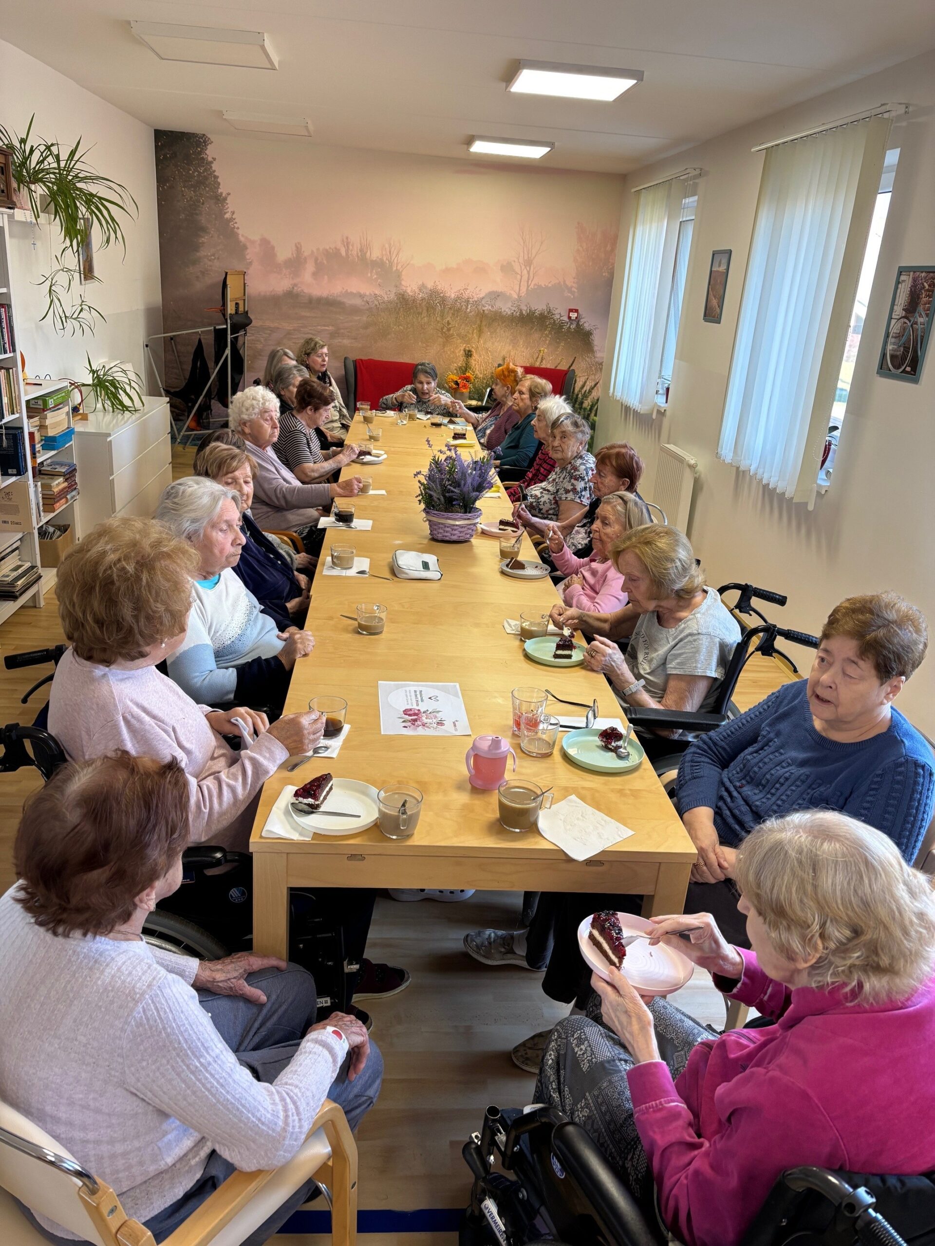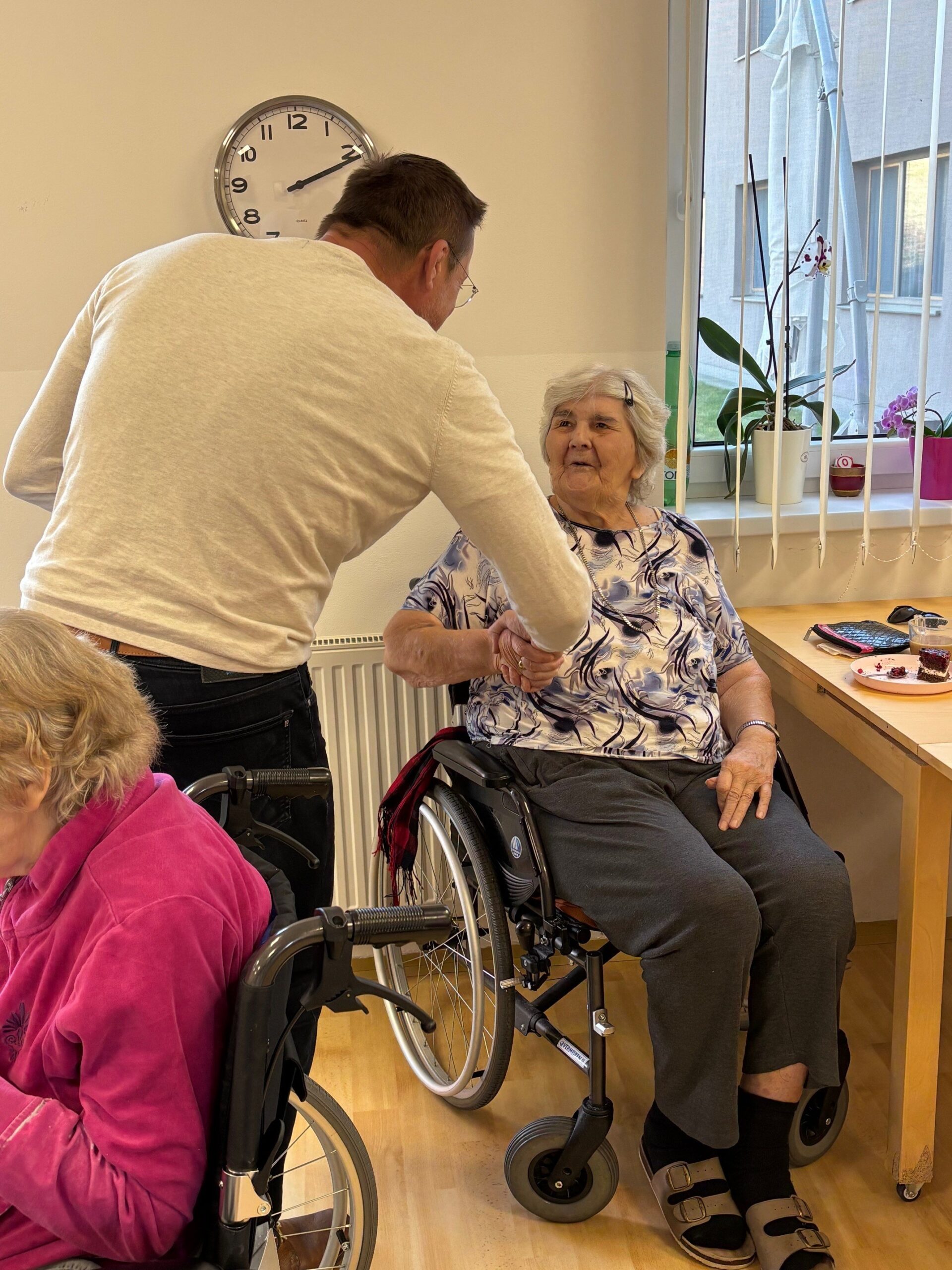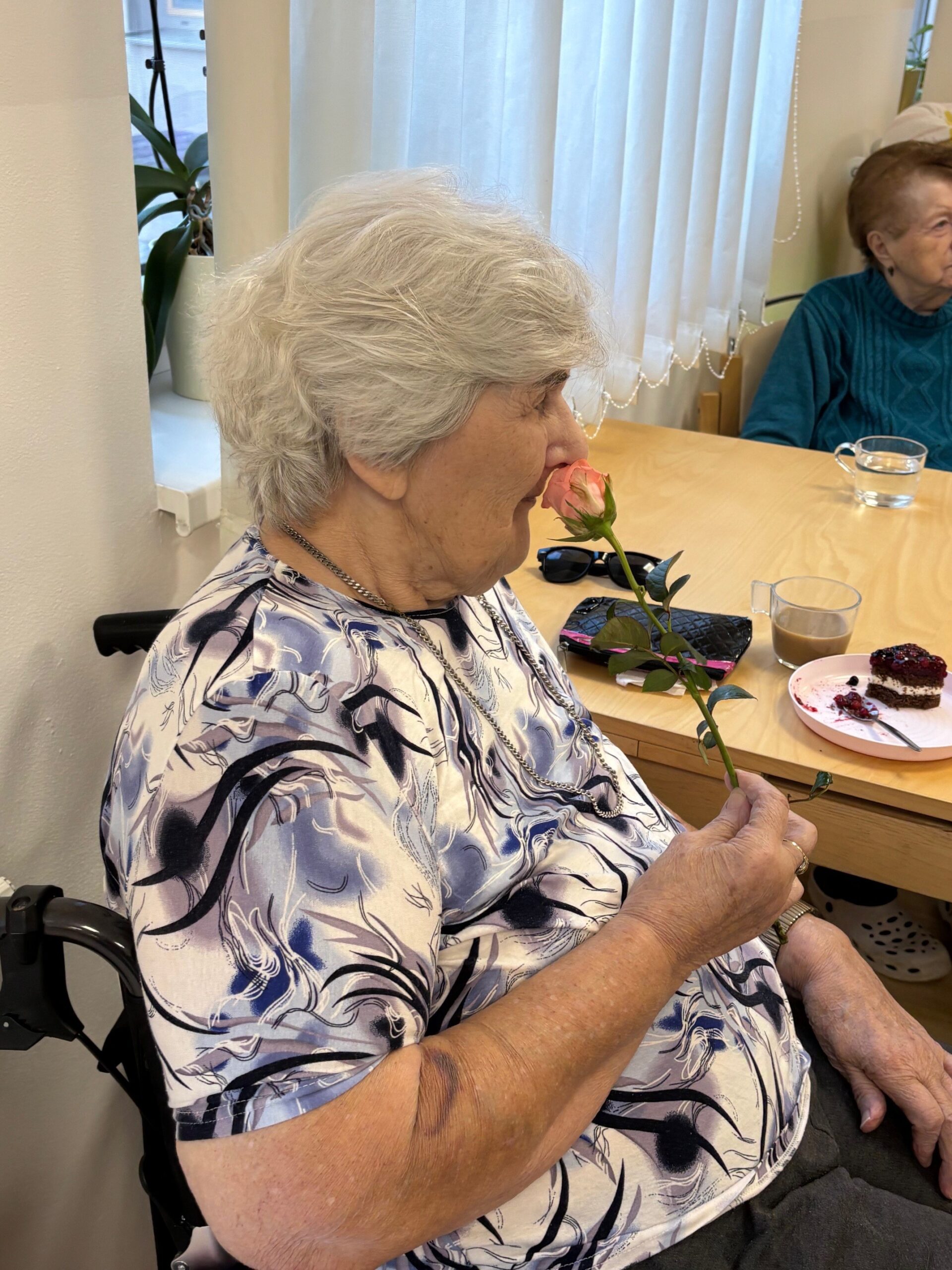 Všechny ženy, žijící a nebo pracující v domově, byly osobně ředitelem domova obdarovány růží s gratulací. K dortu a kávě zahrál na harmoniku všemi milovaný pečovatel František. Náladu měli všichni zúčastnění skvělou.