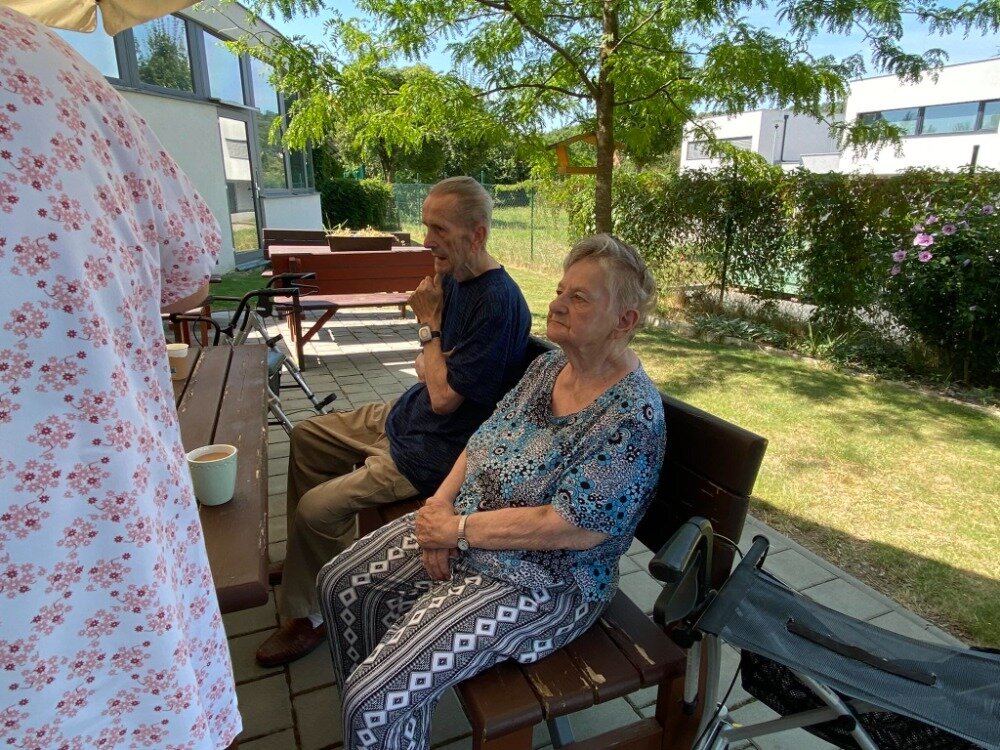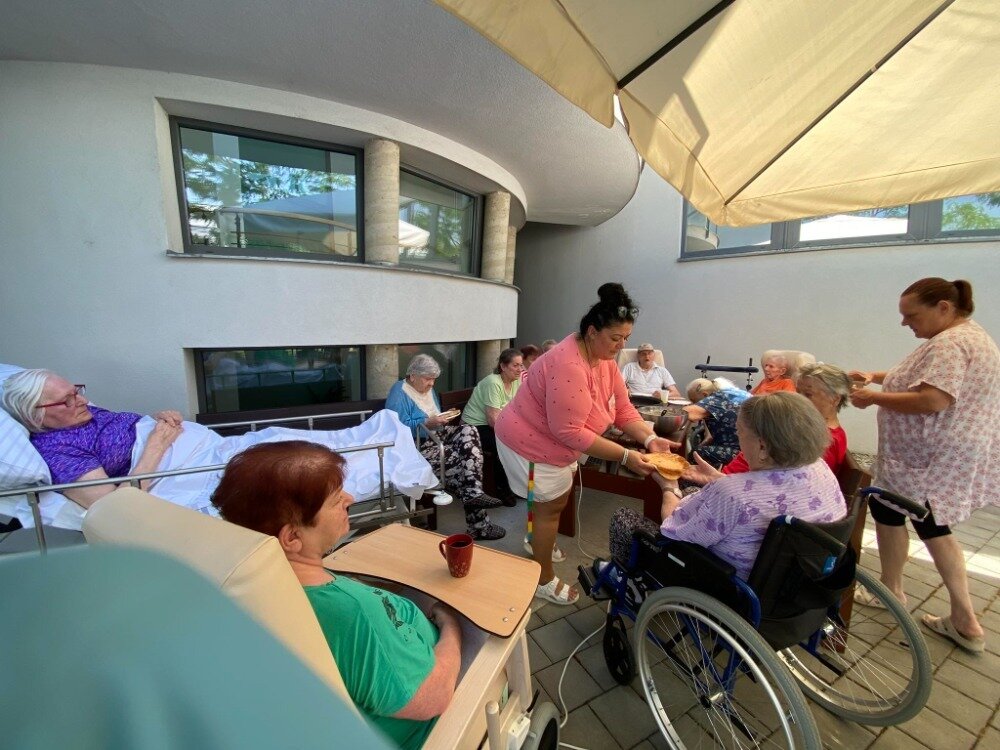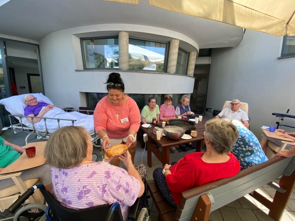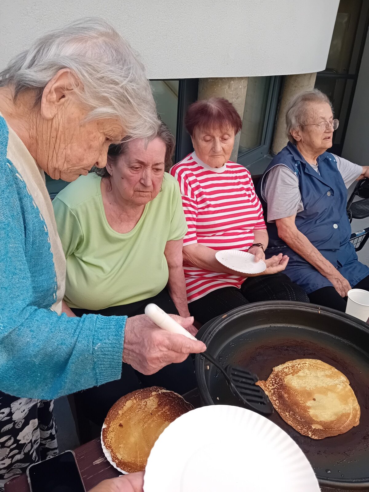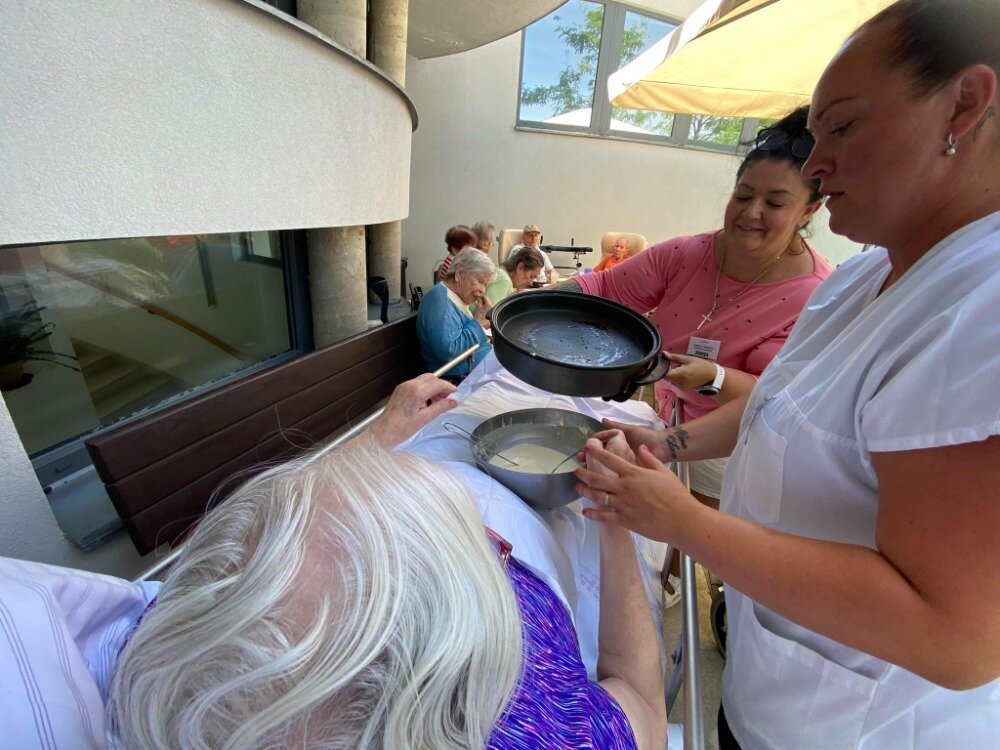 Společně s klienty jsme připravovali palačinky. Nachystali jsme si potřebné ingredience a jelikož nám počasí přálo, vyrazili jsme ven na zahradu. Klienti si mohli palačinku sami udělat a natřít různými druhy marmelád. Borůvková, jahodová, meruňková, všechny nám moc chutnaly.
