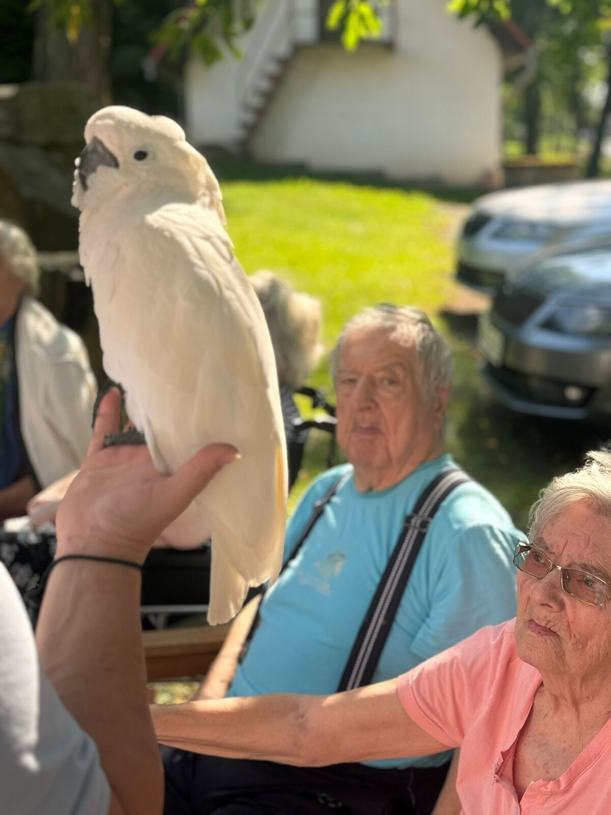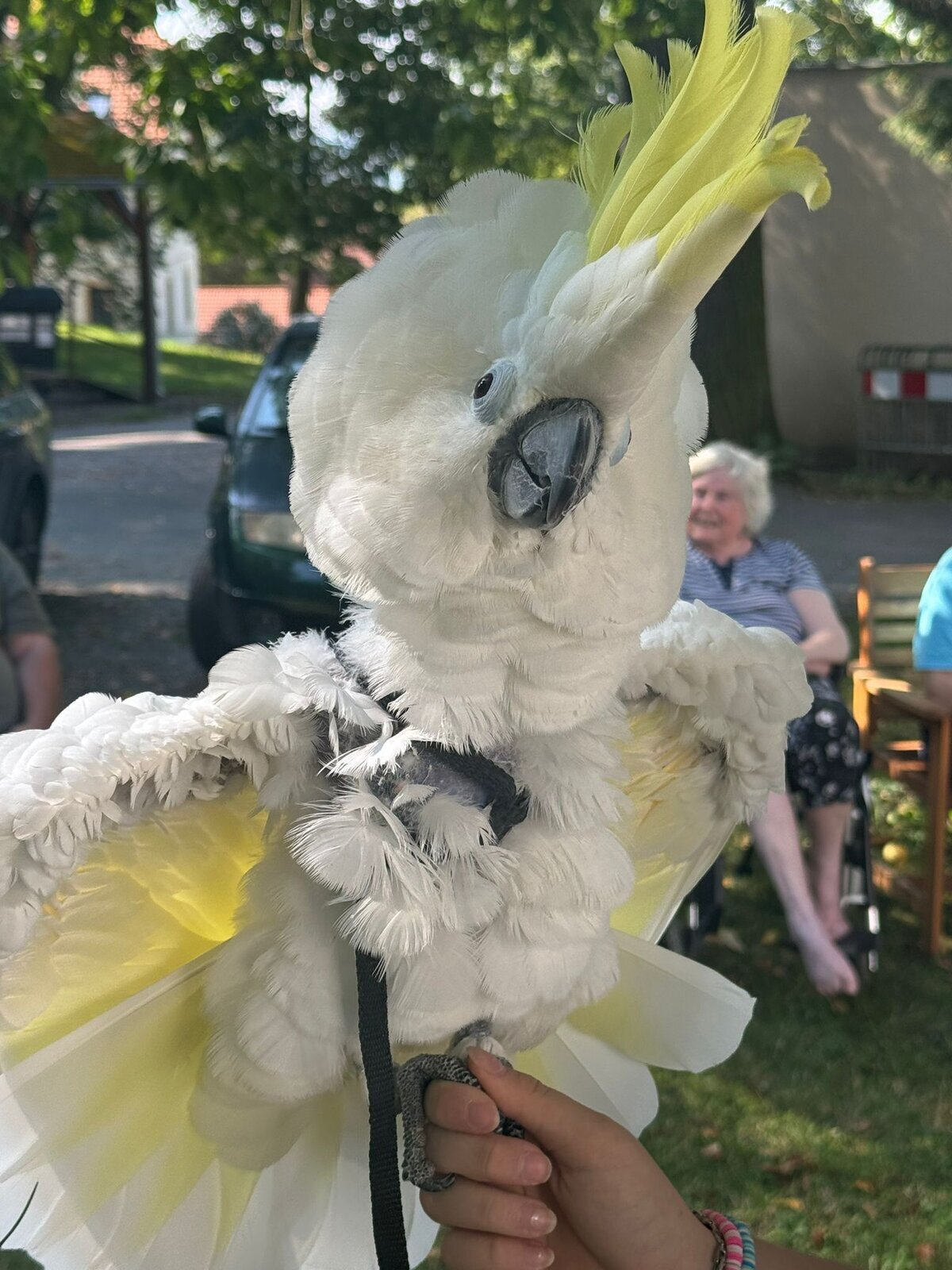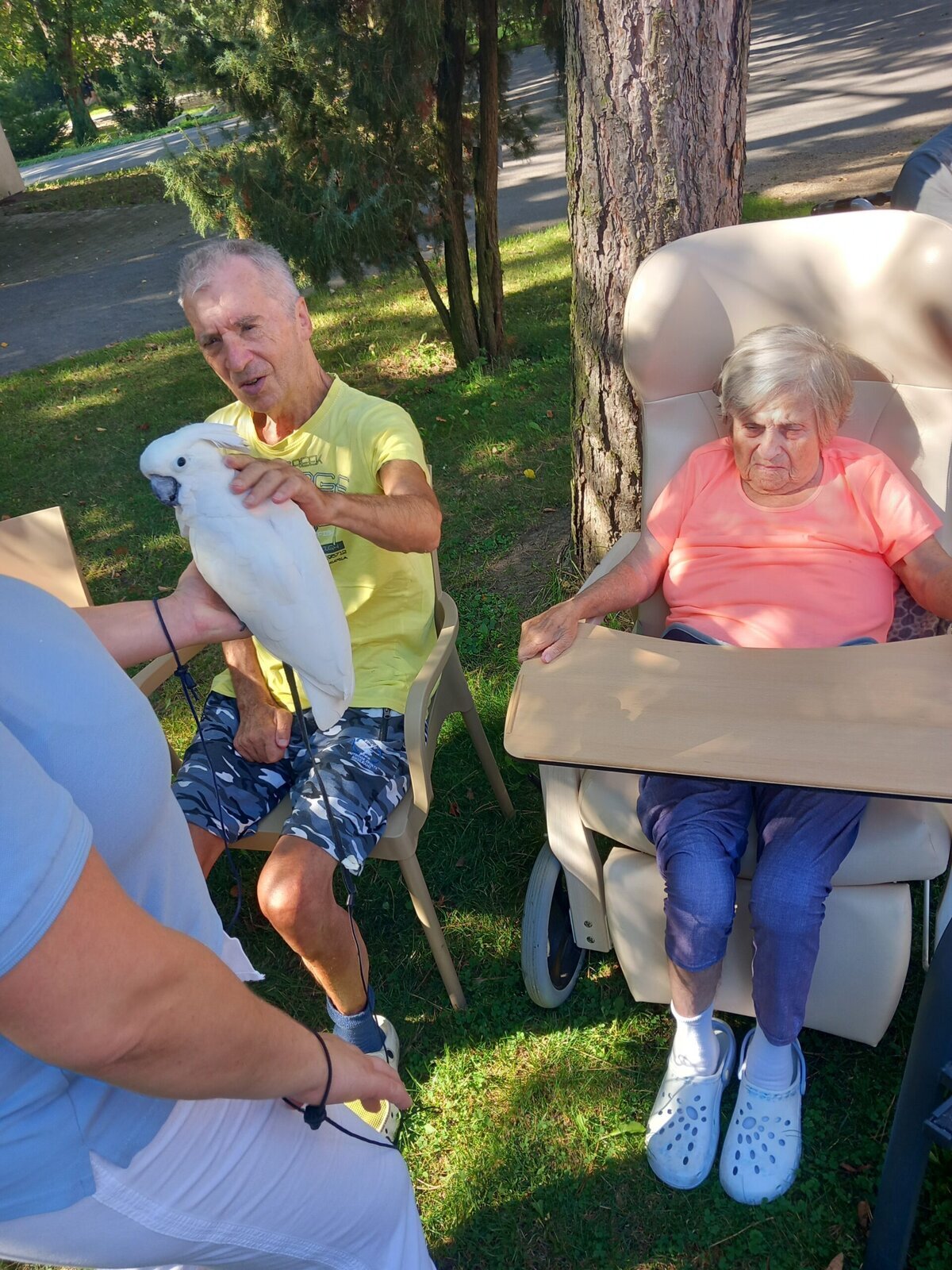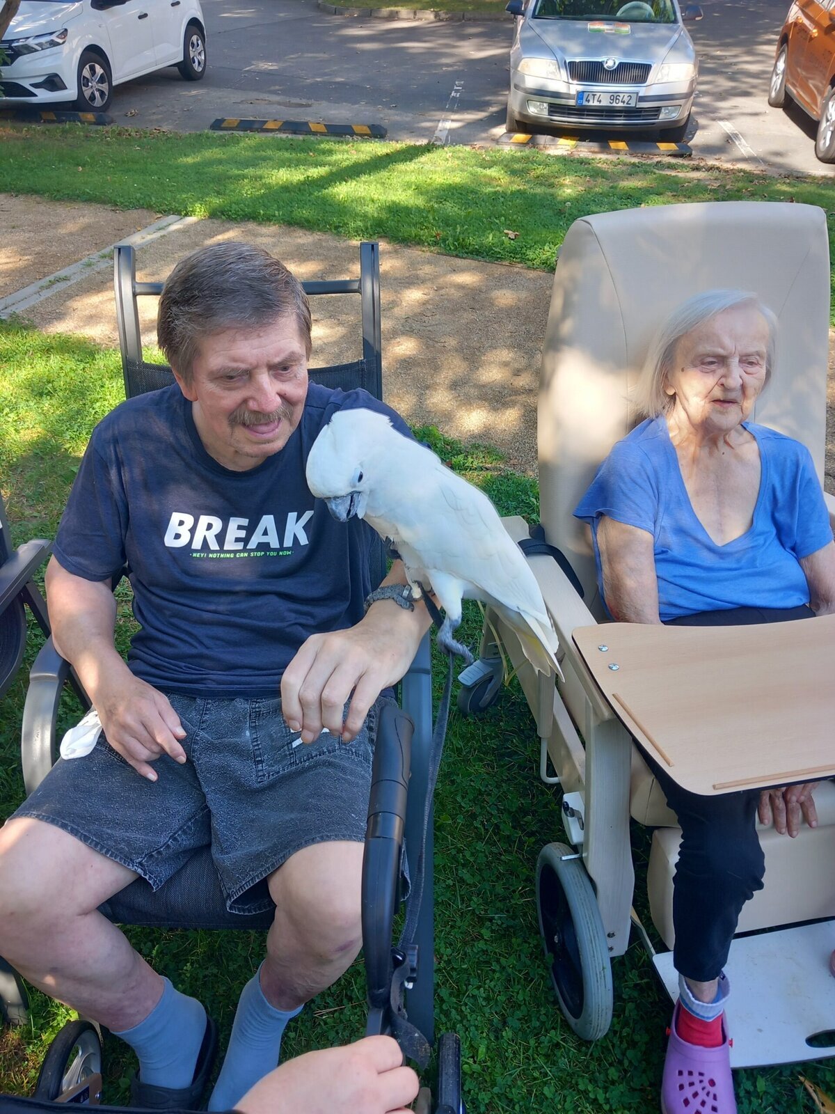 Papoušci Ara a Kakadu přiletěli do Pyšel. Dozvěděli jsme se spoustu zajímavých informací, pohladili po peří a jednoho záletníka sundávali ze stromu.