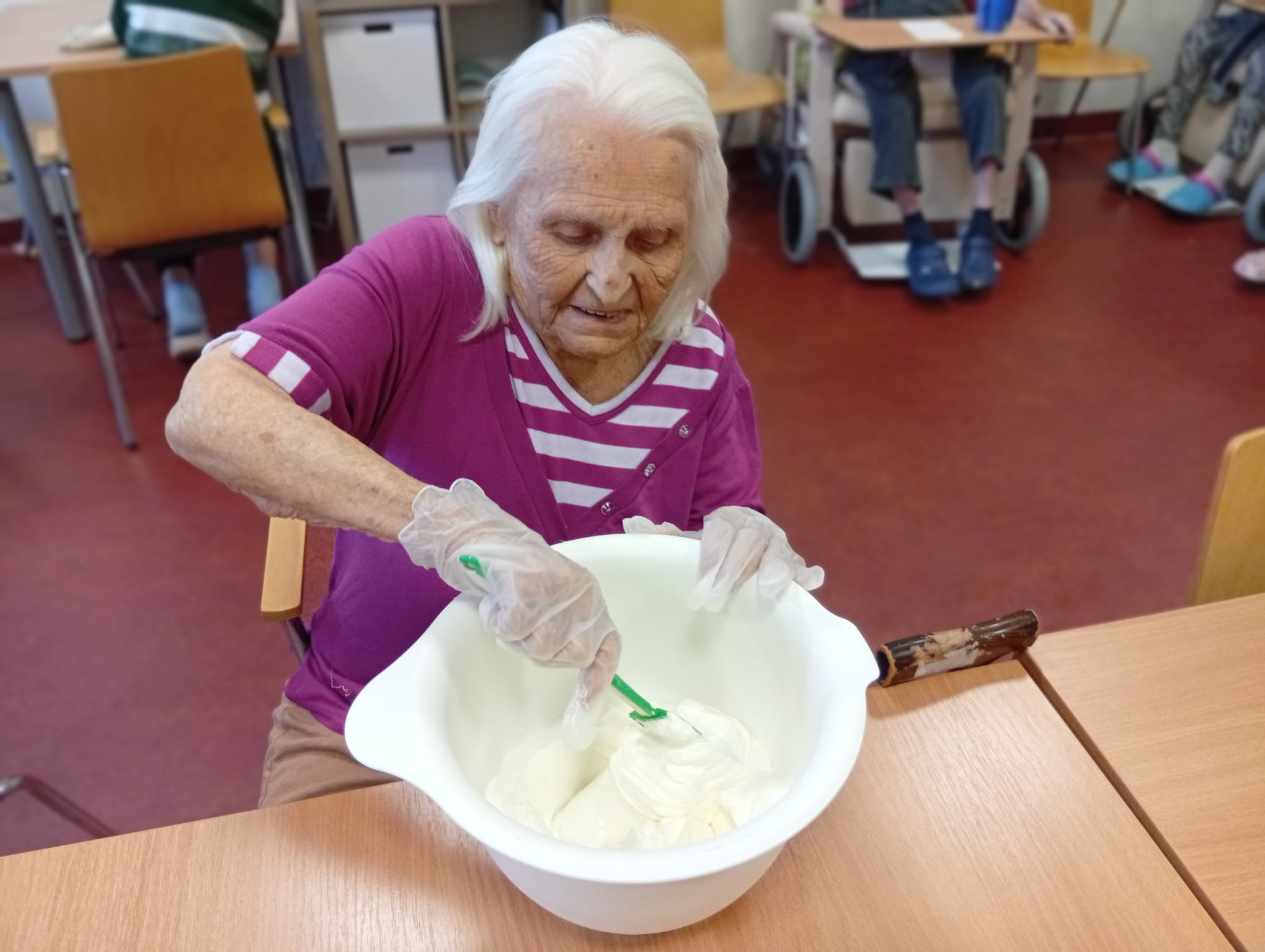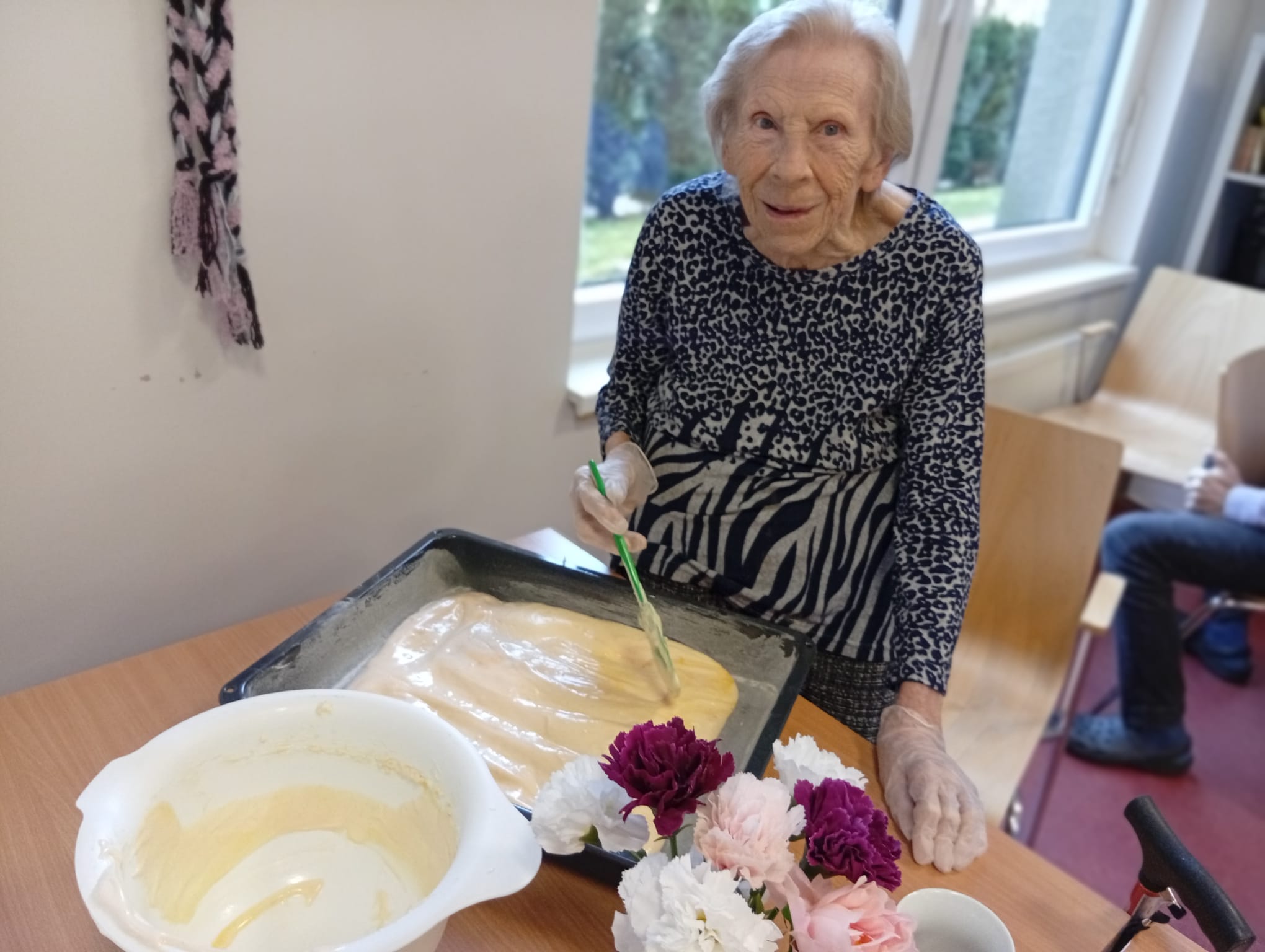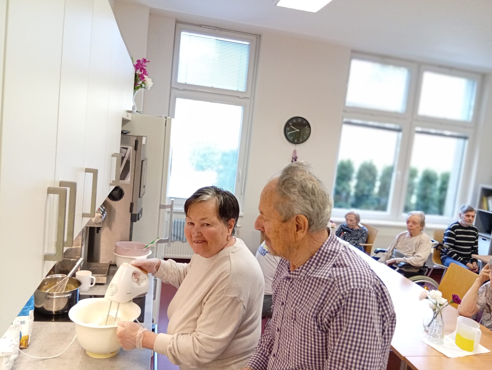 S klienty jsme dnes pekli buchtu na plech. Klienti se aktivně zapojili do přípravy těsta. Během pečení panovala dobrá nálada, doprovázena vzpomínkami na domácí pečení a sdíleným oblíbených receptů.
