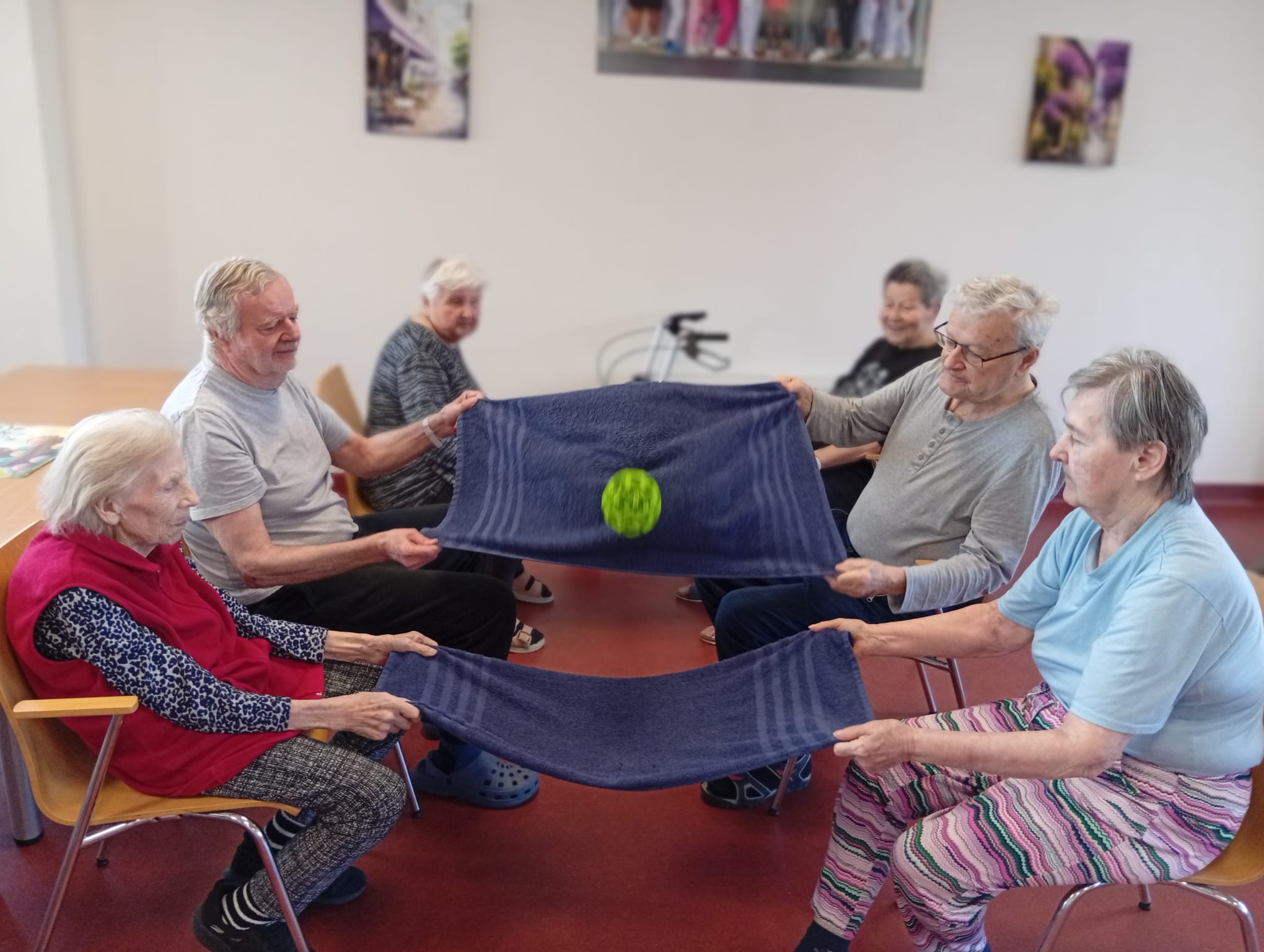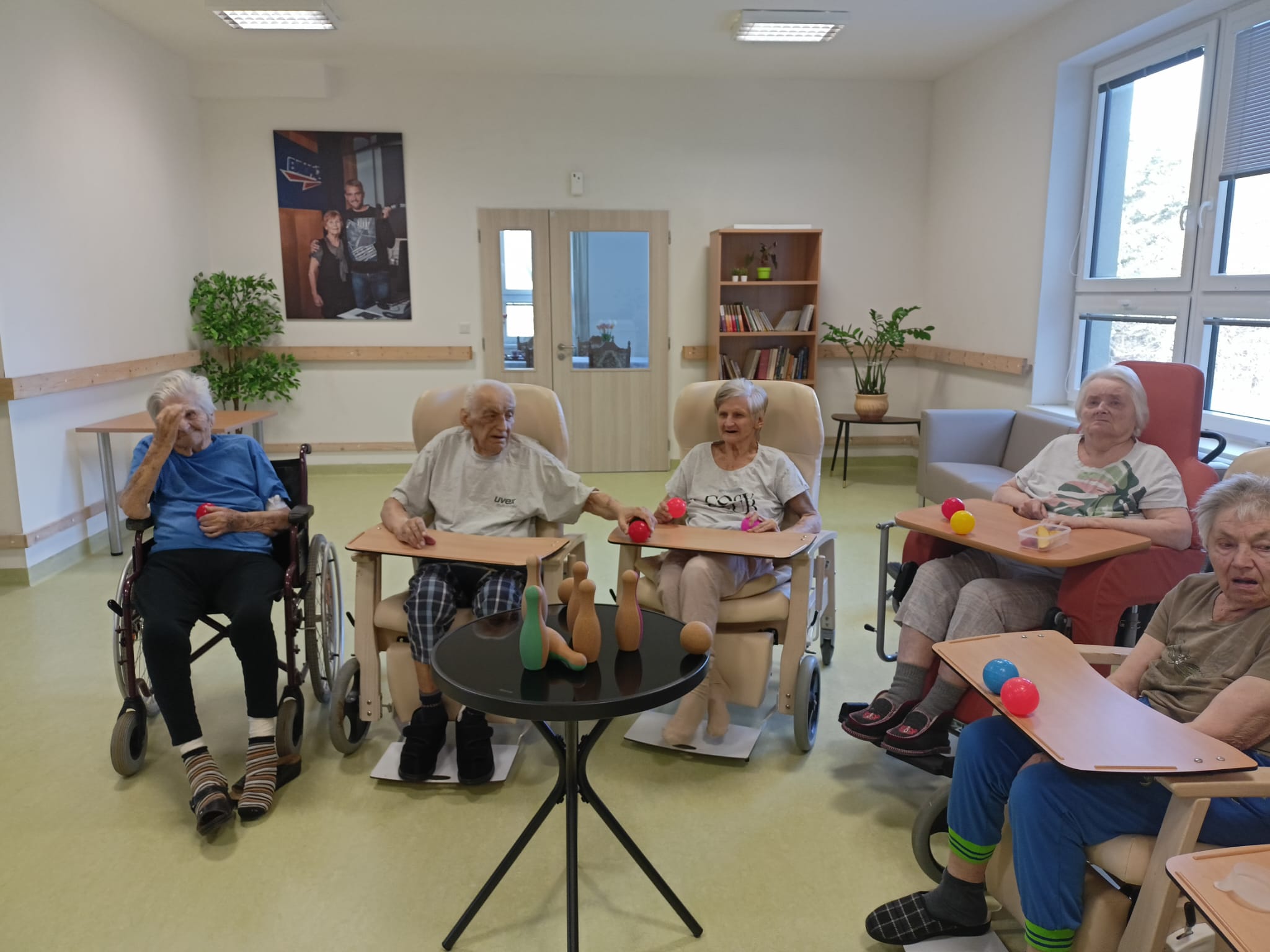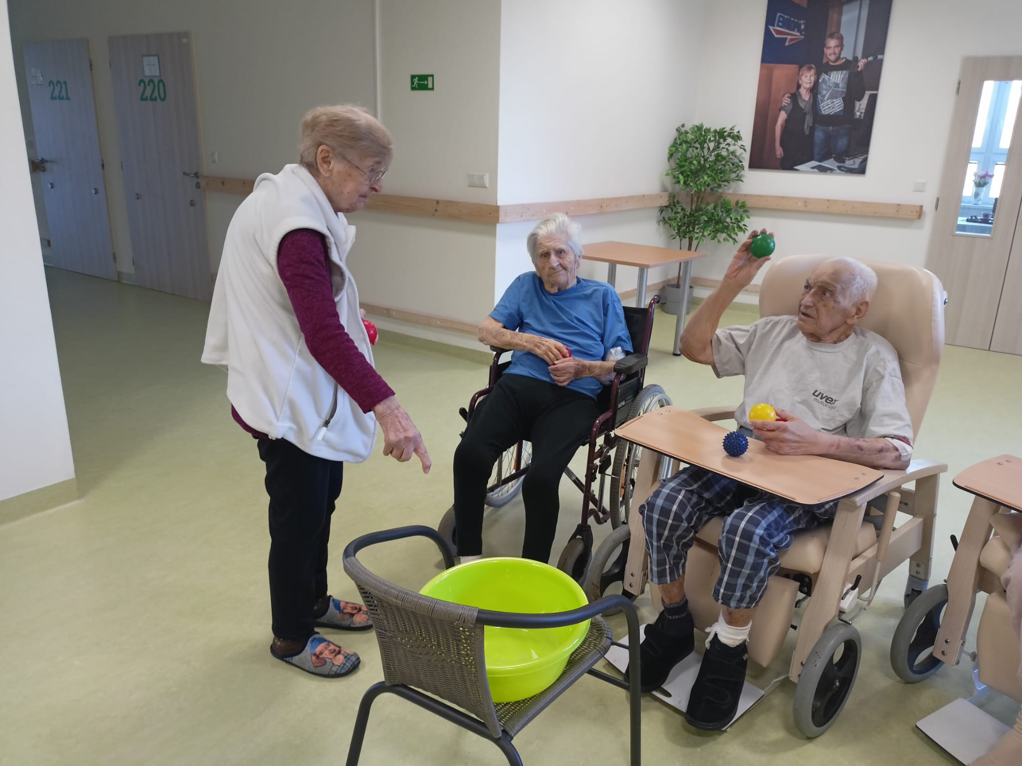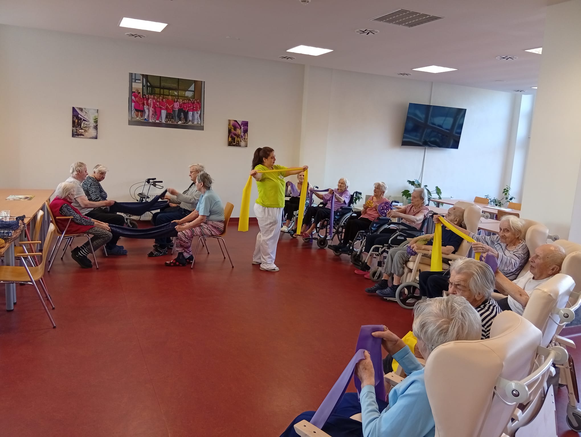 Dnešní pohybová aktivita byla zaměřena na cvičení s posilovacími gumami a kuželkami. Klienti procvičovali horní i dolní končetiny formou jednoduchých cviků.