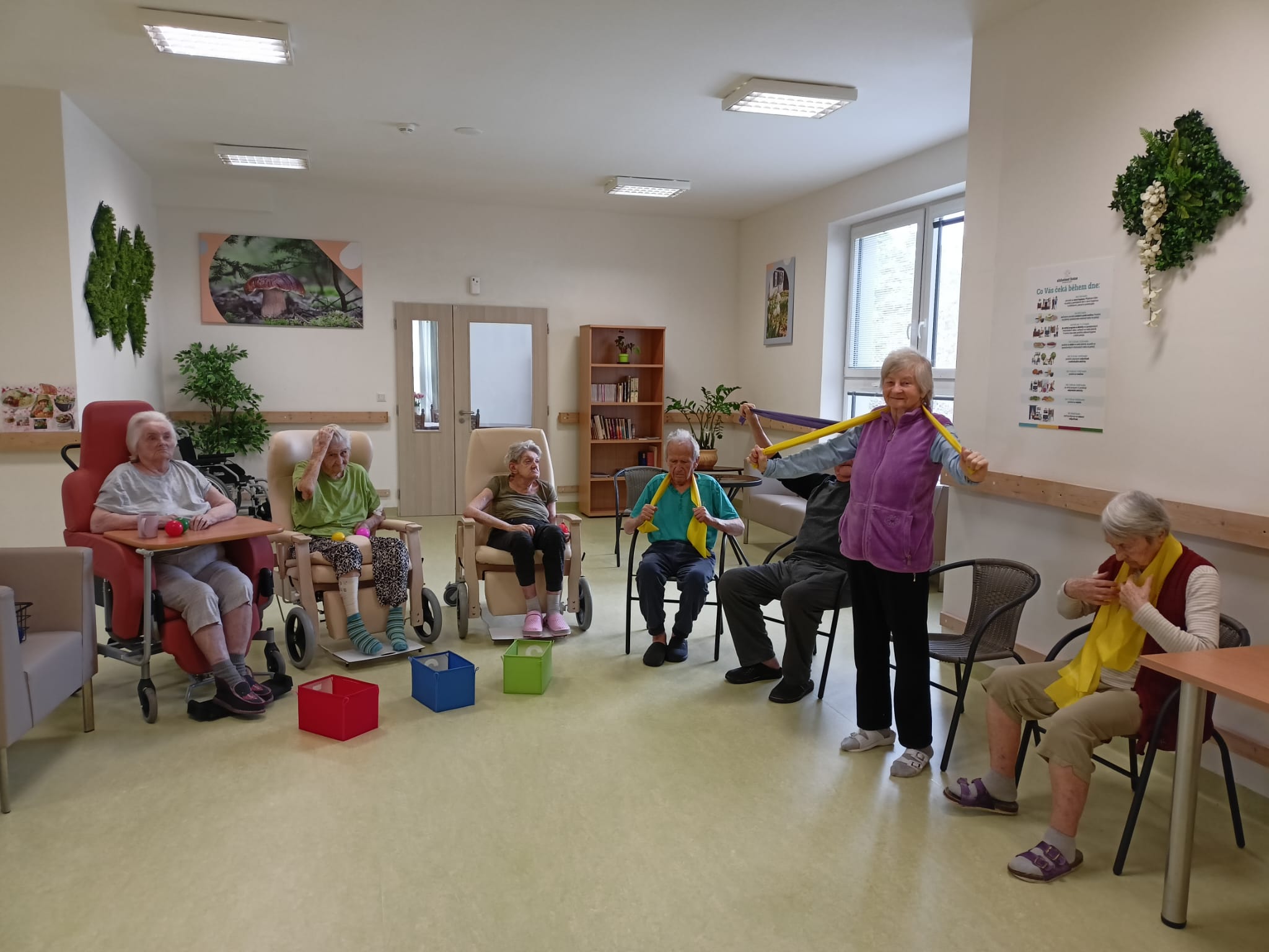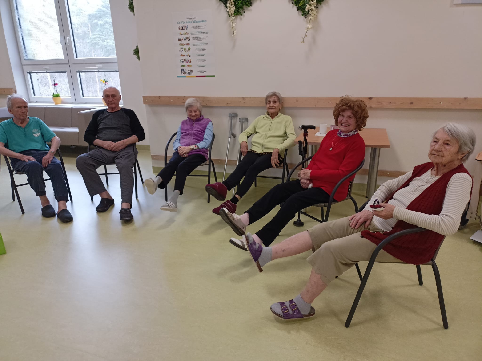 Cvičení bylo zaměřeno na uvolnění svalstva, zlepšení mobility a celkového protažení těla. Klienti spolupracovali dle svých možností. Aktivita probíhala v klidné a příjemné atmosféře.