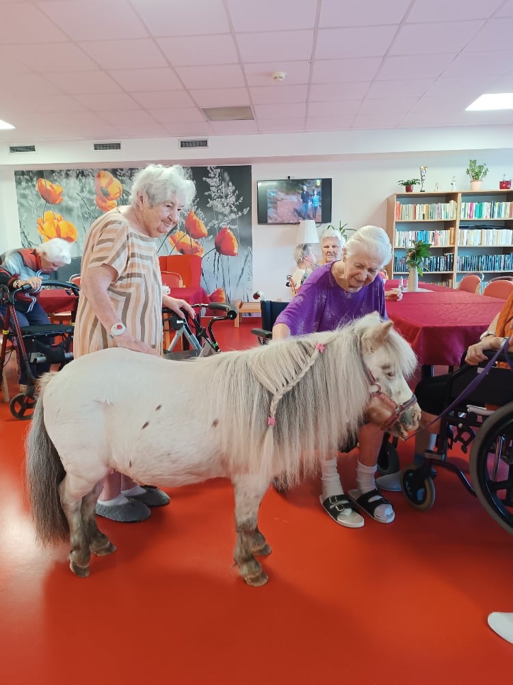Tak jako každý rok k nám dorazily dvě výjimečné návštěvnice, poníci Dianka a Topinka. Tyto trpělivé a přátelské klisničky pravidelně přinášejí do našeho domova jedinečný zážitek v podobě tzv. ponyterapie, která se stala velmi oblíbenou aktivitou mezi klienty.