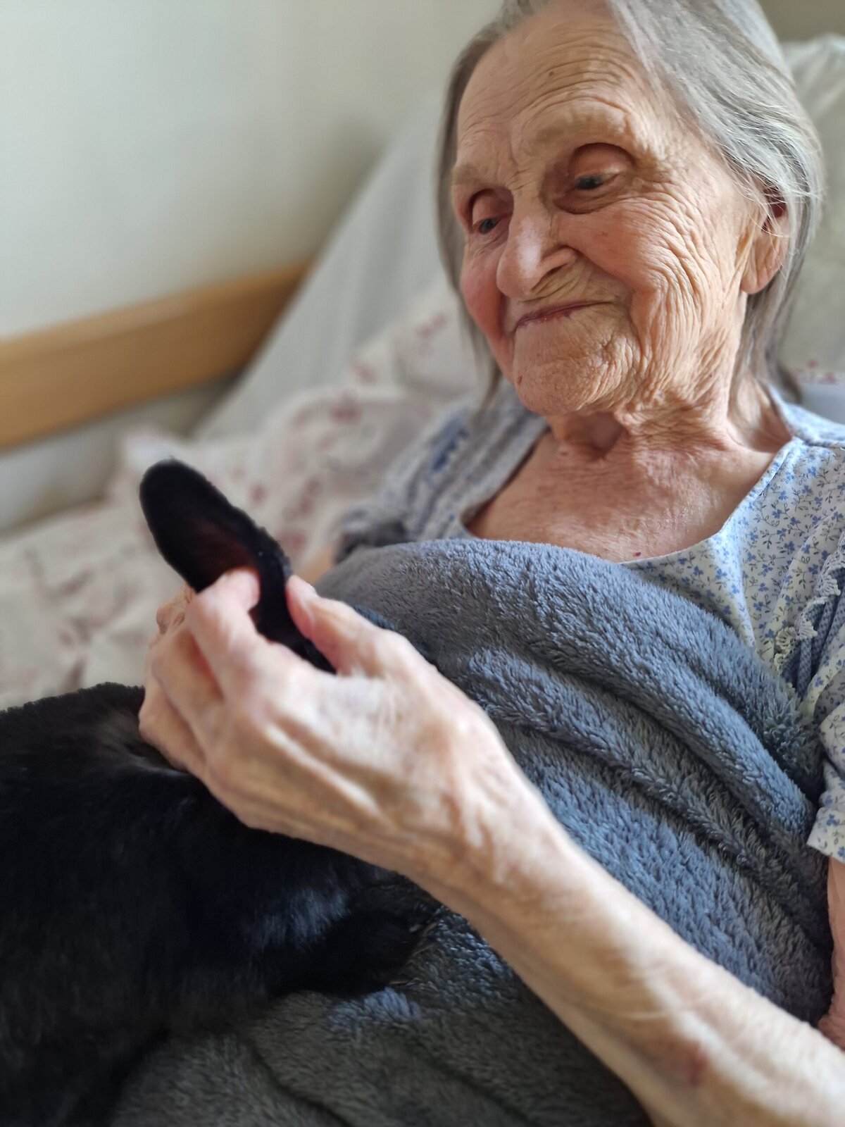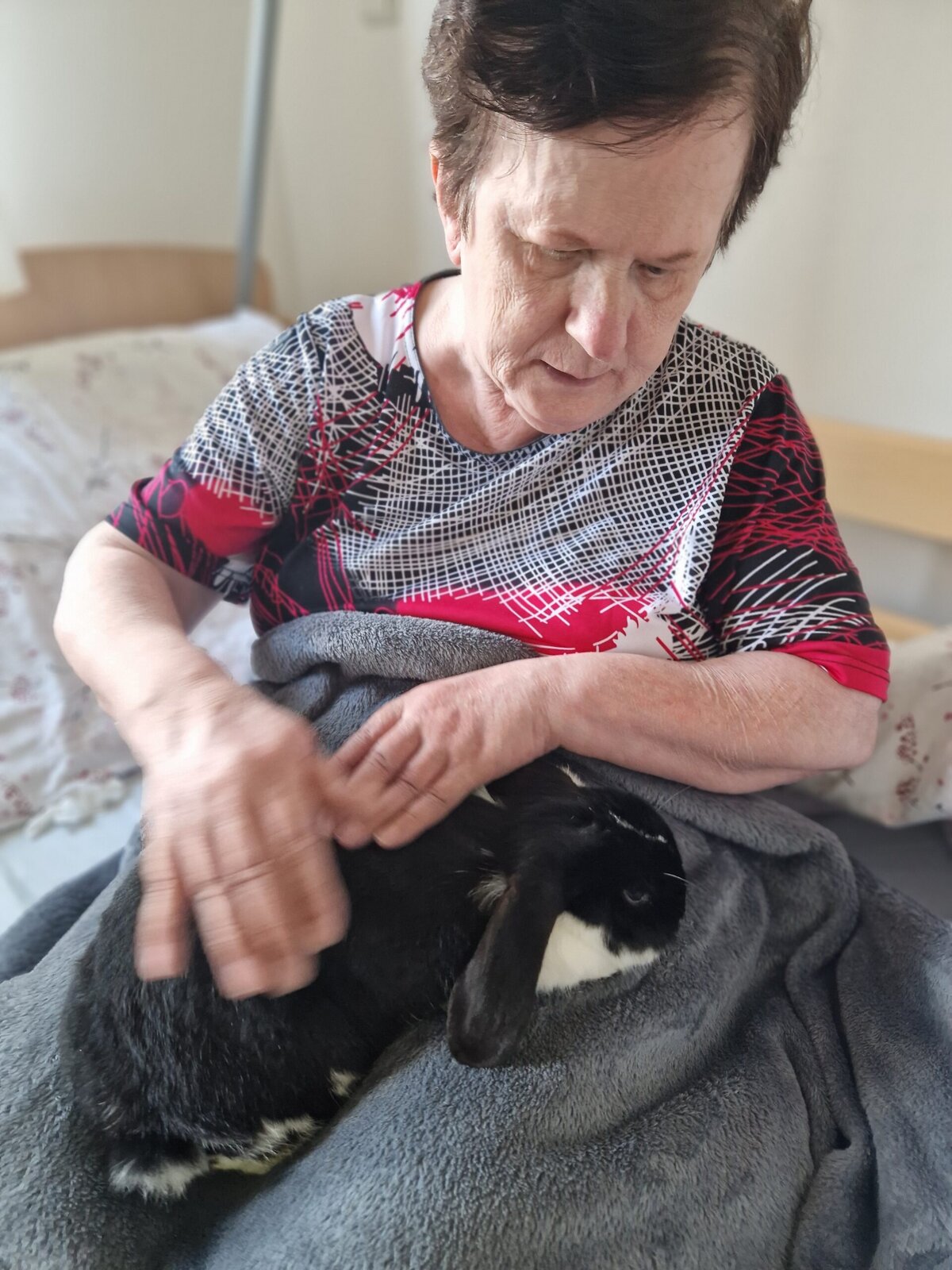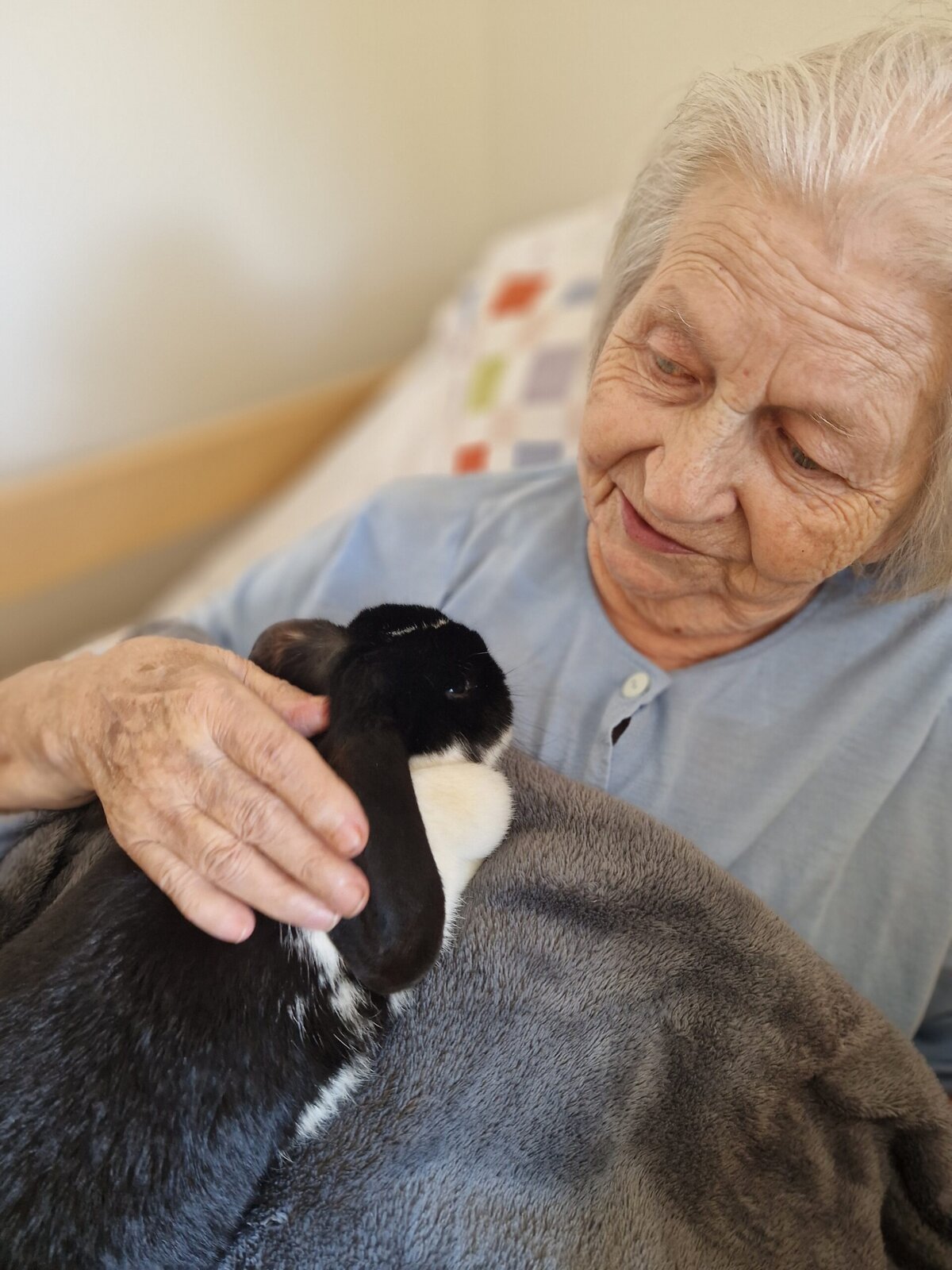 Každé jejich setkání s klienty je plné radosti, úsměvů a něžných doteků. Králíčci si s oblibou lehají na klín, nechávají se hladit a někdy se i zvědavě přitulí k obličeji.