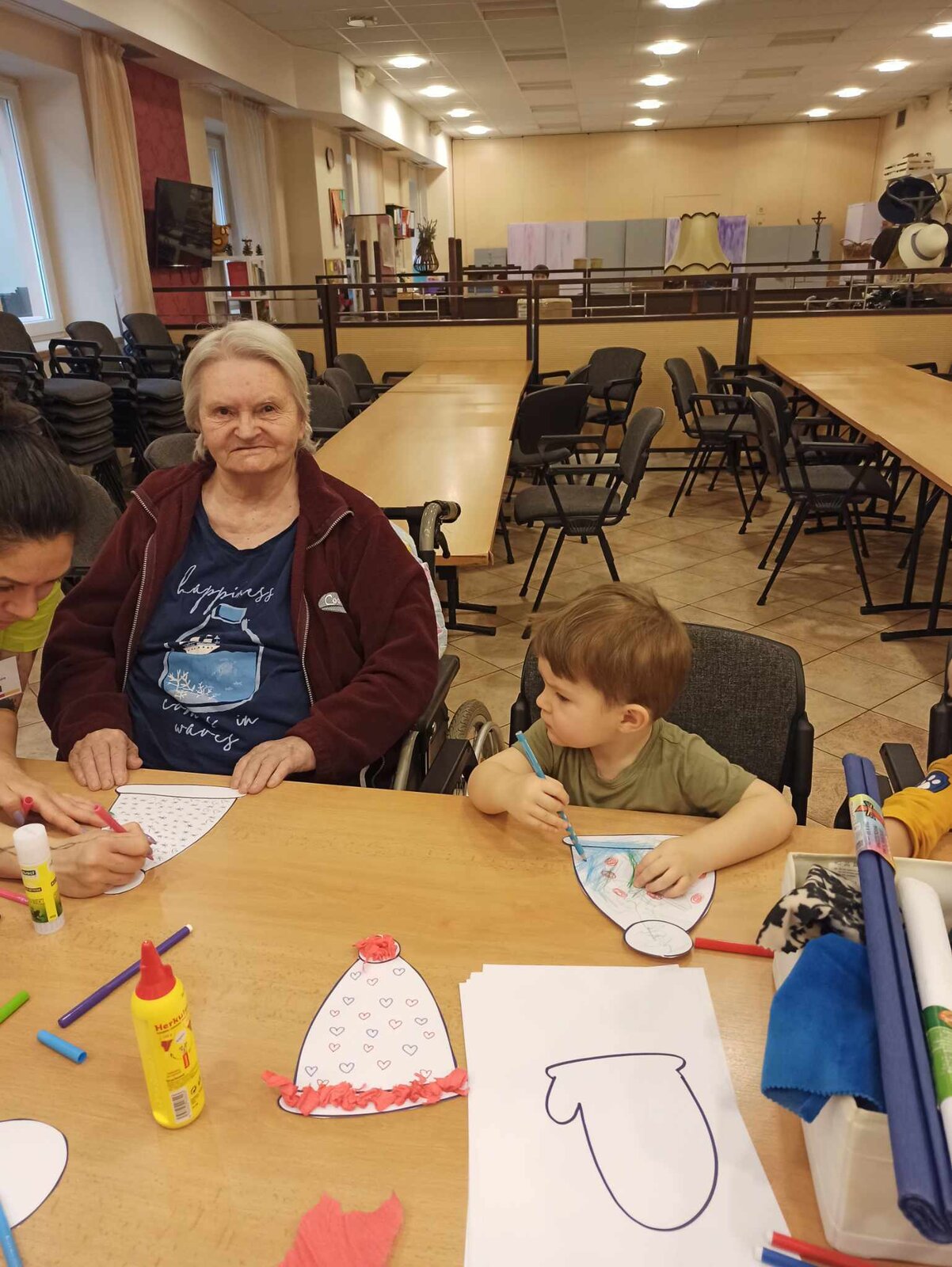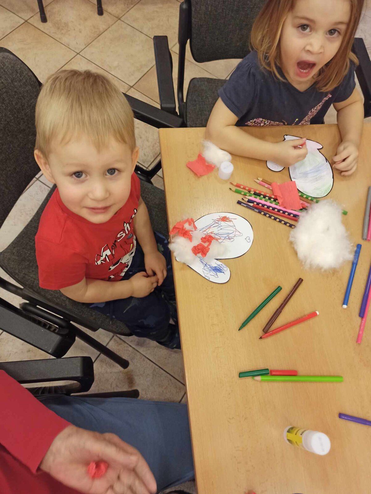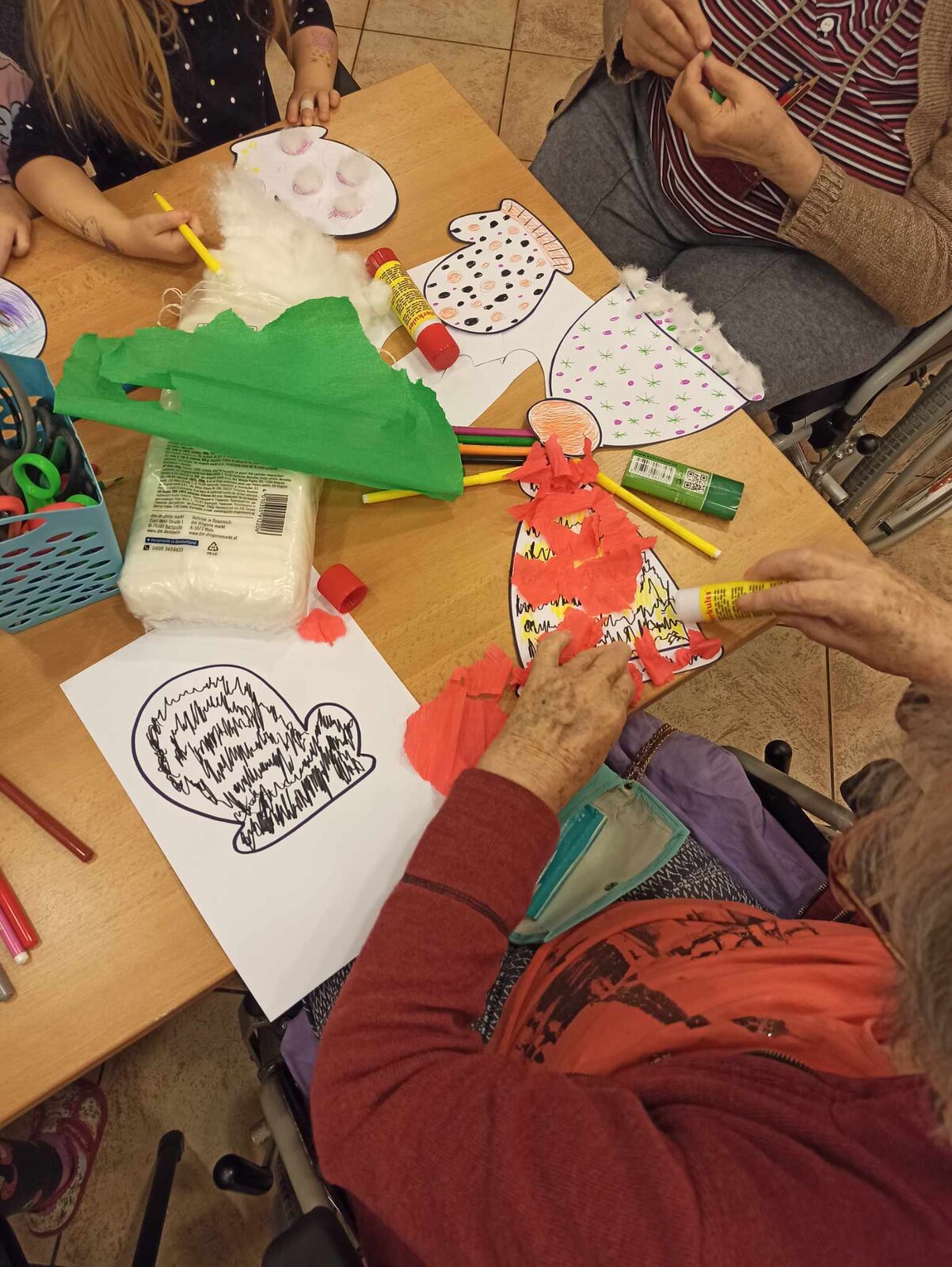 Společně jsme tak vytvořili krásně barevné čepičky a rukavice z krepového papíru a vaty.![]()