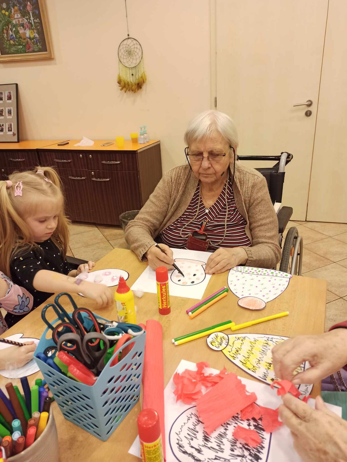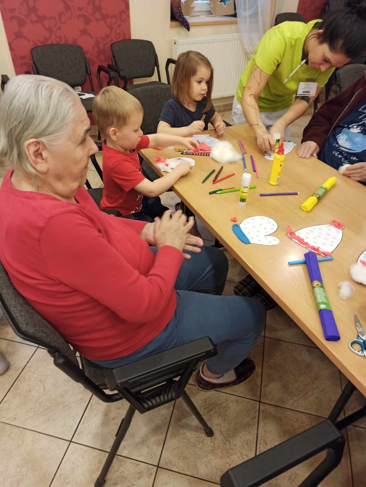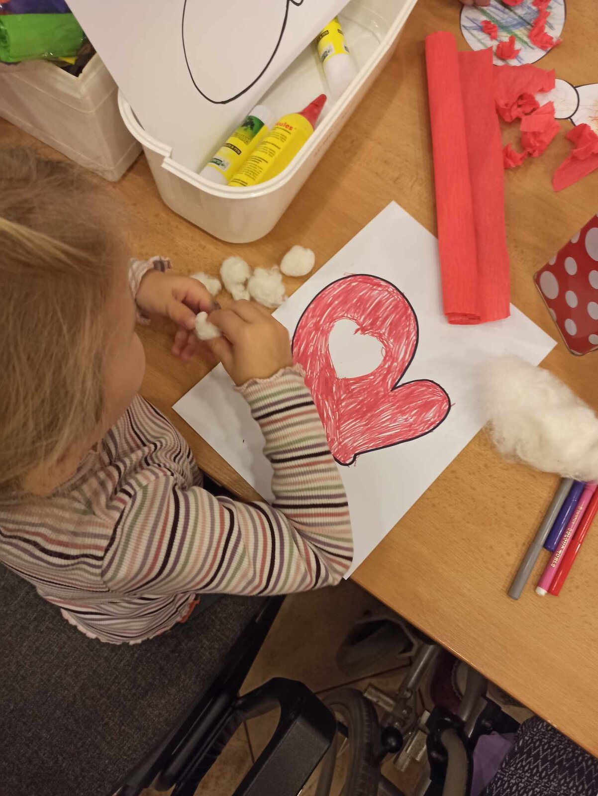 Společně jsme tak vytvořili krásně barevné čepičky a rukavice z krepového papíru a vaty.![]()