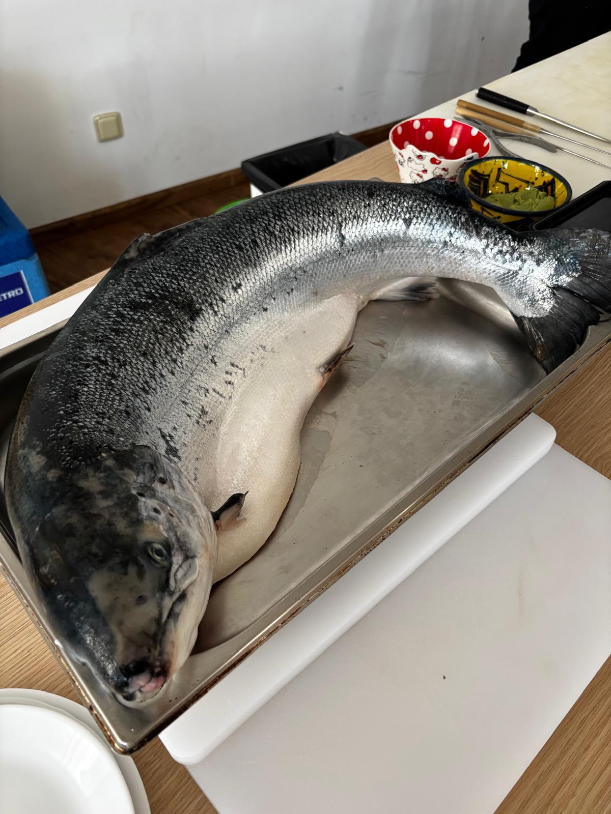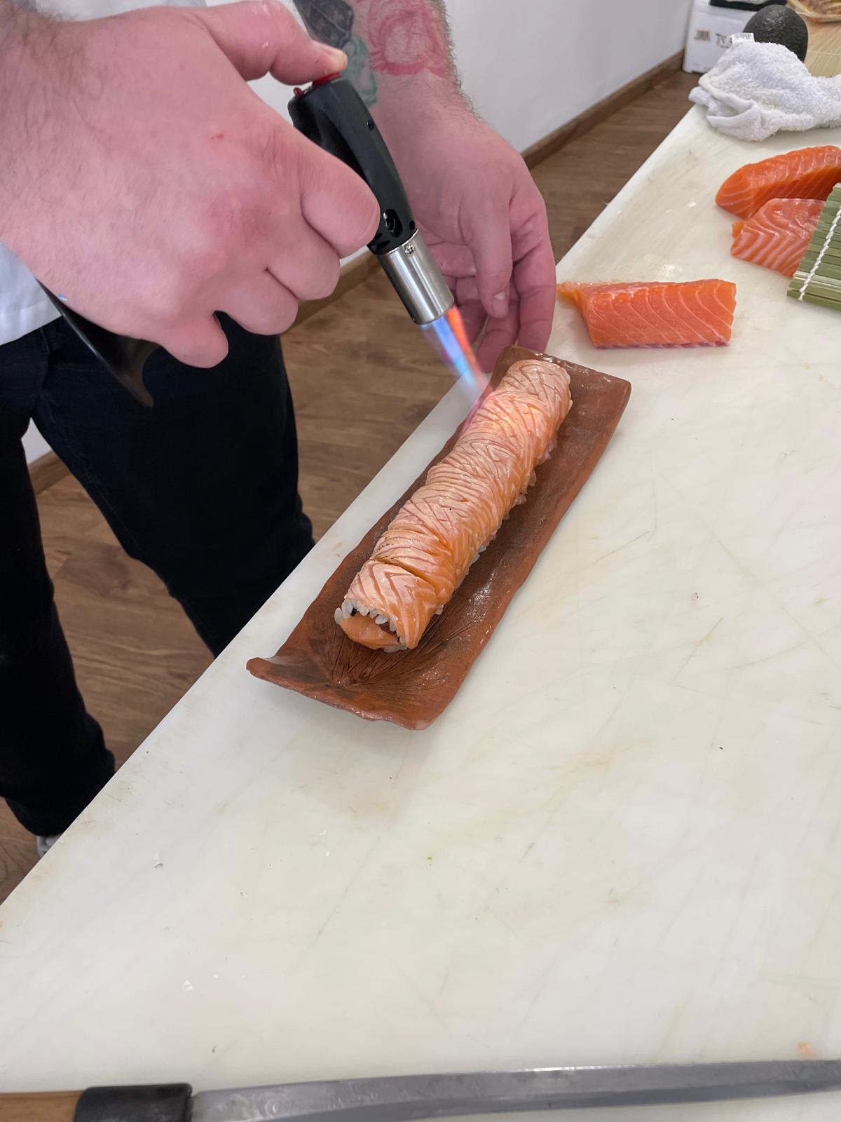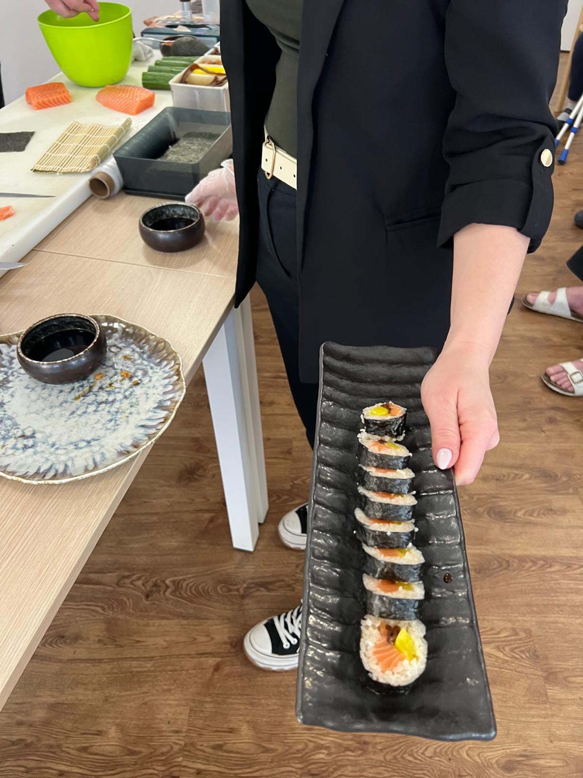 Ukázal nám, jak porcuje celého lososa, vysvětlil jaké ingredience používá, řekl nám i něco o historii sushi a naši klienti měli možnost si i sami rolování a krájení vyzkoušet. Samozřejmě bez následné ochutnávky se to neobešlo!