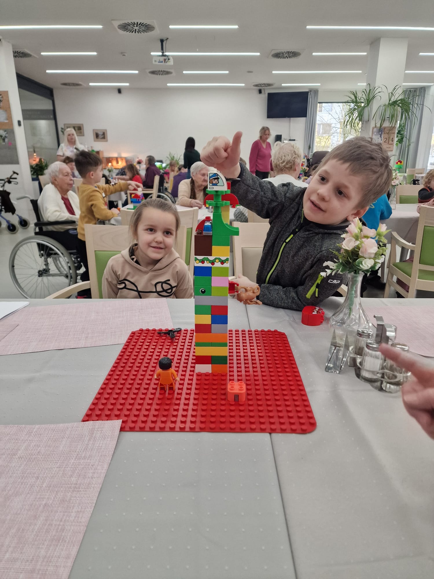 Děti společně se seniory z našeho domova měly splnit několik úkolů. První - postavit co nejvyšší maják a vyprávět dobrý skutek, který sami udělali nebo jehož byli svědkem. Druhý úkol byl postavit z kostiček stroj času a říct, kam by se strojem odcestovali.