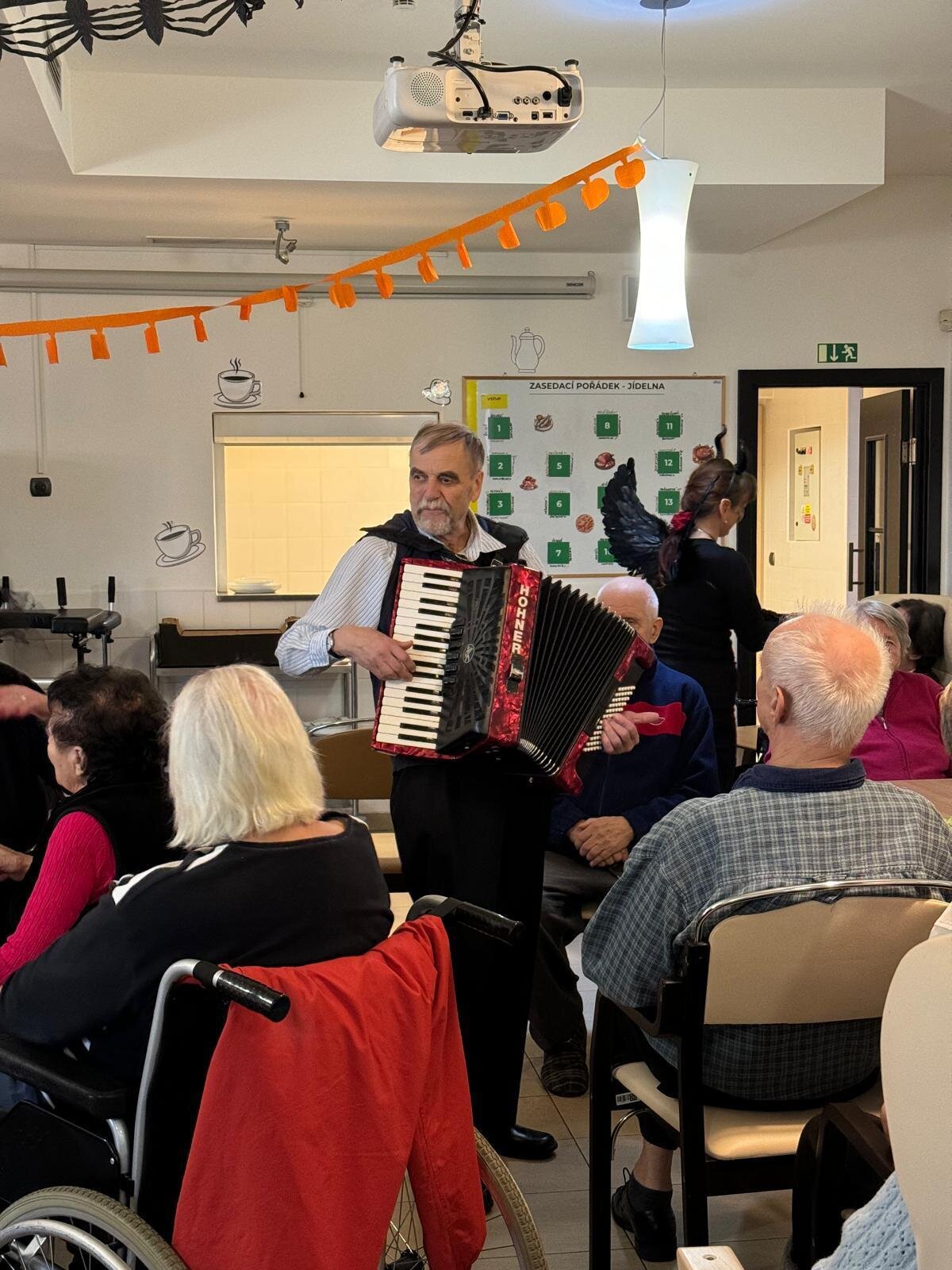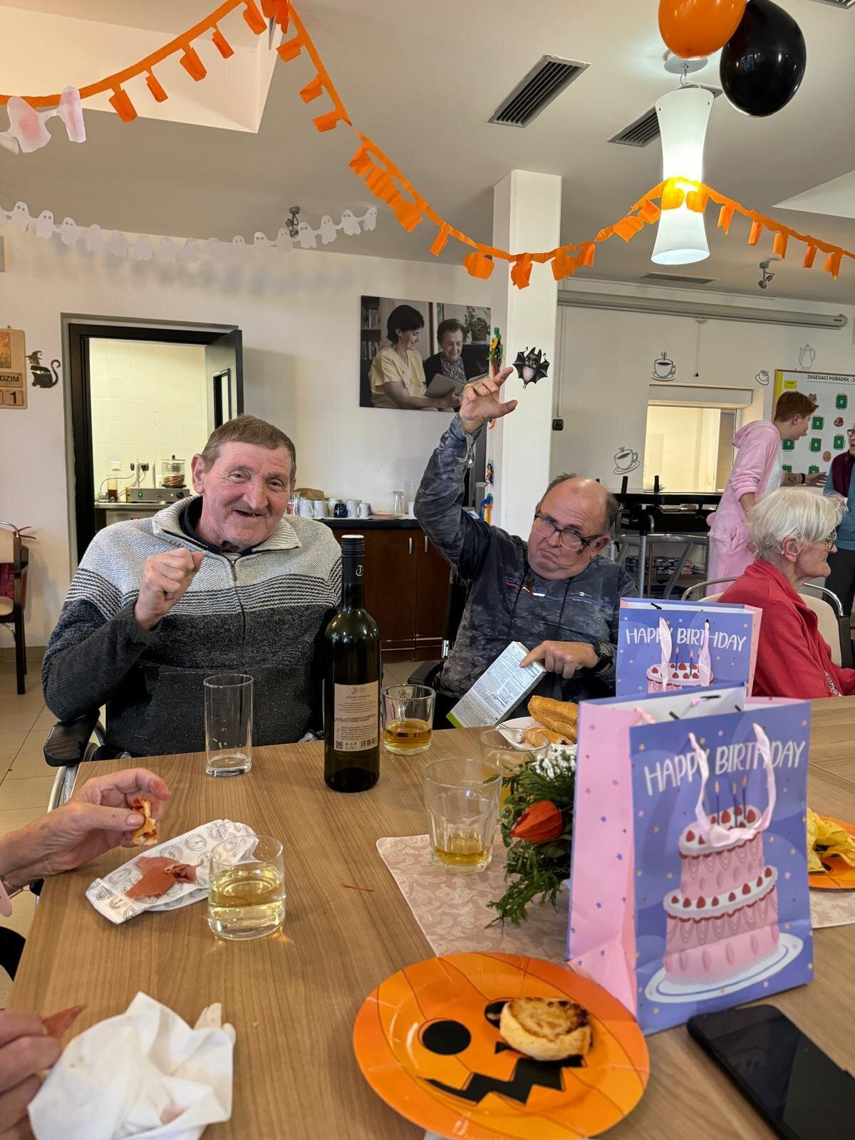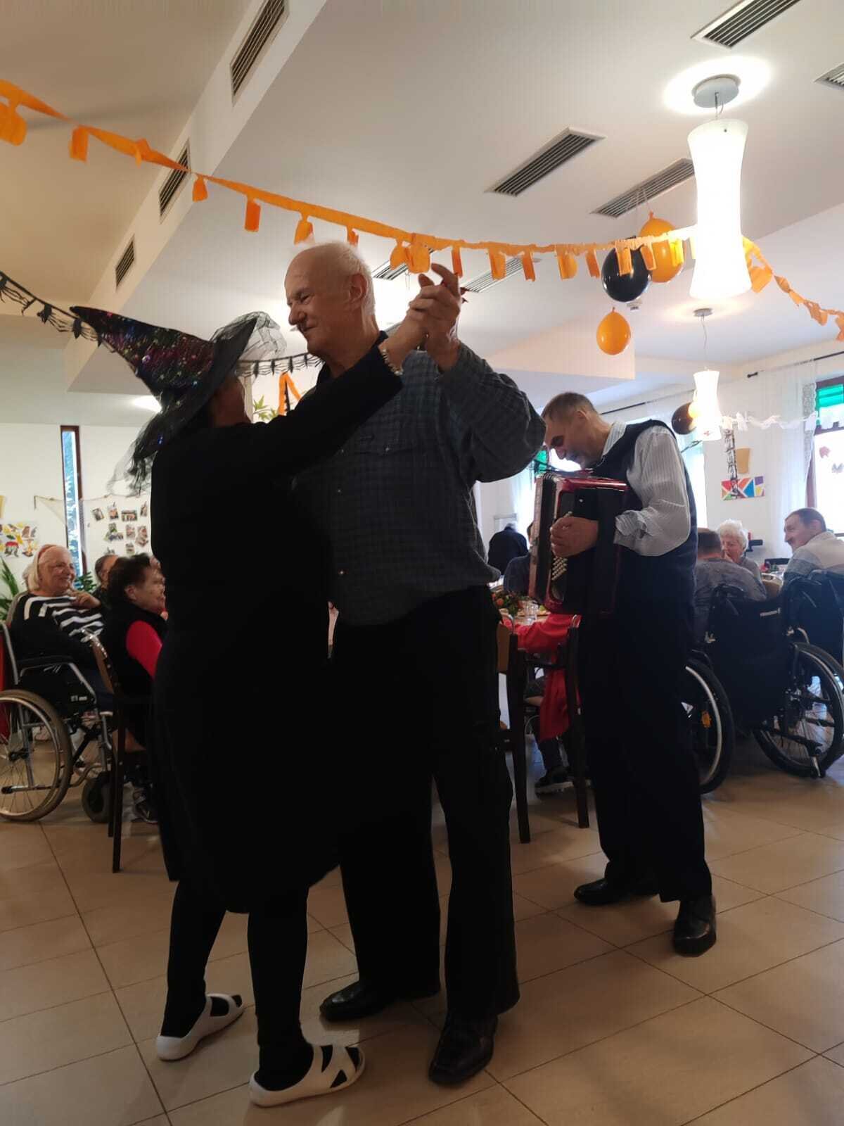 Ve čtvrtek 31.10. se tradičně konala oslava narozenin. Tentokrát nám oslava vyšla přesně na svátek Halloween, při kterém je zvykem převlékání do kostýmů a strašidelná výzdoba. V dopoledních hodinách tak klienti ve spolupráci s aktivizačními pracovnicemi vyzdobili jídelnu. Na odpoledne bylo připraveno pohoštění v podobě párků v rohlíku a naše aktivizační pracovnice Bětka dokonce upekla dort ve tvaru mozku! K poslechu nám po celé odpoledne hrál harmonikář pan Lehotai. Oslava se opravdu moc vydařila!