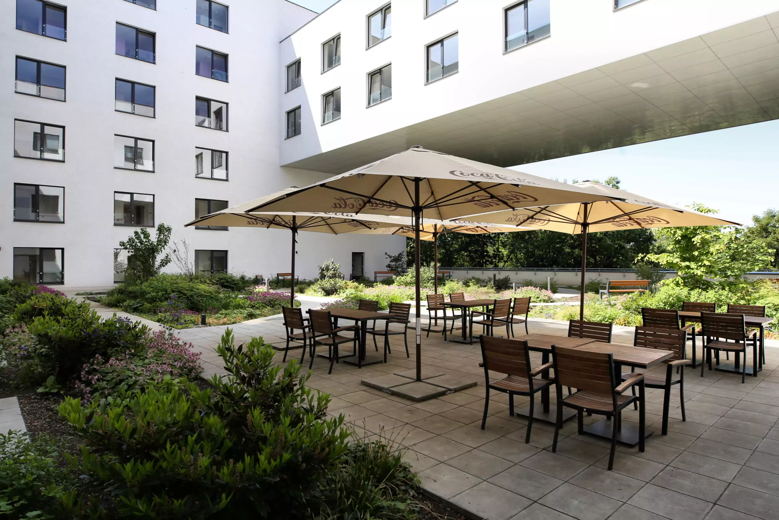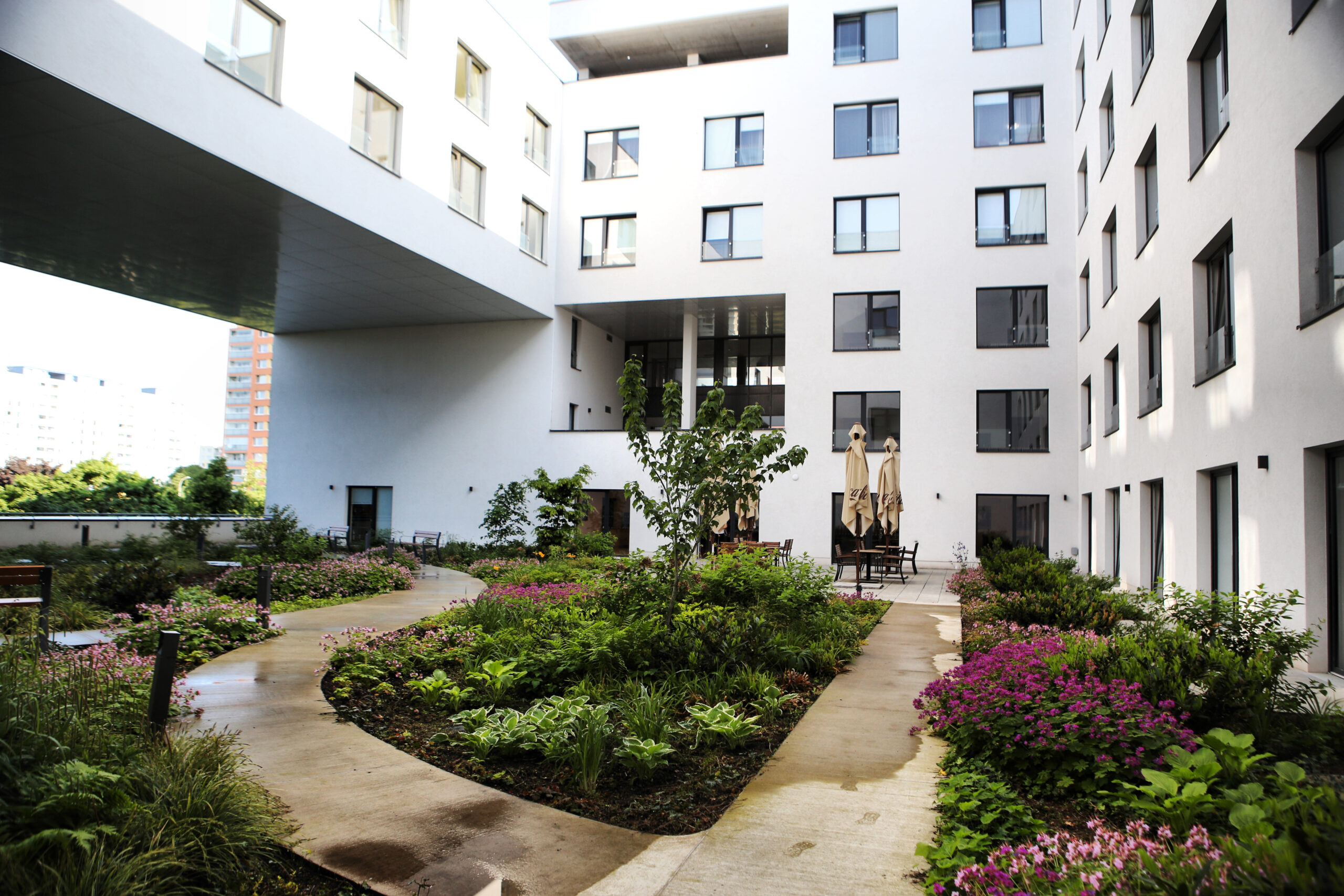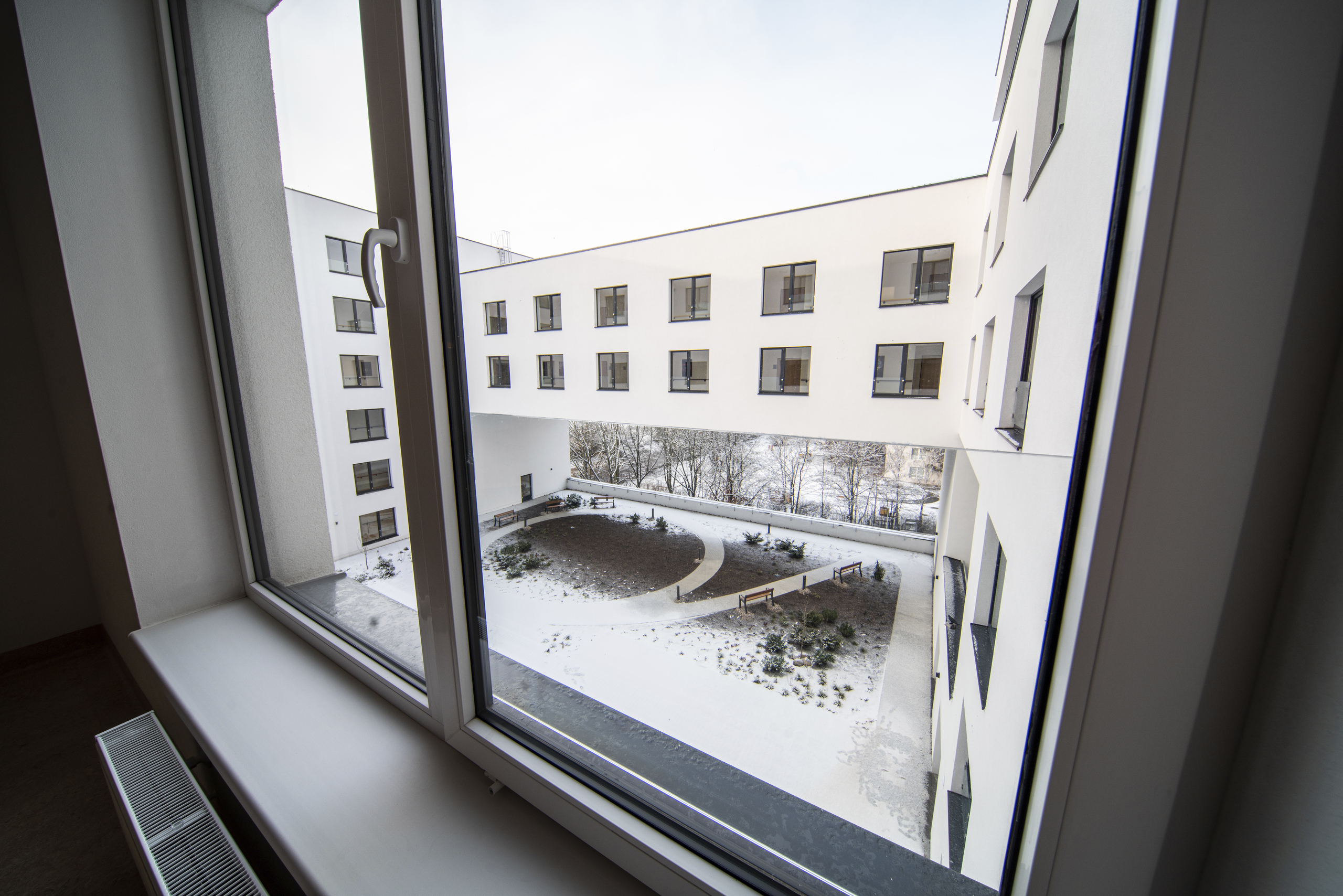 Součástí centra je uzavřené atrium a terasa pro procházky a odpočinek. Celý areál domu pro seniory je plně bezbariérový.
