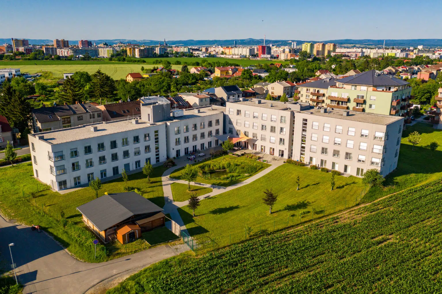 Náš domov se nachází v moderní bezbariérové budově ve tvaru písmene „L“ v klidné městské části Slavonín s výbornou dostupností MHD.