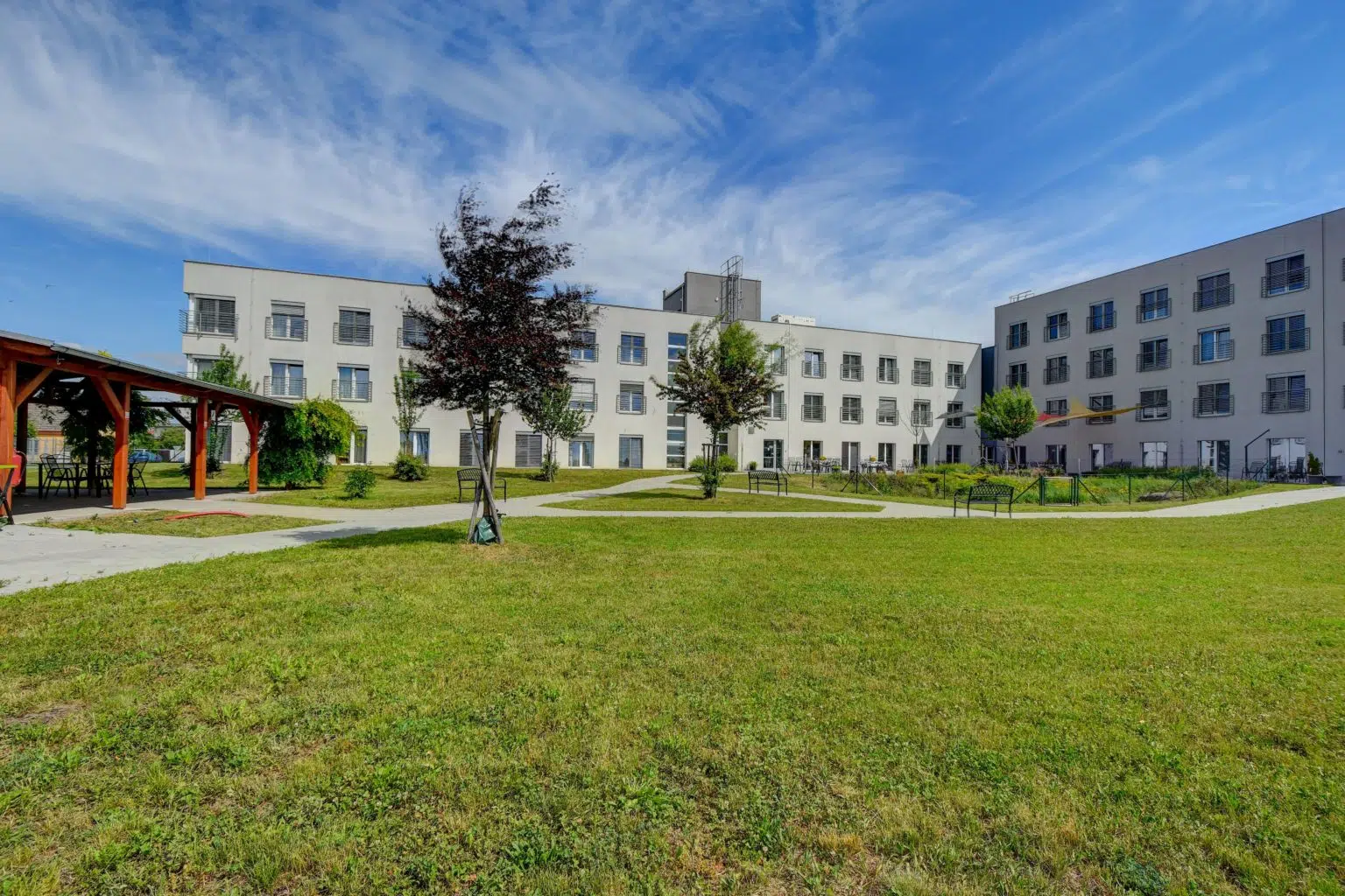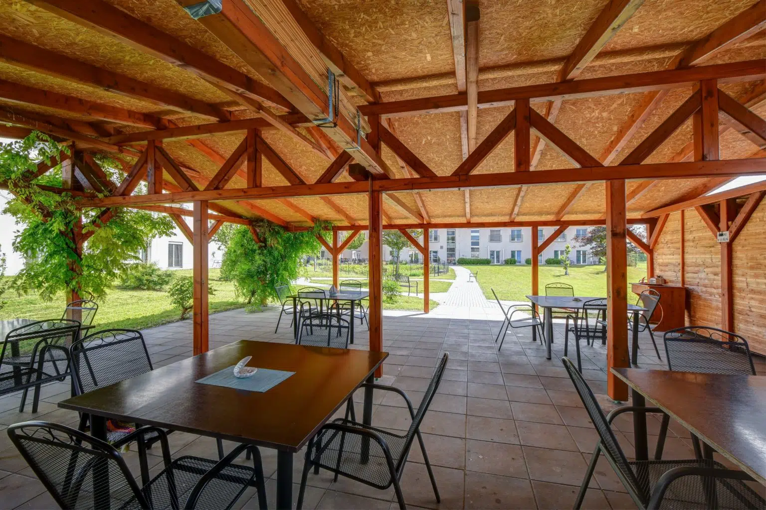 Skutečnou oázou klidu je naše rozlehlá zahrada, která je velmi ceněnou součástí domova. Její dominantou je okrasné jezírko s rybami a prostorný altán, který přímo vybízí k posezení s rodinou či přáteli. Zahrada však slouží nejen k odpočinku, ale i k setkávání. Díky spolupráci s obecně prospěšnou organizací Mezi námi a okolními školami či školkami náš domov pravidelně ožívá dětským smíchem. Tato mezigenerační propojení přinášejí našim klientům novou energii a radost ze života.